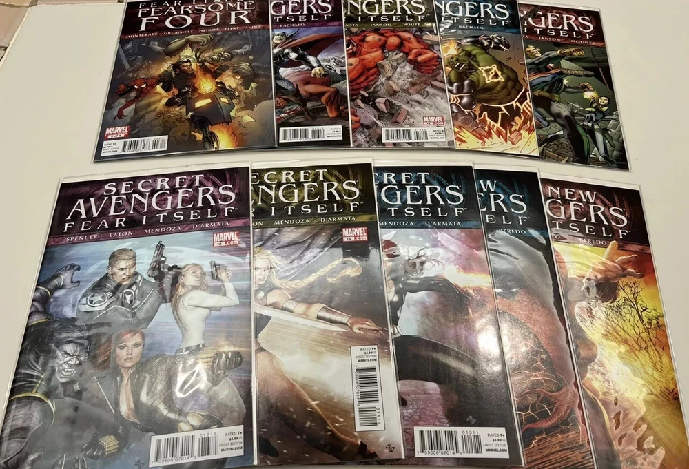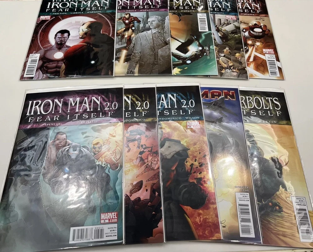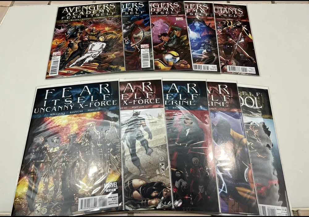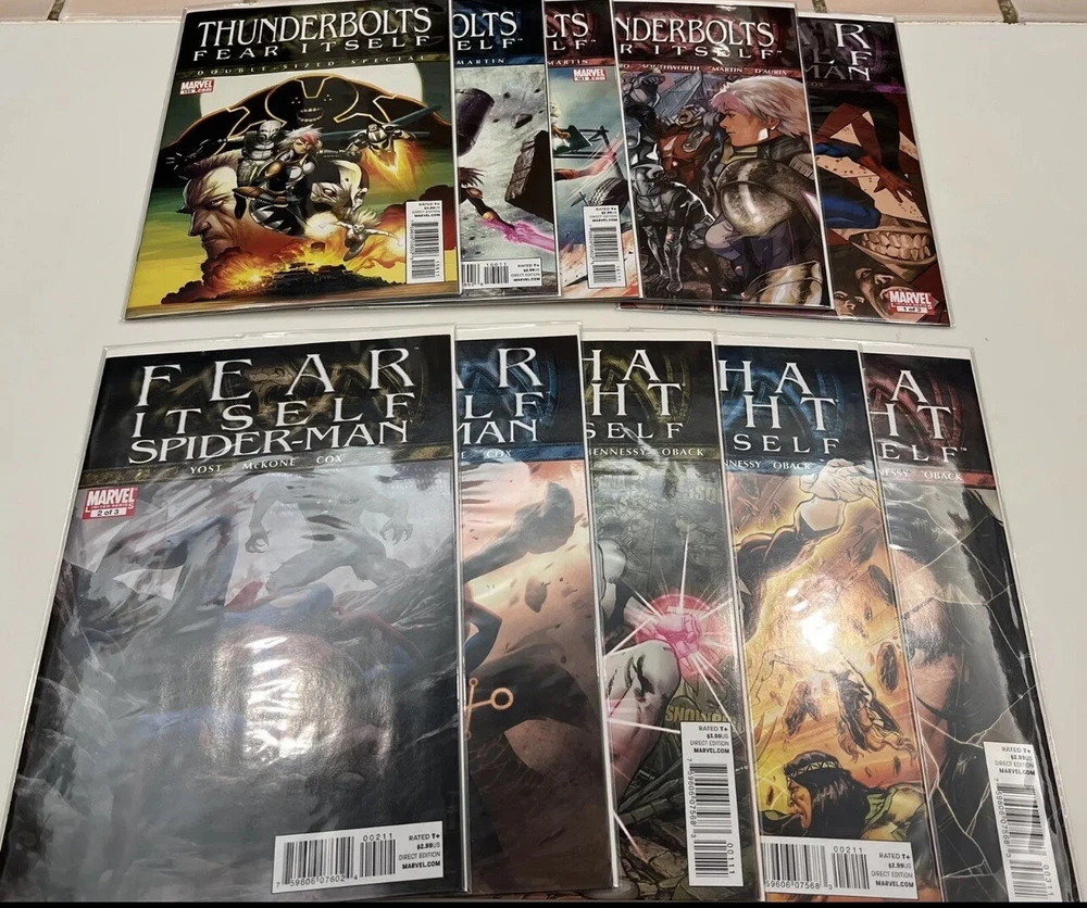 This listing is for a bulk lot of Marvel’s Fear Itself Comic books produced in 2011. It is an incomplete run but there are 80 issues present in total. Several of the sub - series are 1 or 2 issues away from being complete. I am not a grader in any way but these were only read once at time of purchase and then bagged and boarded and stored in a dark closet for several years. I feel that these are all near mint to mint condition. The following issues are included: One Shots: Book of the Skull Sin’s Past Tomb of Dracula: Throne of Blood FF - Future Foundation Black Widow The Worthy Series: Fear Itself 1 - 5 The Home Front 1 - 5 Journey Into Mystery 622 - 626 Youth in Revolt 1 - 3 The Deep 1 - 2 Heroes for Hire 9 - 10 Fearsome Four 1 - 3 Avengers 13 - 16 Secret Avengers 13 - 15 New Avengers 14 - 15 Avengers Academy 15 - 18 New Mutants 29 Uncanny X-Force 1 - 2 Uncanny X-Men 540 - 542 Wolverine 1 - 2 Deadpool 1 - 3 Black Panther 521 - 522 Hulk 37 - 38 Herc 3 - 6 Invincible Iron Man 503 - 507 Iron Man 2.0 5 - 7.1 Thunderbolts 158 - 162 Spider-man 1 - 3 Alpha Flight 1 - 3 The items are pictured are what you will receive and come from an adult collector in a smoke free home. Please feel free to contact me with any questions you may have. Thanks for looking.
