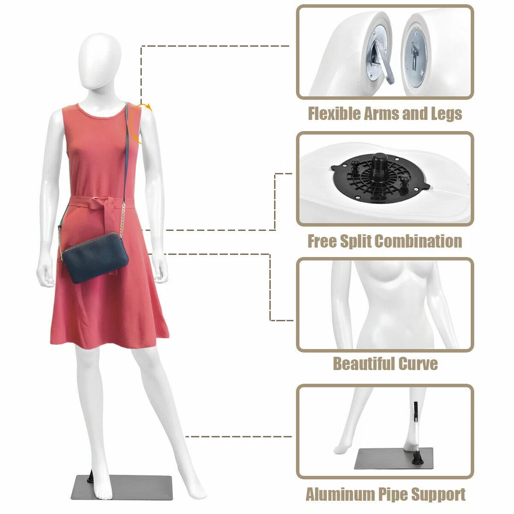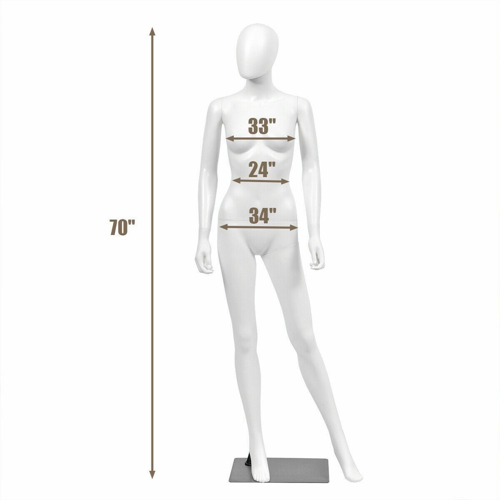 Package includes: 1 x Female mannequin Color: White Main Material: PP Plastic, Aluminum, Iron Height: 5.8 Ft Measurement: 33" x 24" x 34" Base dimension: 17" W x 12"D Weight: 18Lbs Our Female mannequin is perfect to fit all sophisticated clothing stores and studios. Its genuine pose precisely mimics the attractive look of modern real man. Featuring Plastic body and aluminum stent, this female mannequin is durable for long term use. Designed to keep your fashions up to date, this female mannequin is easy to dress as styles change featuring detachable arms, hands, and torso. 5.8 ft female mannequin Durable aluminum stent and high quality plastic body Detachable arms, hands, and torso, making dressing and undressing really easy Rectangular Iron base offers stability Easy for assembling Package includes: 1 x Female mannequin Color: White Main Material: PP Plastic, Aluminum, Iron Height: 5.8 Ft Measurement: 33" x 24" x 34" Base dimension: 17" W x 12"D Weight: 18Lbs