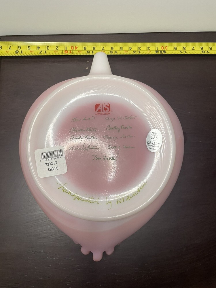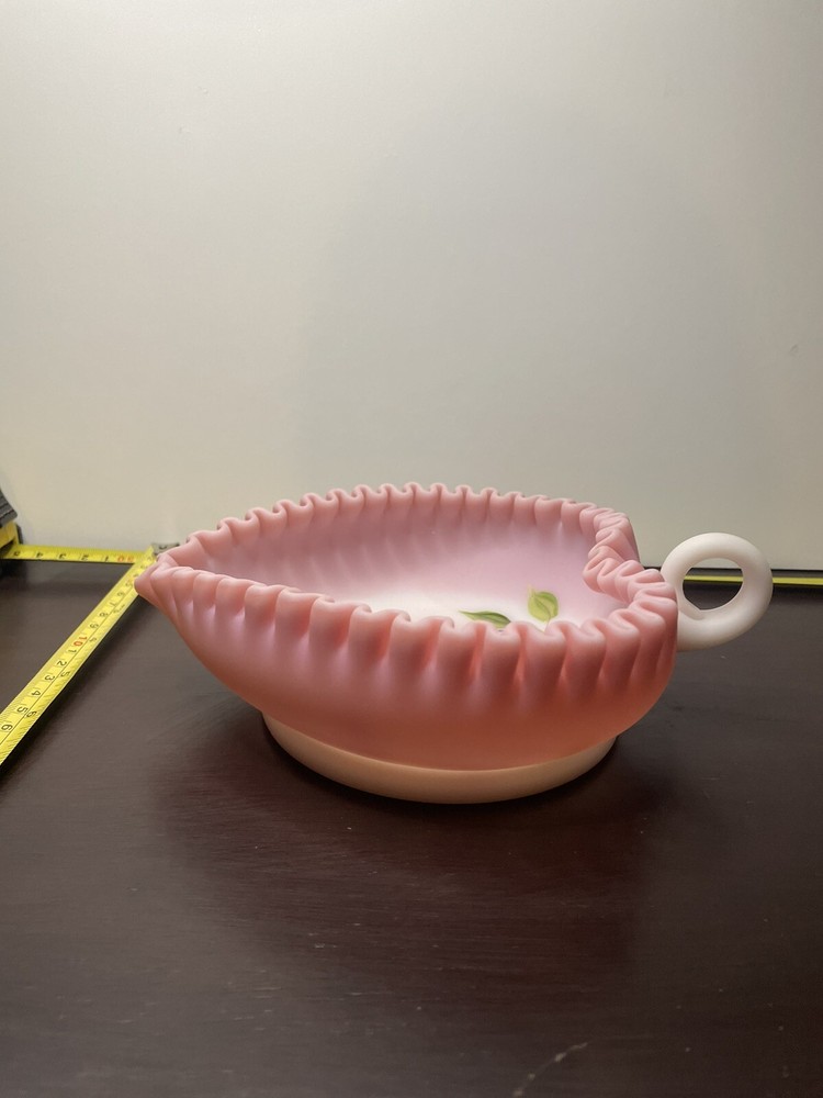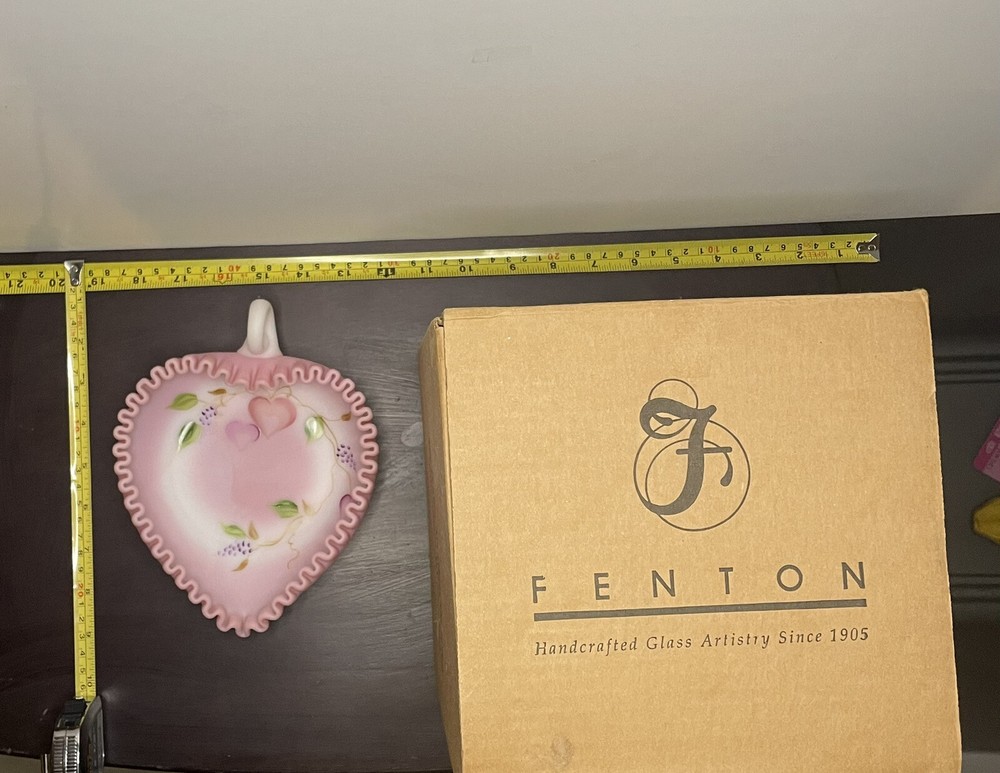 This gorgeous handmade Fenton dish is a dreamy blend of elegance and charm! The delicate pink Rosalene satin glass catches the light beautifully, while the heart shape and grape motifs add a romantic vintage touch. Perfect for displaying trinkets or just admiring as a statement piece—love the crimped rim and artist signature details. It instantly elevates any space with its feminine, cottagecore vibe. A must-have for collectors or anyone who adores unique, high-quality art glass!