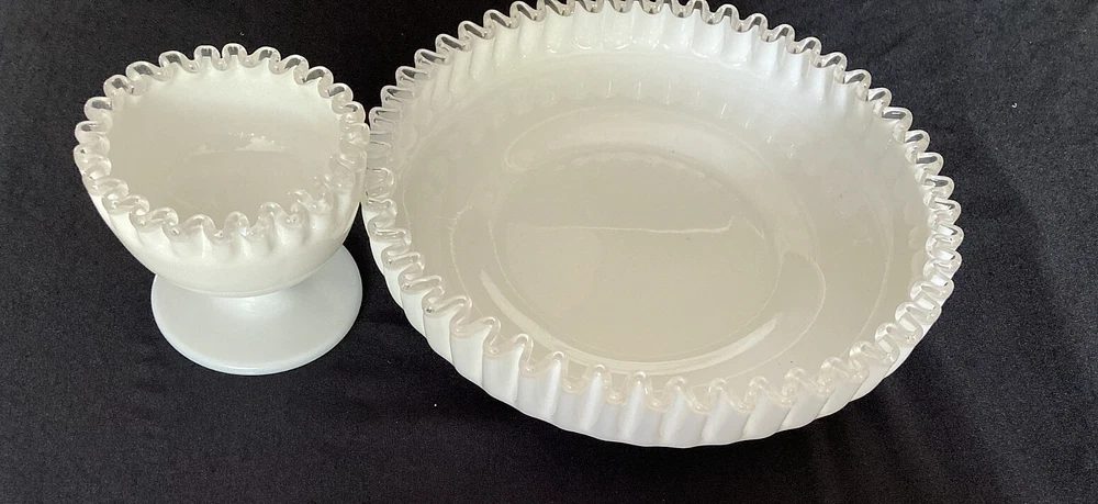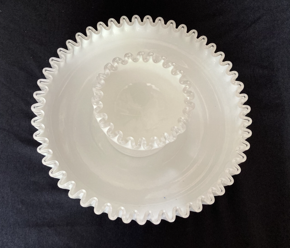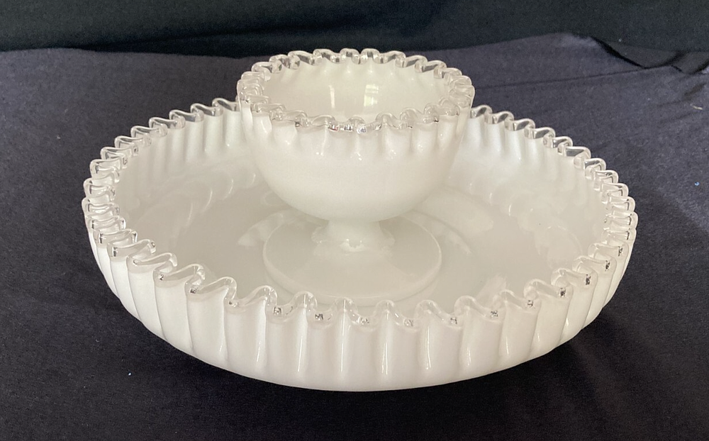 Listed is a Fenton Art Glass Silver Crest chip and dip set. This is the large one 13 1/4" wide. It is in excellent condition. And would be a great addition to your Silver Crest collection...