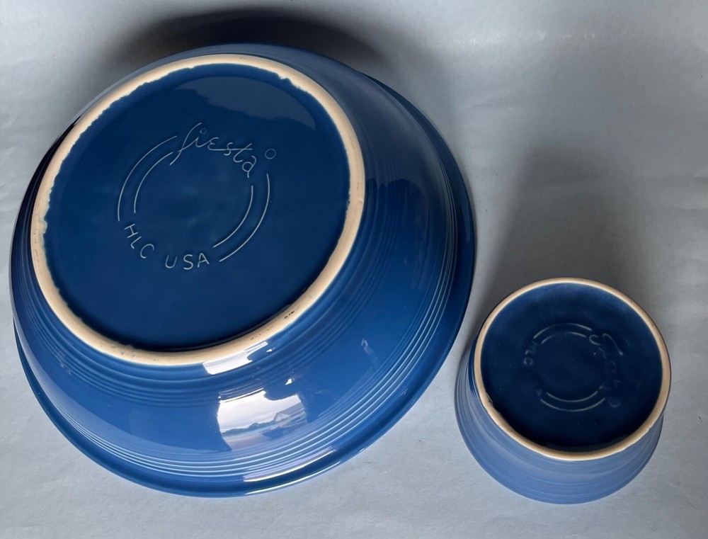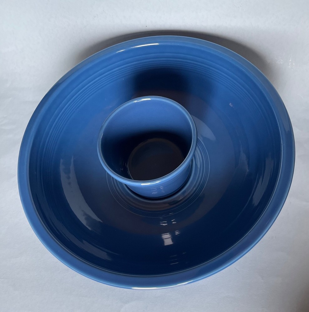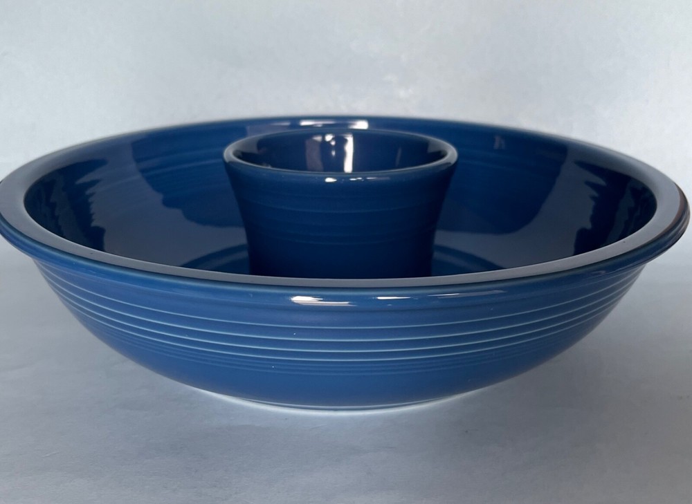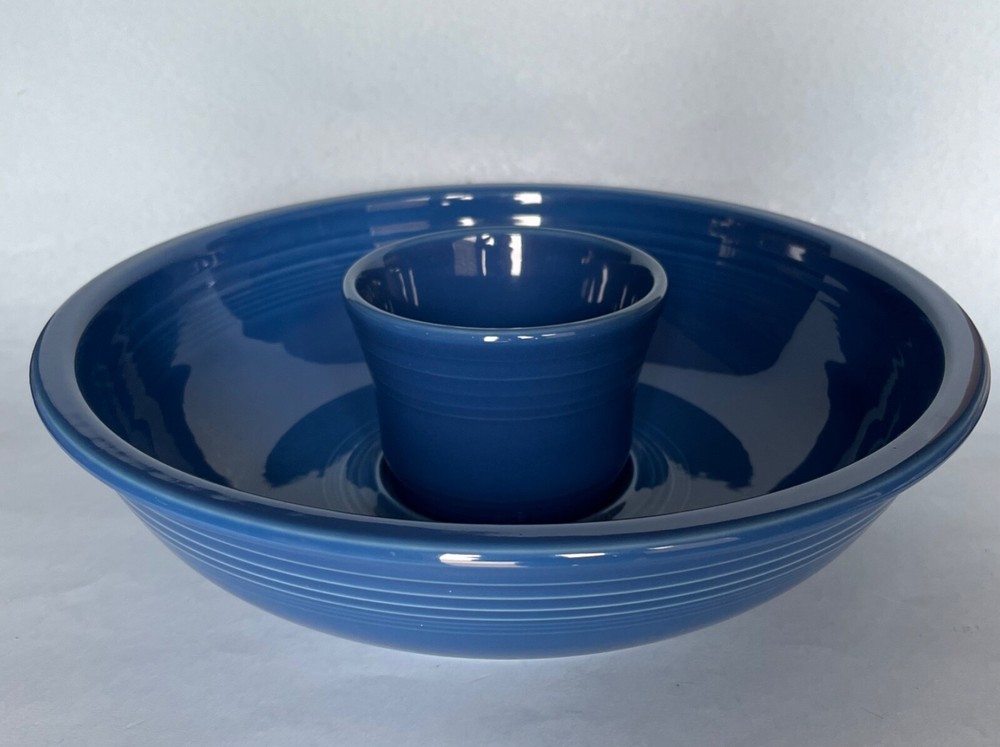 Fiesta LAPIS Blue Chip and Dip Set. The generously sized Chip Bowl is 12 7/8" and the separate Dip Bowl is 4 5/8" (17oz.) and sits perfectly nestled in a ridged well inside the Chip Bowl. New, never used, excellent condition. This set retails for $69.99 so this one is a bargain. Set contains: Chip Bowl Diameter 12 7/8" Height 3 1/8" Holds 129 Ounces Dip Bowl Diameter 4 5/5" Height 3 1/4" Holds 17 Ounces Please check my other listings and feel free to message me with any Fiesta requests. I have a ton of new Fiesta inventory to sell. Like new, in great condition, never been used. ****** Please note: Most Fiesta pottery items have some very minor factory imperfections such as tiny sand bumps or pin pop flaws. Please feel free to ask questions if you are concerned or want precise descriptions of each one. White spots are glare and not on the items. Fiesta is made in the USA and is lead-free, microwave and dishwasher safe. Please check my other listings for other great Fiesta items. Let me know if there is something in particular you are looking for and I'll list it if I have it. Thank you!