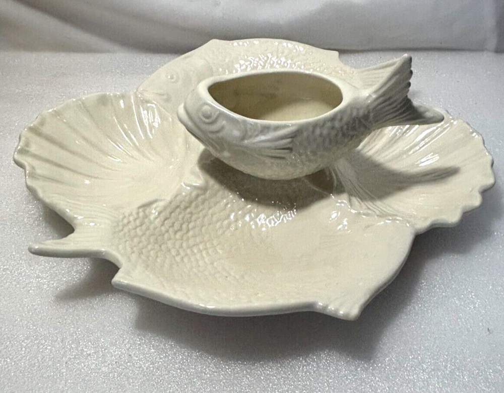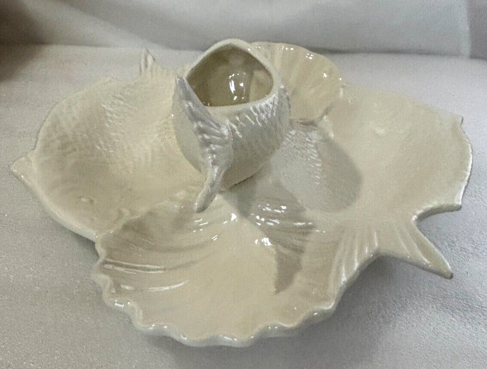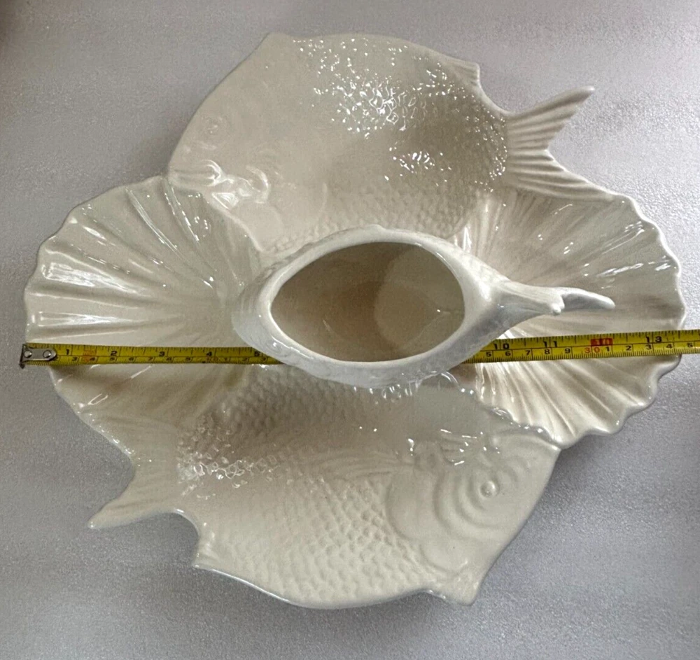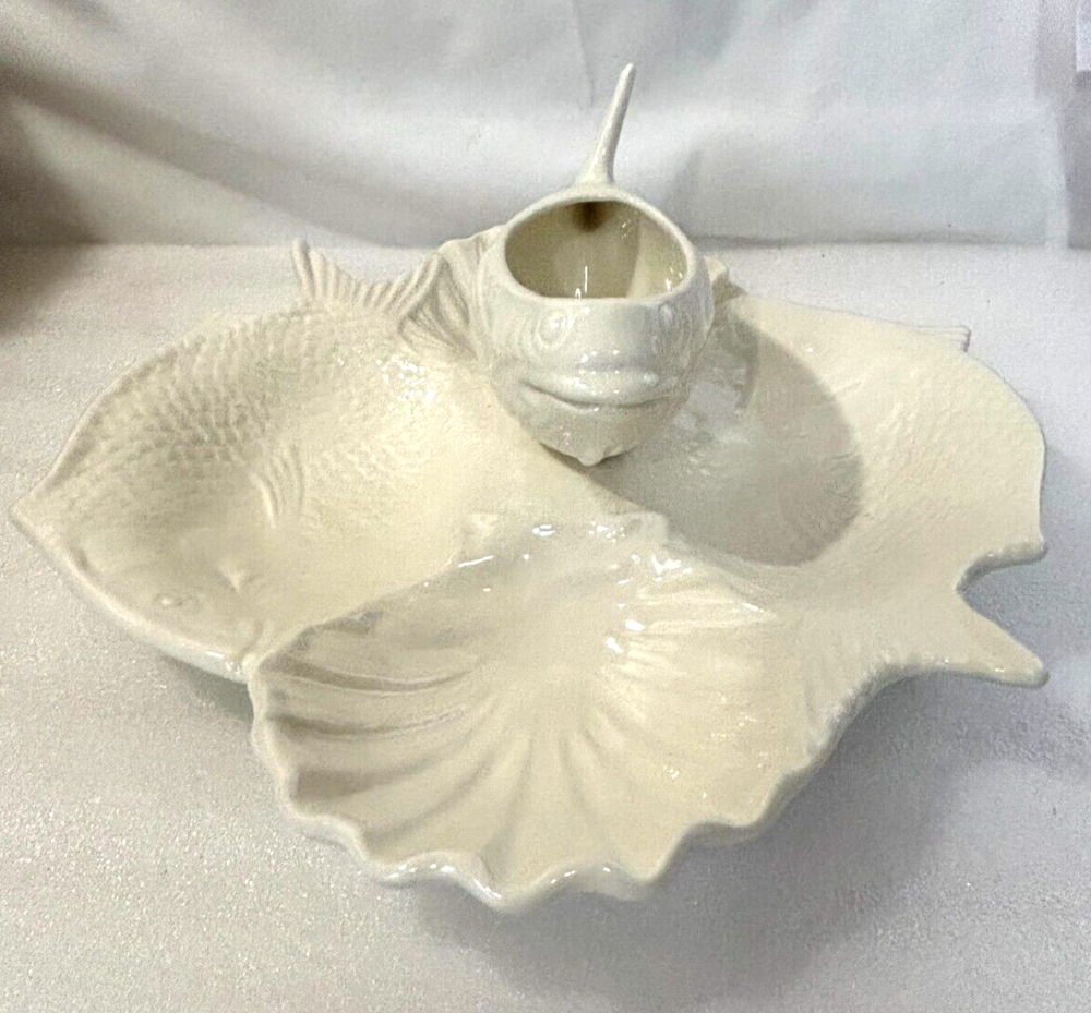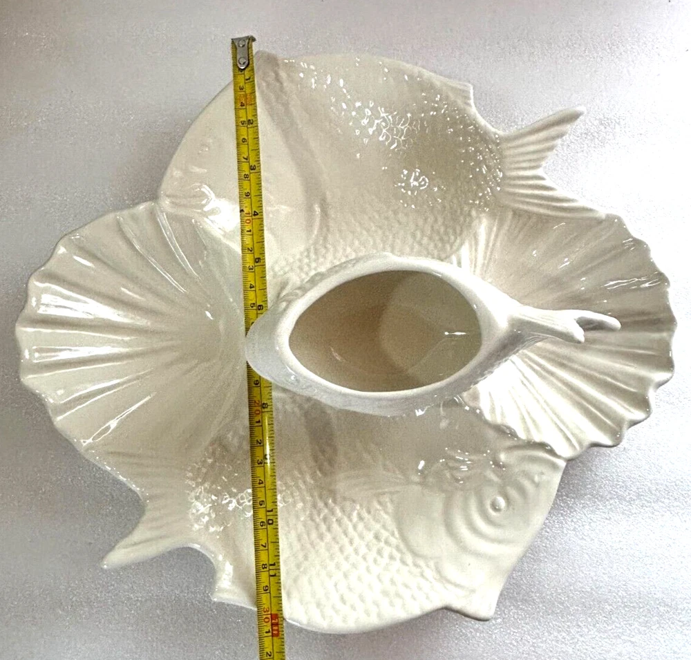Fish and Shell Divided Chip and Dip Bowl Platter ~ Large 14" X 13". This large chip & dip platter is in excellent condition with no defects or damage noted. It has 5 compartments that could hold just about any type of food, chip, or dip imaginable. It would be great for a fish themed party or a party near the ocean or lake, or for fishy flavored foods and dips. See photos for a better description of condition and for dimensions. Shipped via your choice of USPS Ground or Priority Mail.