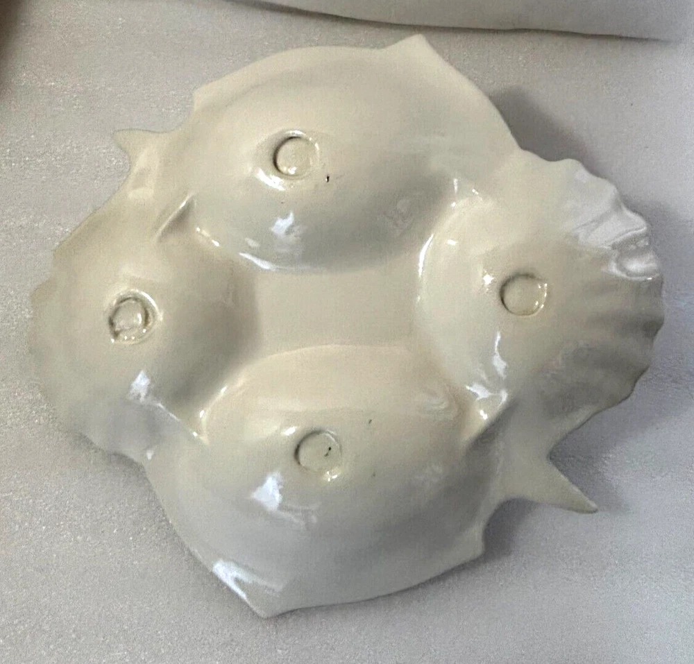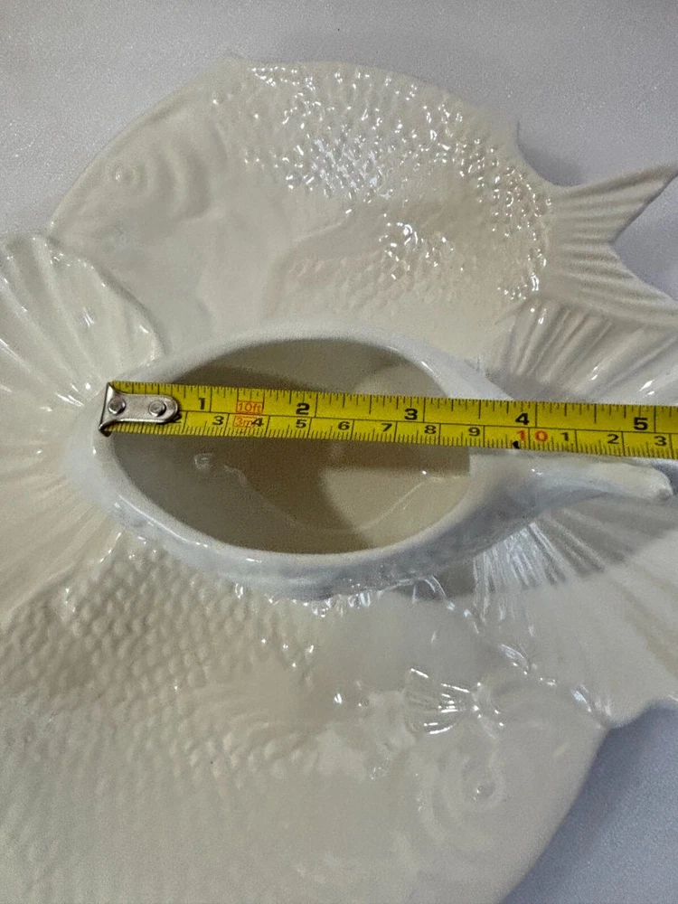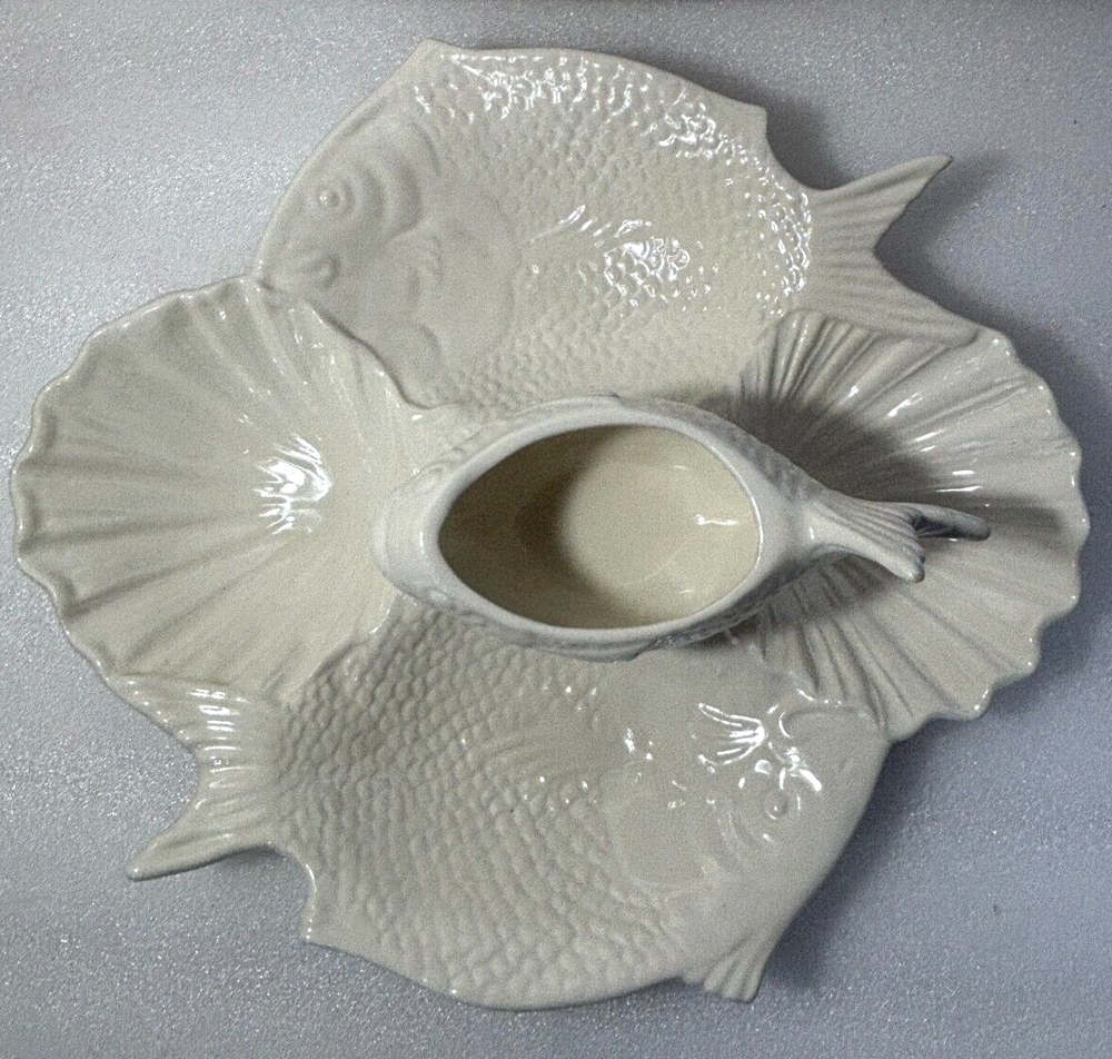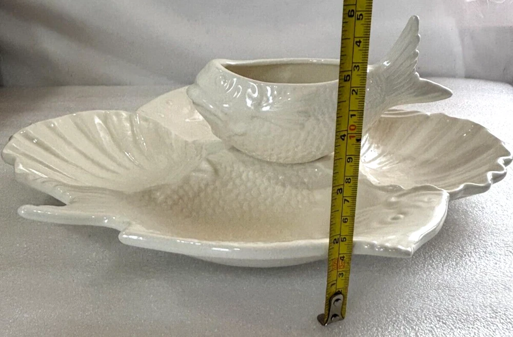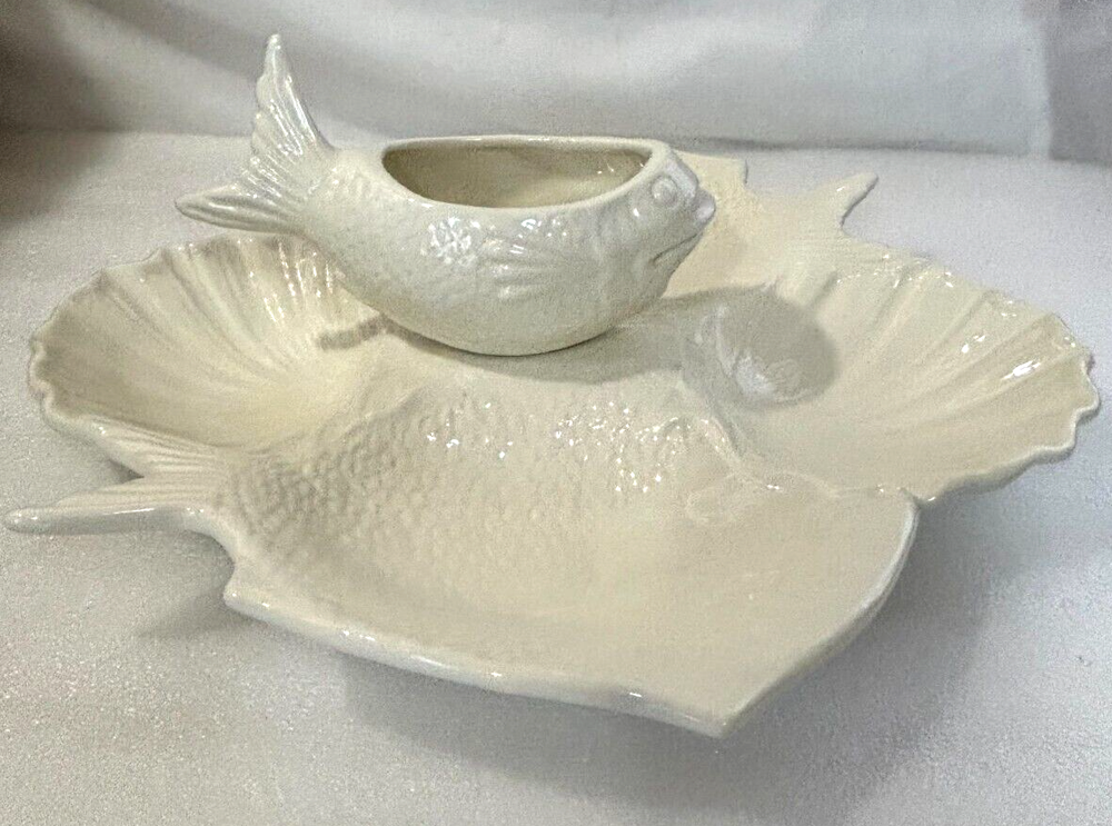 Fish and Shell Divided Chip and Dip Bowl Platter ~ Large 14" X 13". This large chip & dip platter is in excellent condition with no defects or damage noted. It has 5 compartments that could hold just about any type of food, chip, or dip imaginable. It would be great for a fish themed party or a party near the ocean or lake, or for fishy flavored foods and dips. See photos for a better description of condition and for dimensions. Shipped via your choice of USPS Ground or Priority Mail.