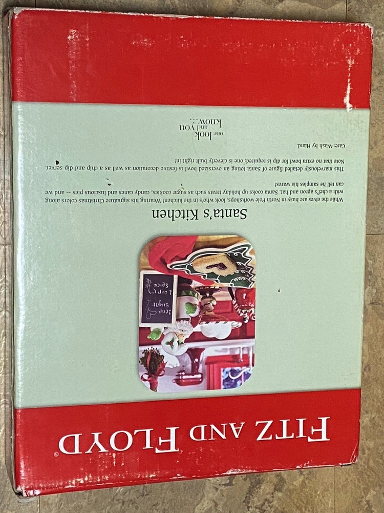 Fitz & Floyd Santa's Kitchen Large Chip & Dip Plate Dish NEW new in box; box shows wear dated 2005 I try to describe my items as honestly and accurately as possible but it is impossible to be an expert in all realms of collecting. Please be a responsible bidder and examine the photo and read the description. I may inadvertently omit information that you as a collector feel is important. Please e-mail me with any questions you may have PRIOR to bidding. Shipping: Calculated based on zip code within the USA. Rates to Canada and the rest of the world are higher - please contact seller for a shipping quote outside of the USA . We ship Monday-Friday. International Buyers – Please Note: Import duties, taxes and charges are not included in the item price or shipping charges. These charges are the buyer's responsibility. Please check with your country's customs office to determine what these additional costs will be prior to bidding/buying. Feedback: Our feedback is important to us - please contact us with any problems you may have BEFORE leaving feedback. We will do our best to work with you - negative/neutral feedback is not a solution. Fine Print: All items are sold AS IS. All Sales are final. _gsrx_vers_1652 (GS 9.7.4 (1652))