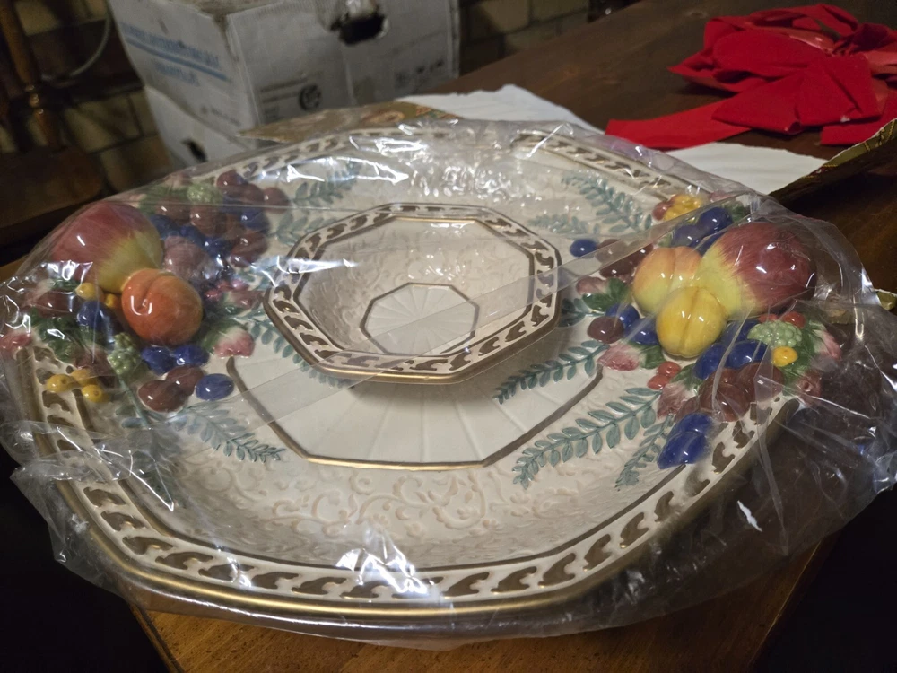 This Fitz & Floyd Vegetable and Dip Tray is the perfect addition to any kitchen or dining room. Crafted with high-quality materials, this tray is both durable and stylish. The tray features a beautiful design that is sure to impress your guests, making it the perfect choice for serving vegetables and dips at your next dinner party. With its sturdy construction and ample space, this tray is perfect for serving a variety of dishes. The tray is easy to clean and maintain, making it a practical choice for everyday use. Whether you're a collector of Fitz & Floyd items or simply looking for a high-quality tray, this Vegetable and Dip Tray is sure to impress.
