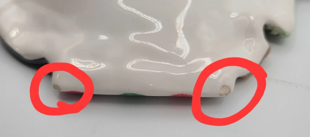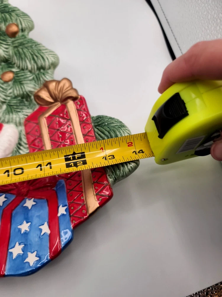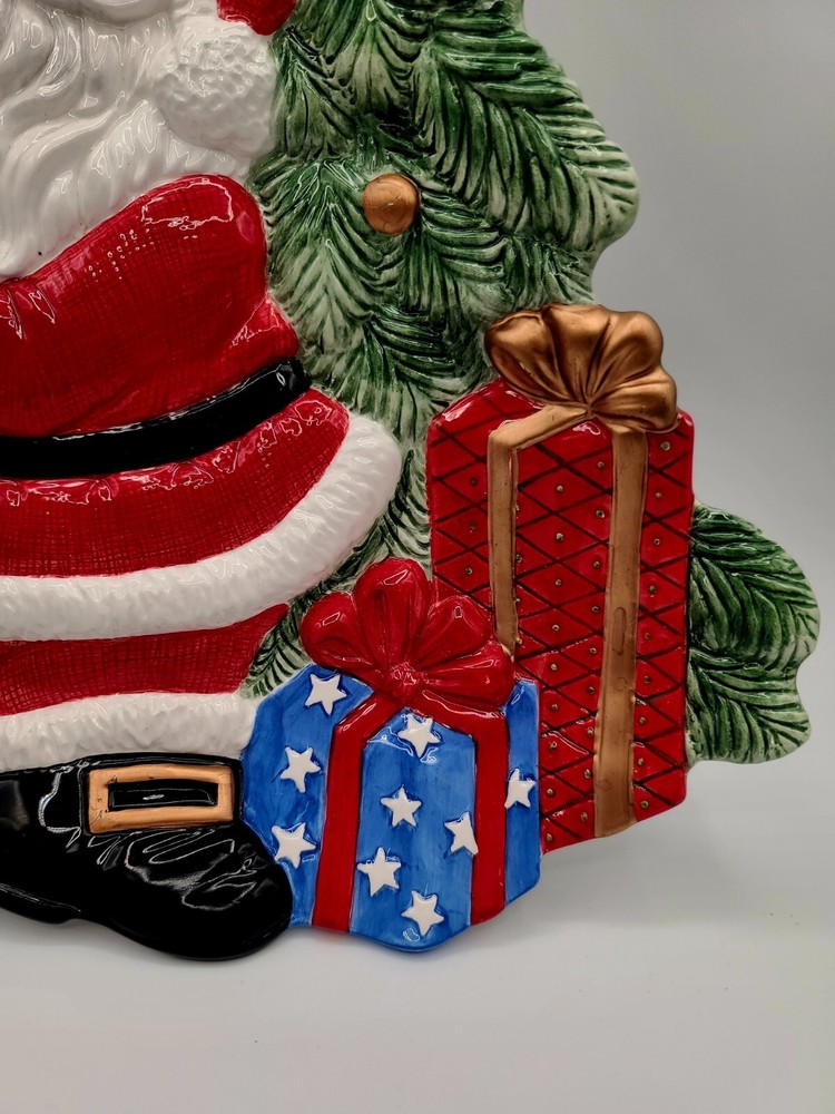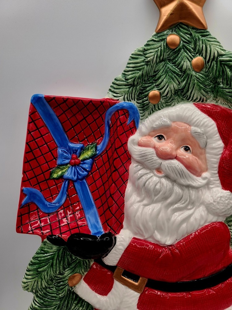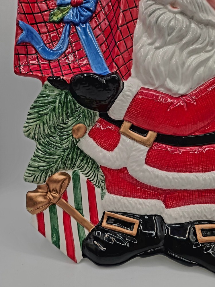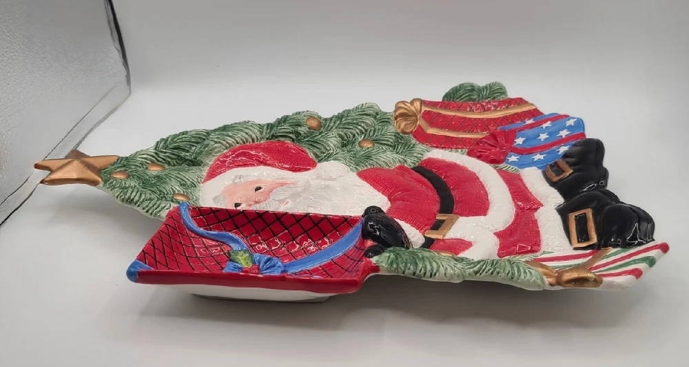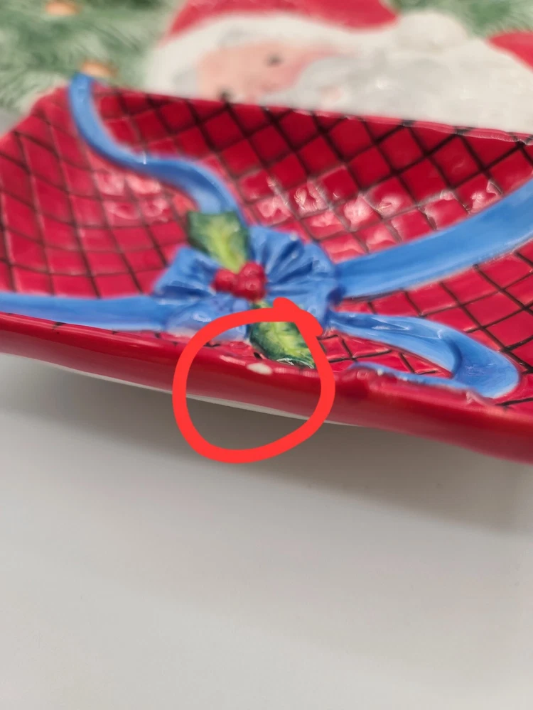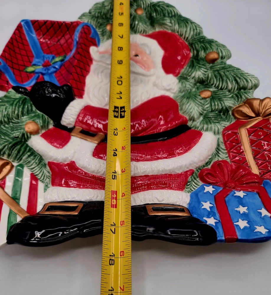 This festive Fitz and Floyd Santa Claus serving tray is perfect for your holiday gatherings. Measuring 17.5 inches in length and 12 inches in width, this ceramic tray features a cheerful Santa Claus surrounded by a beautiful multicolor design. It's ideal for serving snacks, dips, or desserts to your guests with its 2-inch height and glossy finish. The tray is easy to clean with a damp cloth, and no additional parts are required. This serving tray is a great addition to any room and is suitable for any occasion. Bring some holiday cheer to your home with this Fitz and Floyd Santa Large Serving Tray Dish. Condition: There are 2 small chips on the bottom underside (can not be seen when on display) and one tiny chip on the edge of the dip bowl that's shaped like a gift. See last 3 photos and I have circled the flaws in red. Other than that... in overall excellent condition. If you collect F+F; you know how fragile these beautiful pieces can be... almost impossible to not have a chip somewhere. Smoke Free Home. POLICY: Offers are encouraged and reasonable offers are usually accepted. ***PLEASE READ DESCRIPTION ALL THE WAY THROUGH. IT IS THE BUYERS RESPONSIBILITY TO DO THEIR RESEARCH AND ASK ANY QUESTIONS**** PLEASE ZOOM IN AND REVIEW ALL PHOTOS CAREFULLY. I DO MY VERY BEST TO PHOTOGRAPH AND DEPICT THE ITEM IN THE CONDITION/COLOR AS DESCRIBED. HOWEVER, I'M HUMAN AND NOT A PROFESSIONAL PHOTOGRAPHER... SO PLEASE KNOW IT WOULD NEVER BE INTENTIONAL SO JUST MESSAGE ME. SHIPPING & HANDLING: Packaging: As you can see by my reviews, I do VERY careful packaging of fragile items I ship. Your Address - Please be sure that your correct and current address is on file with eBay, as we can only ship to the address on file. Handling Time - Our handling time is set to THREE BUSINESS DAYS. We ship packages Monday - Friday, with the exception of holidays AND MOST GO OUT SAME DAY. Calculated Shipping- Our shipping fees are calculated based on weight and dimensions. We ship USPS and UPS depending on cost. Insurance - All PRIORITY items are shipped with insurance. PAYMENT Payment - Payment is expected at the close of auction unless an agreement is made prior to auction close. Non-Paying Bidders - Unpaid item cases are opened after two days of non-payment. Non-paying bidders are blocked from future transactions. Canceled Transactions - If a winning bidder requests to cancel the sale, they will be blocked from future transactions. BIDDING Retracting Bids - Bids can be canceled through the HELP section of eBay. If a bidder cancels bids excessively, they will be blocked from future transactions. CORRESPONDENCE: COMMUNICATION IS KEY!!! PLEASE FEEL FREE TO MESSAGE WITH ANY CONCERNS OR QUESTIONS. Thank you! #1443 (Christmas)