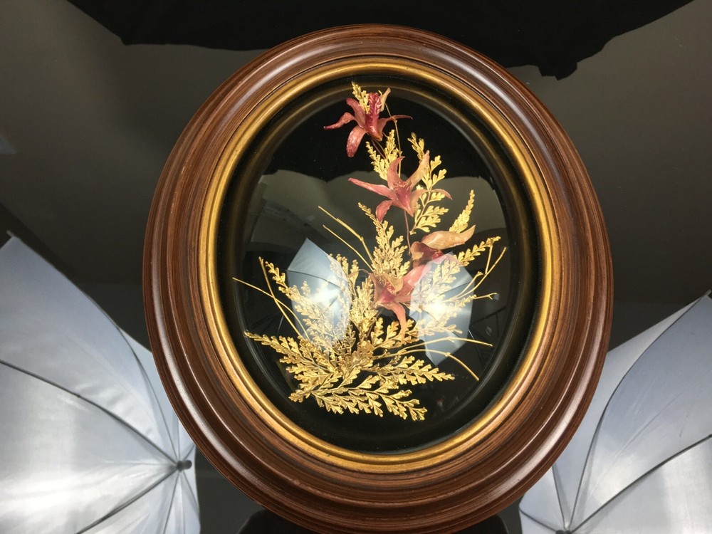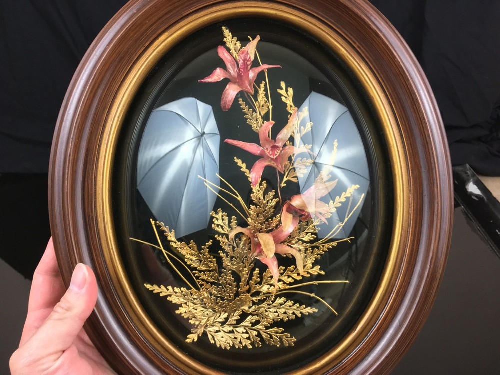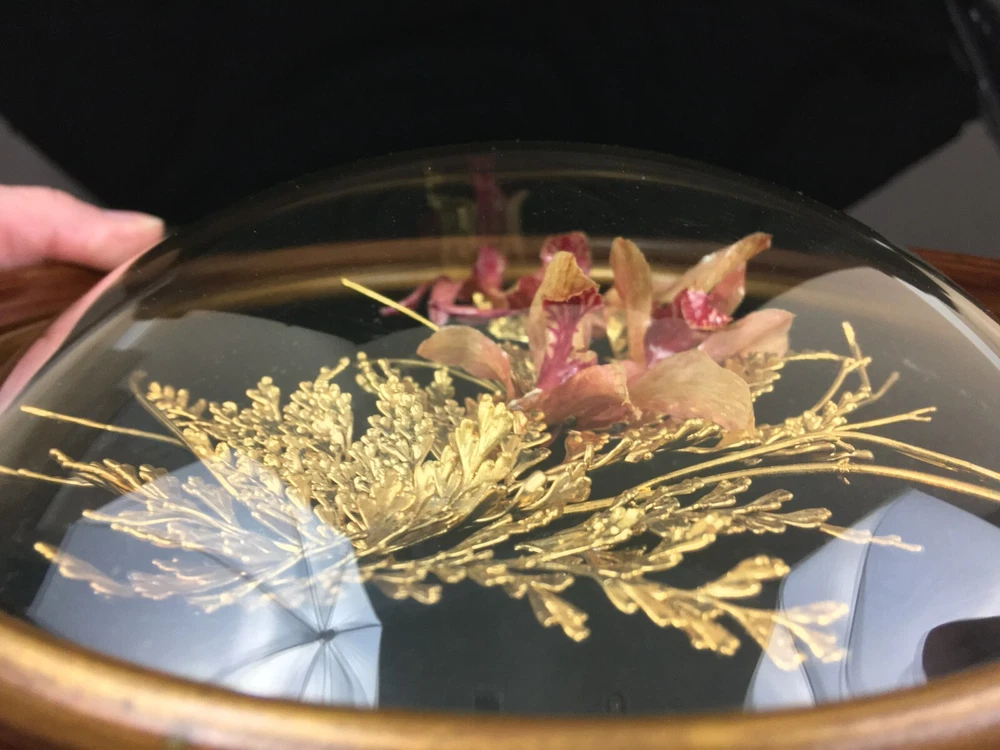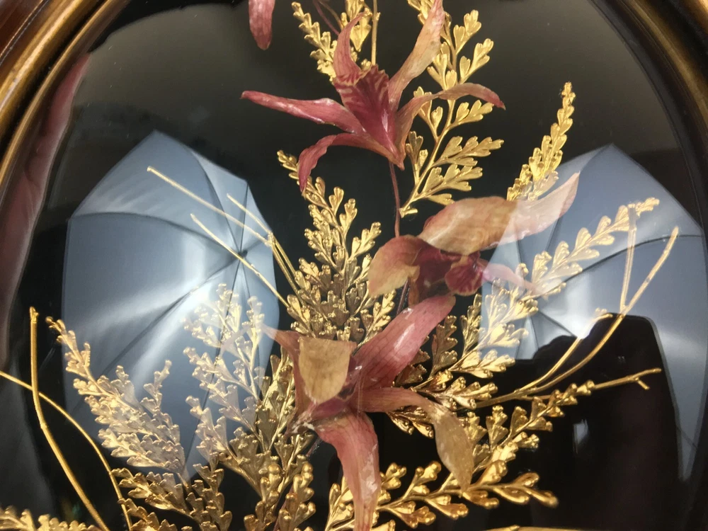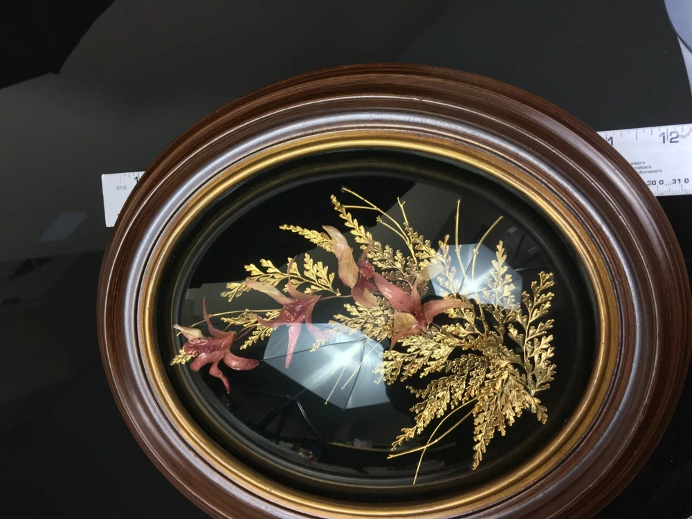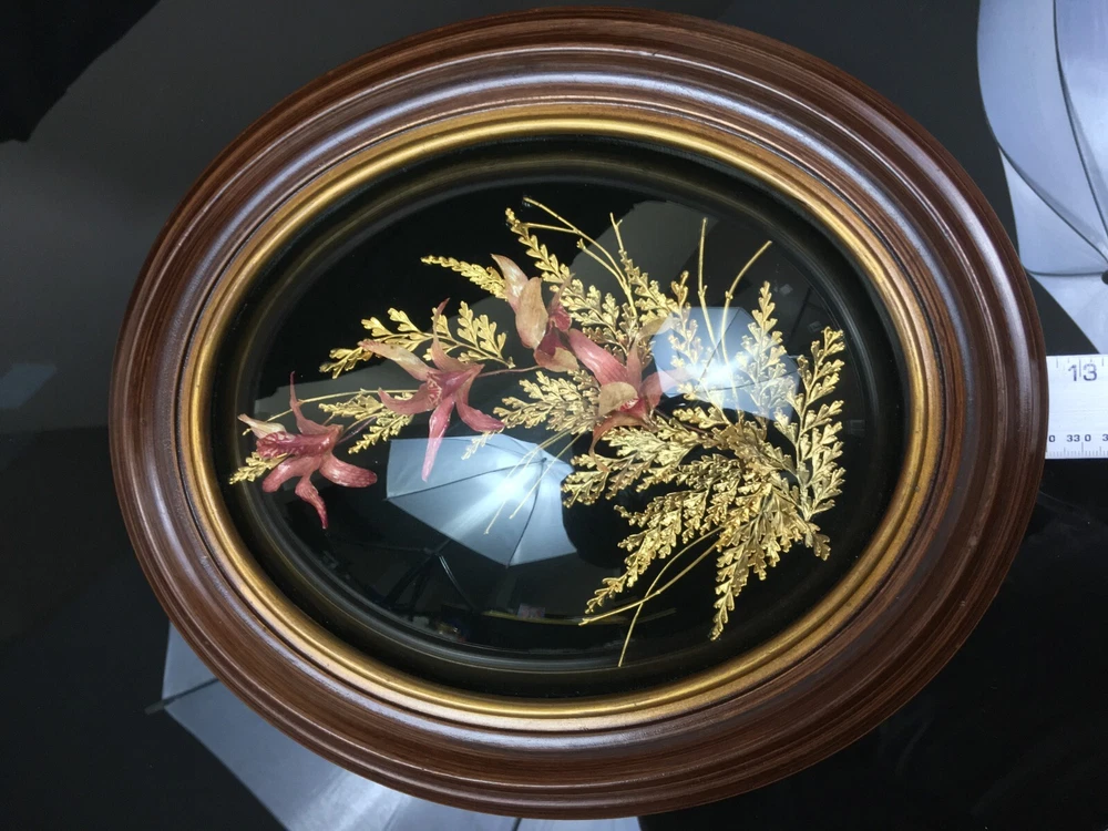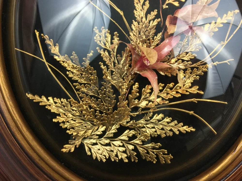 LARGE VINTAGE GOLD DIPPED FERN HAWAIIAN DISPLAY. PREOWNEWD CONDITION AS PICTURED WITH FOXING DAMAGE ON THE CARDOARD BACKING.