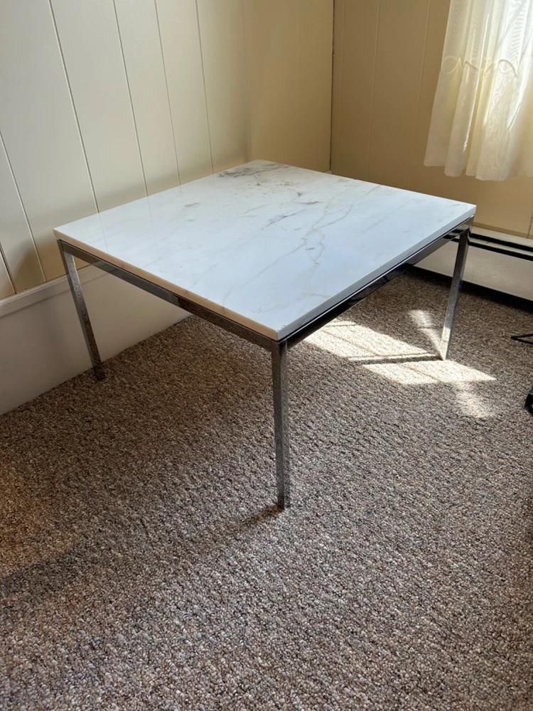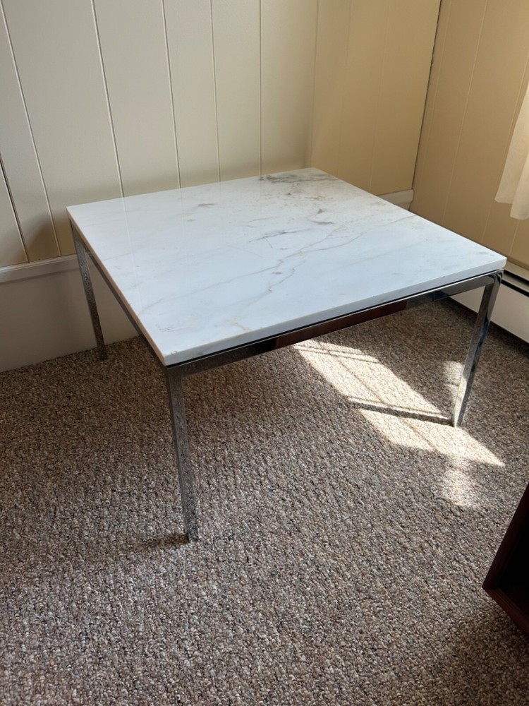 Vintage Florence Knoll for Knoll Studio 27 x 27 x 17 inch low coffee table / end table. This example has a gorgeous white marble top and base is in lovely condition. There are a few small chips in the marble, please see pictures. Knoll International label underneath. Local pickup available in Providence, RI. Shipping also available. Please email me your zip code for a quote. Thanks for looking.