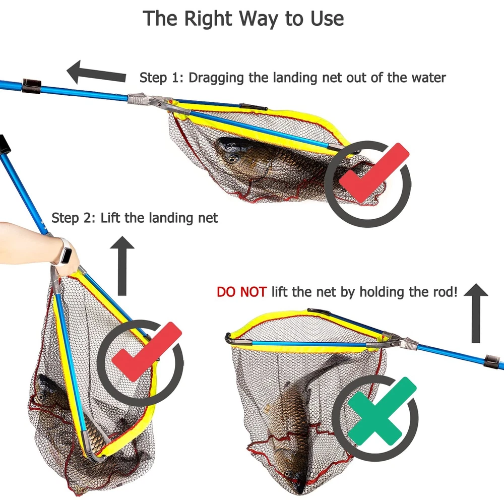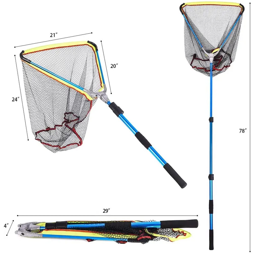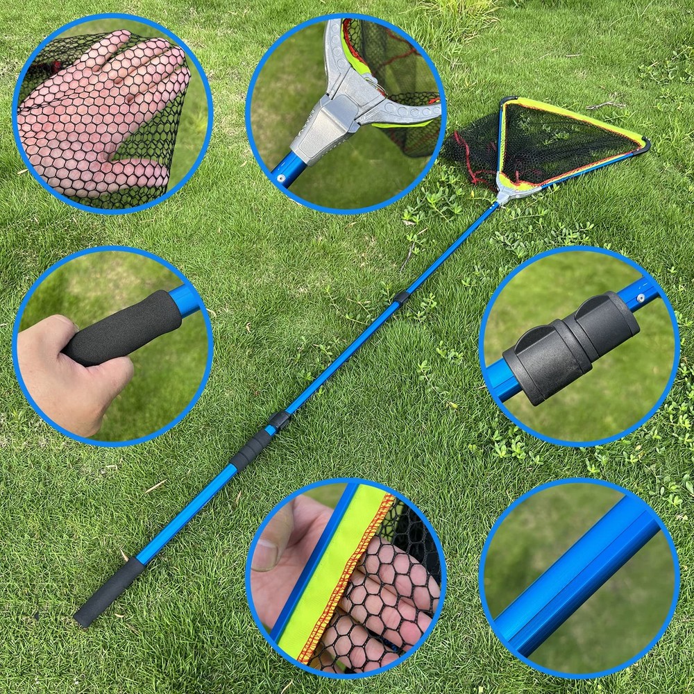 The Folding Landing Net is a must-have for any fishing enthusiast. With its unique folding mesh head and strong aluminum alloy components, this fishing net is built to last. Unlike traditional fishing nets, our net features Aluminium Quick Fold technology, making it easy to carry and store. The compact folding design measures 29'' x 5.9'', allowing for quick and convenient storage.Our triangular fishing net is made of quick-drying nylon and has a reinforced mesh head, ensuring the well-being of the fish and preventing them from slipping away. With a 2-foot deep net, it allows for easier catching and is gentle enough for catch-and-release. This makes it perfect for responsible anglers of all levels.The telescopic fishing pole extends from 2.36ft to 6.5ft, eliminating the need to lean dangerously over the water. Its durable EAV foam handle provides a comfortable, tactile grip, enhancing your fishing experience. Whether you're a beginner or an experienced angler, this versatile and sturdy pole is perfect for you.Built to last, this net can handle even the toughest conditions. Its elegant electroplating finish not only looks great, but it also protects against rust and corrosion. Ideal for anglers of all levels, this net is a must-have for any fishing trip. Cast with confidence and reel in your catch with ease using this exceptional fishing net.To make it easier to carry, the Folding Landing Net comes with an individual polyester bag packing. The bag is slightly larger than the product, allowing you to carry other tools along with you while fishing. However, please do not cut the tag if you need to return or refund the net, as it will be reject.Upgrade your fishing gear with the Folding Landing Net and experience a new level of convenience and performance. 【Fish Net with Aluminium Quick Fold technology, Easy to Carry】- The Folding Landing Net is a game-changer for all fishing enthusiasts. Unlike ordinary fishing nets, our net is made with stronger and more durable aluminum alloy components, ensuring its longevity. The unique folding mesh head design allows for quick and easy storage, measuring at a compact size of 29'' x 5.9''. Carry it with ease and enjoy fishing anywhere and anytime. 【Triangular Mesh Head, More Convenient & Save Energy for Catching Fish】- Our fishing net features a triangular mesh head made of quick-drying nylon. The reinforced mesh head ensures the well-being of the fish and prevents them from slipping away. With a 2-foot deep net, catching fish becomes more convenient and energy-saving. It's the perfect choice for responsible anglers who prioritize fish safety and catch-and-release practices. 【Retractable Up to Two Meters Long】- Say goodbye to leaning dangerously over the water with the Folding Landing Net. This telescopic fishing pole extends from 2.36ft to 6.5ft, providing a longer reach compared to traditional nets. The durable EAV foam handle offers a comfortable and tactile grip, enhancing your fishing experience. Suitable for anglers of all levels, this versatile and sturdy pole gives you the confidence to cast and reel in your catch effortlessly. 【Durable Rod with Exquisite Plating Process】- Built to withstand tough fishing conditions, the Folding Landing Net is your reliable companion on every fishing trip. The elegant electroplating finish not only adds a touch of style but also protects against rust and corrosion. Anglers of all levels will appreciate the durability and functionality of this exceptional fishing net. Cast with confidence and reel in your catch with ease using our reliable net. 【Individual Polyester Bag Packing Makes It Easier to Carry】- A Fish Landing Nets with a polyester bag packing. And the bag is slightly larger than the product which is allowing you to carry other tools along with you while fishing. Please DO NOT cut the tag if you need to return or refund or it will be reject.