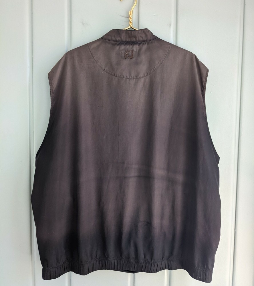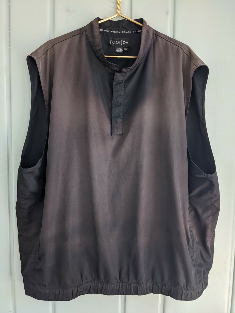 FootJoy Mens XXL 2XL Golf Vest Black Brown Dip Dye Fade Sleeveless 1/4 Quarter Material: 100% Polyester Condition: Preowned with no rips, stains or holes. Please see photos for the best description of condition and wear. Pockets: Two zip close pockets Closure: Pull over with partial snap Fabric has no stretch. Color: I try to photograph the items as accurately as possible, using filtered sunlight with no flash, but please keep in mind that colors may vary a bit, depending on your monitor and the light in which the garment is viewed. Measurements are taken with the garment laying flat and unstretched. Comparing these measurements to the measurements of a similar garment that fits you well, is a good way to help determine fit. Measurements (laying flat, across only, approximate) Shoulders (seam to seam): 22 inches Chest: 30.5 inches Waist: 30 inches Bottom hem measured across: 26.75 inches Top of shoulder to bottom hem: 30.5 inches