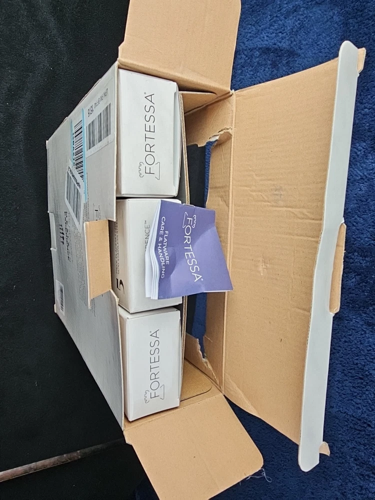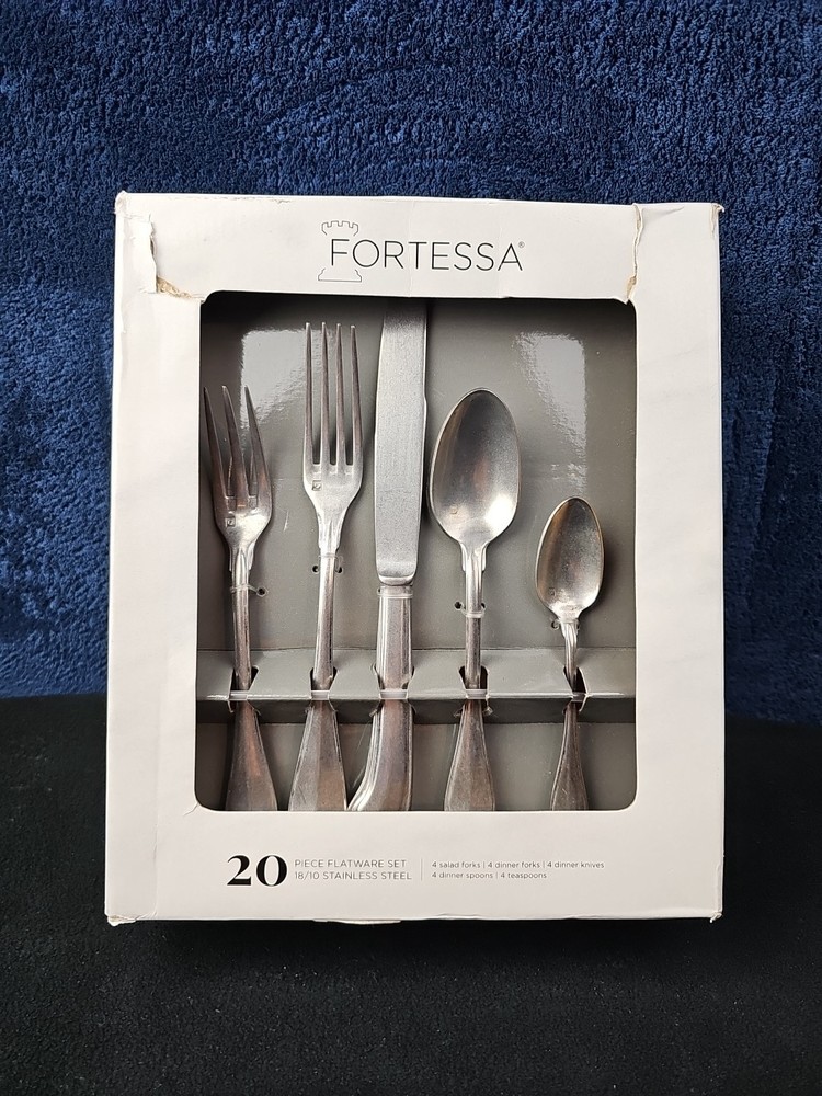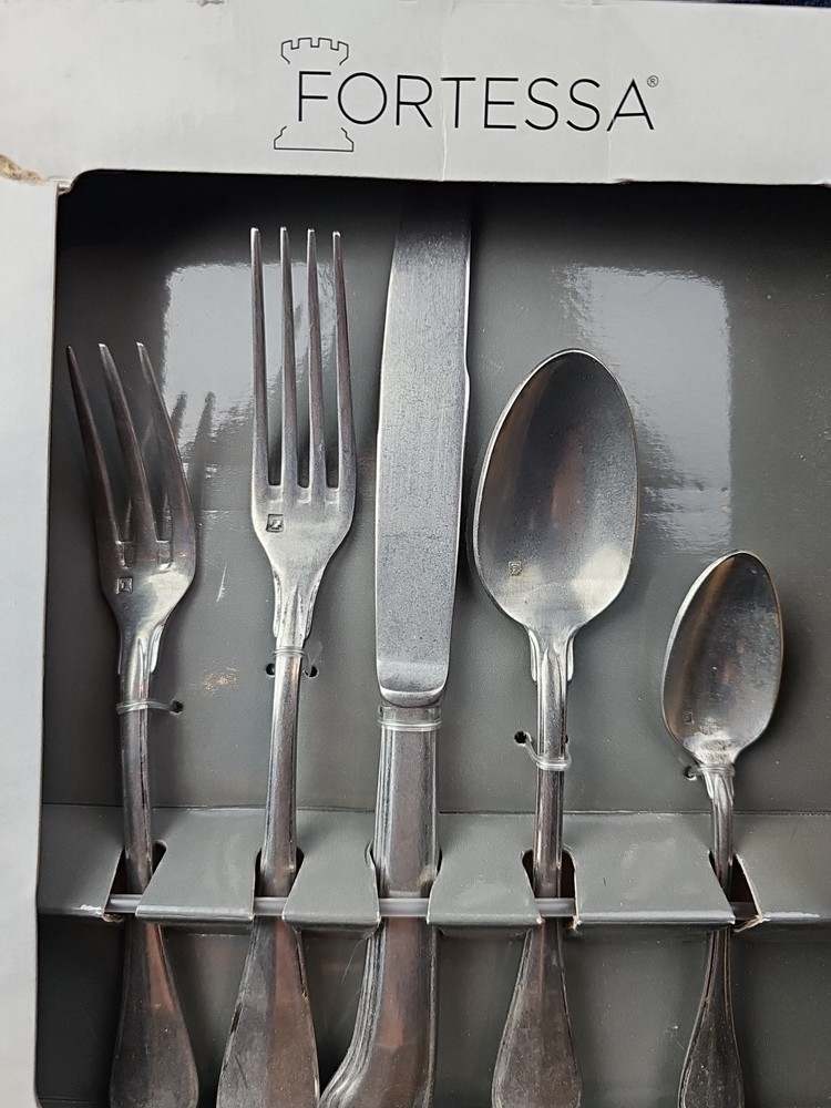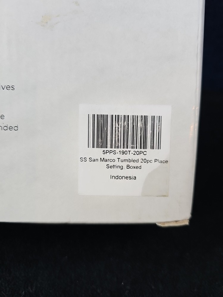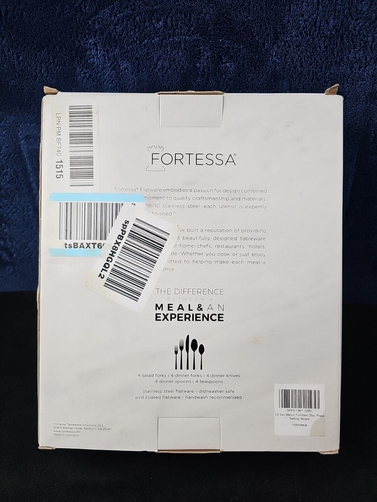 Box damaged. Never used. The Fortessa San Marco 20 Piece Flatware Set in Tumbled is a stylish and practical addition to any dining table. Made by the reputable brand Fortessa, this set includes 20 pieces of flatware designed with a tumbled finish for a refined look. With a service for 4, this set is perfect for everyday use or special occasions. The stainless steel handles provide durability and a comfortable grip, while the elegant design adds a touch of sophistication to your dining experience. Made in Indonesia, this flatware set is sure to impress guests and elevate your dining experience.