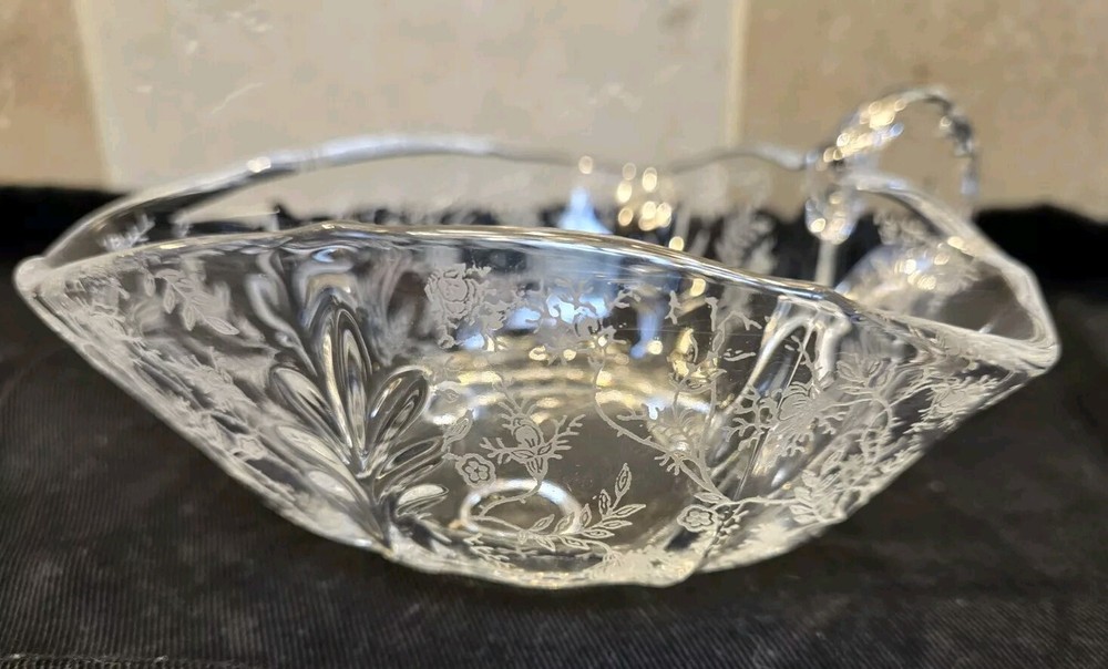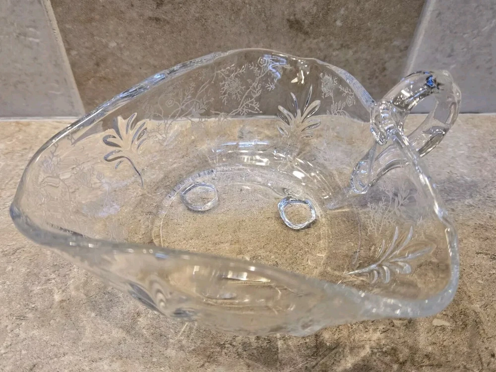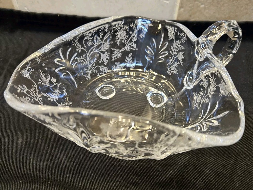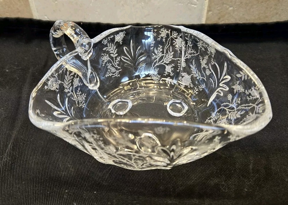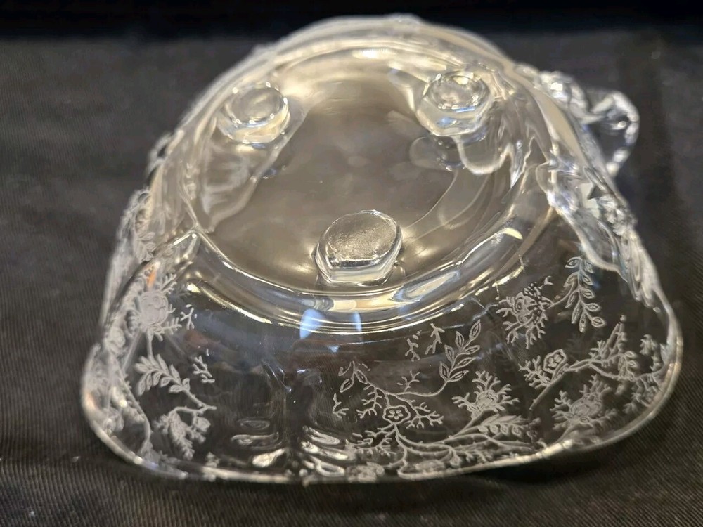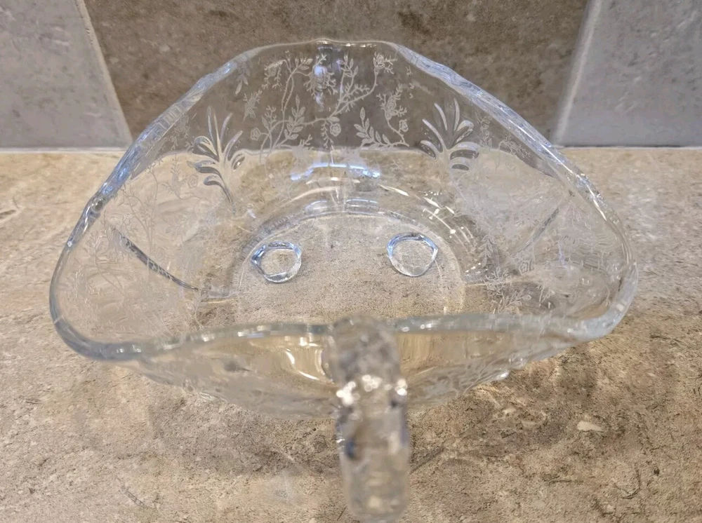 This vintage Fostoria Chintz Etched Nappy Bowl is a beautiful addition to any collection. The small, triangular shaped dish features an etched chintz pattern and a glossy finish. It is made of elegant glass and is studio crafted. The bowl is perfect for all occasions and is a great piece for display. It is easy to care for, hand wash only, and comes with no manufacturer warranty. The Fostoria Chintz product line is known for its high-quality glassware and this piece is no exception. Add a touch of vintage charm to your home with this stunning bowl. Some Light Scratches. Ships USPS Ground Advantage