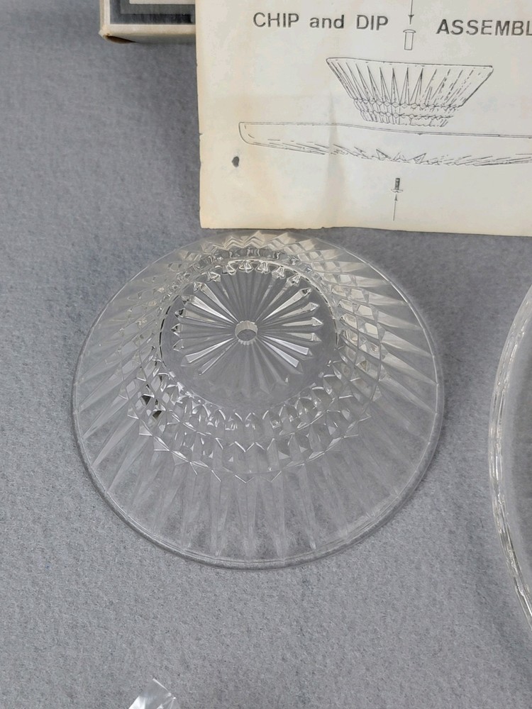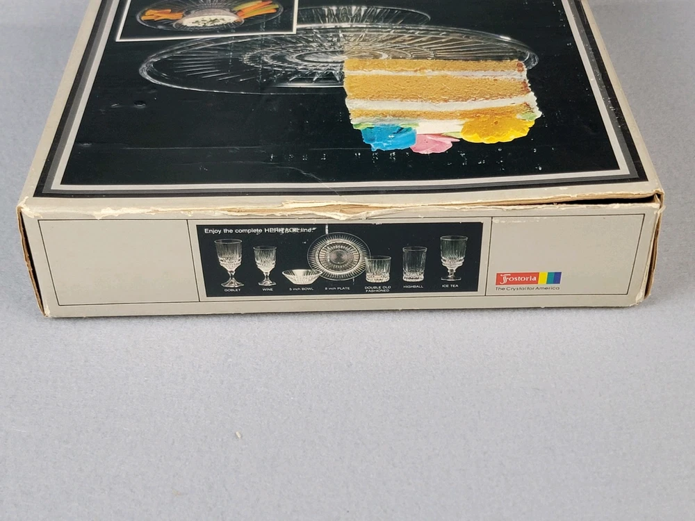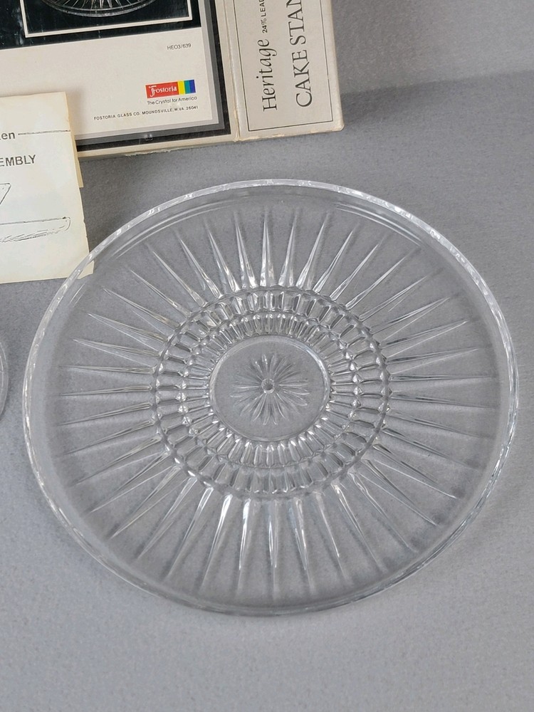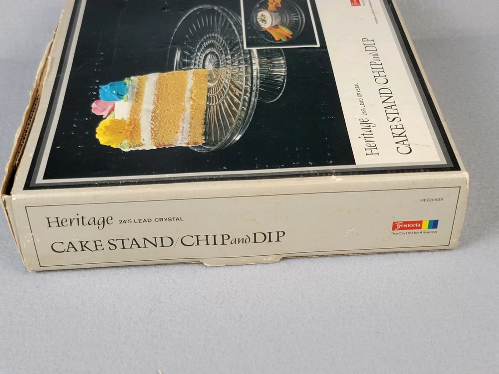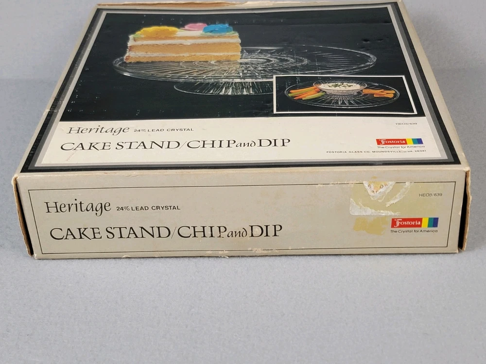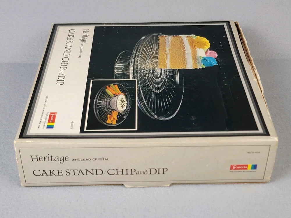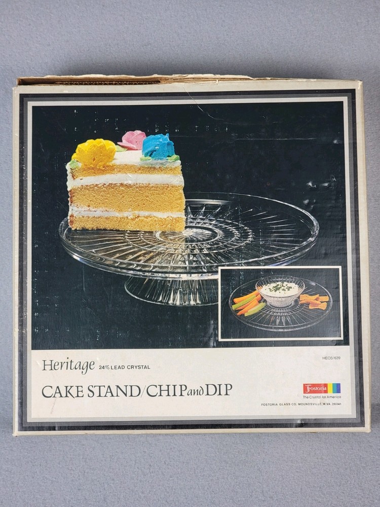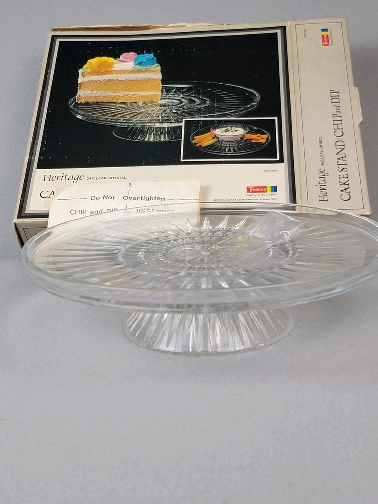 Fostoria Crystal Chip & Dip or Cake Plate New In Box Heritage Vintage This Fostoria Crystal Chip & Dip or Cake Plate by Heritage is a vintage-style, round platter with a striped pattern. It is large in size, made of clear crystal, and features a stand for display. Perfect for all occasions, this elegant piece is new in box and refrigerator safe. A stunning addition to any table setting or cocktail-themed party.