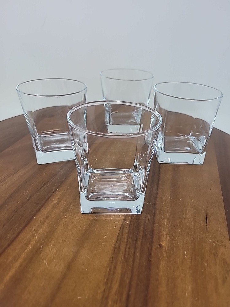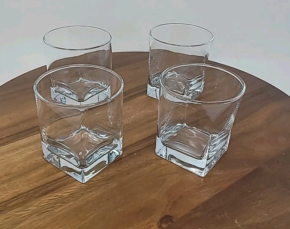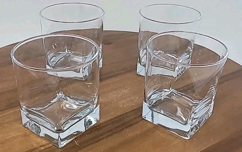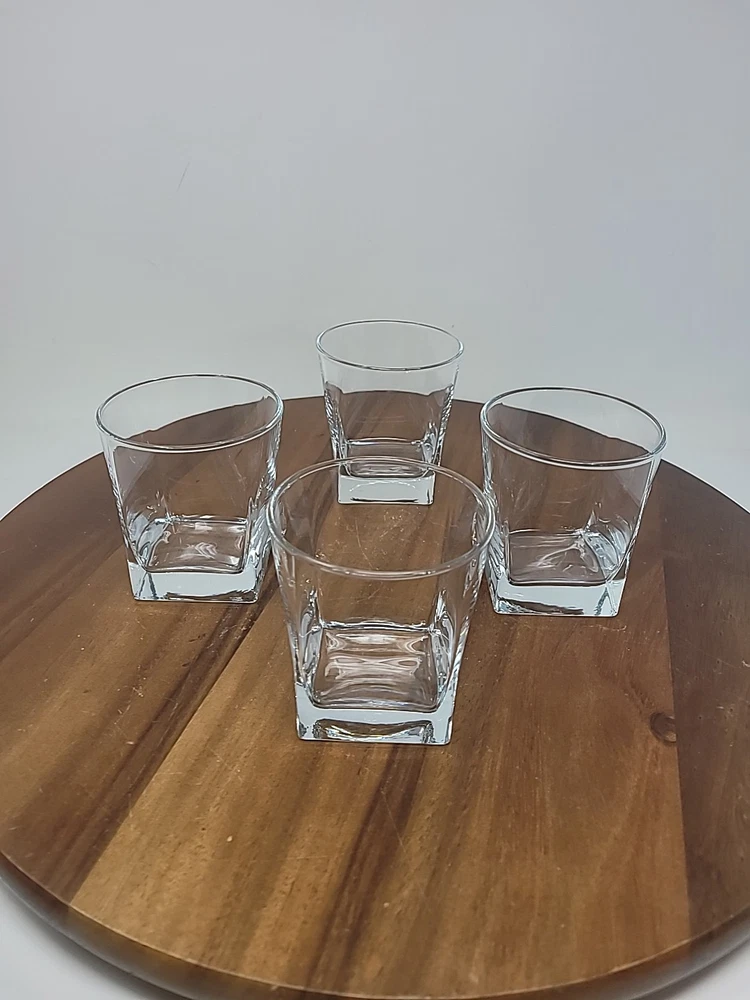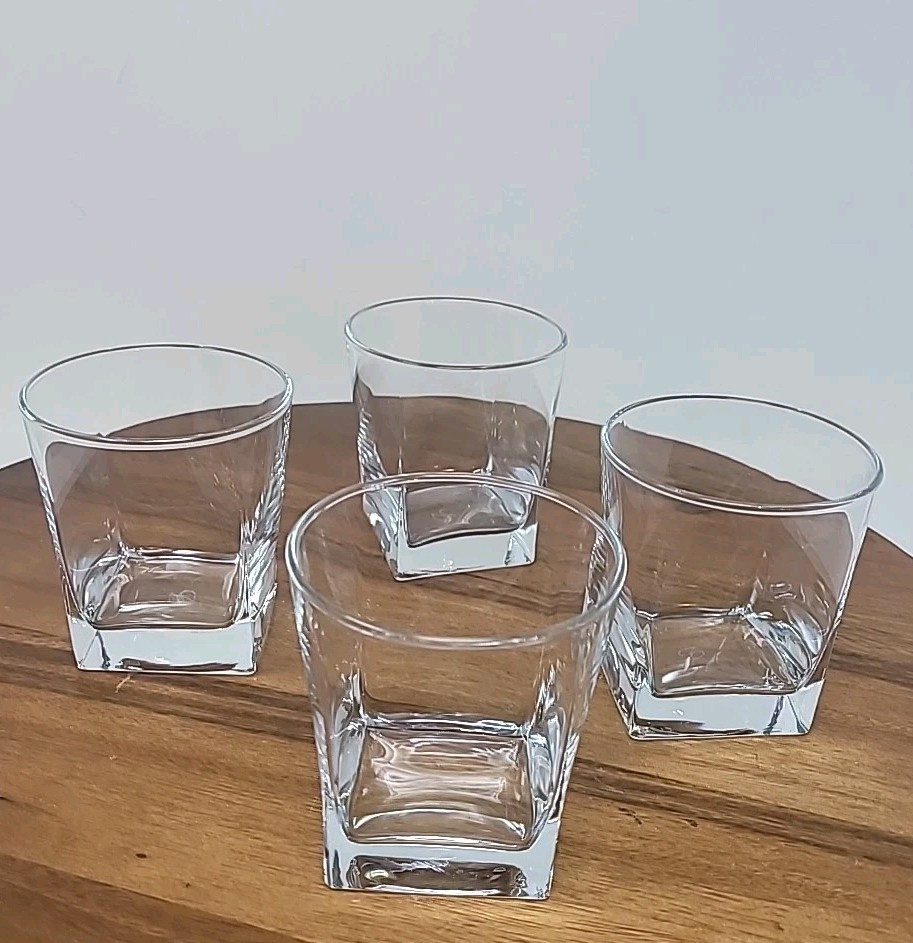 This product is a set of four elegant Pasabahce old fashioned square cocktail glasses with a hint of blue in color. The glasses are designed with a square shape, adding a unique and modern touch to the traditional cocktail glass. The production style of these glasses is described as elegant glass, suggesting a sophisticated and high-quality design. Perfect for serving cocktails or other beverages in style, these glasses are sure to elevate any barware collection with their chic and distinctive appearance. Thank you for your time. All glasses are in the great condition.