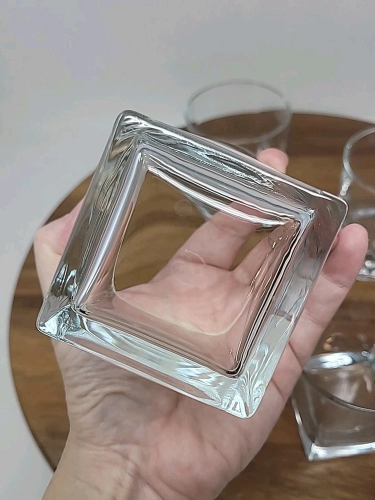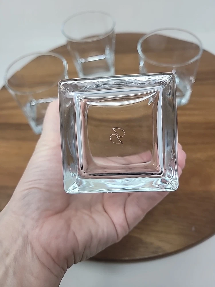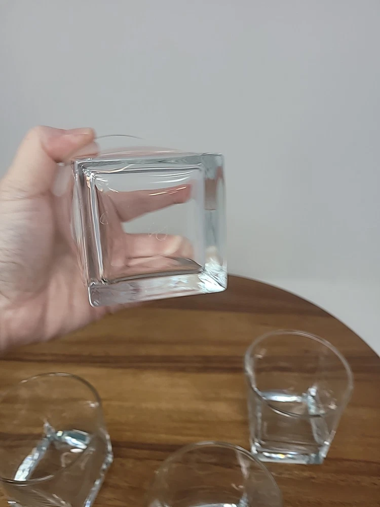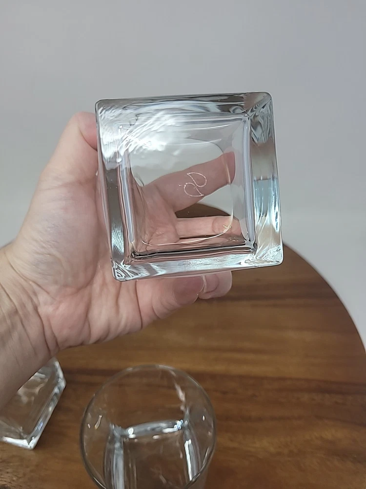 This product is a set of four elegant Pasabahce old fashioned square cocktail glasses with a hint of blue in color. The glasses are designed with a square shape, adding a unique and modern touch to the traditional cocktail glass. The production style of these glasses is described as elegant glass, suggesting a sophisticated and high-quality design. Perfect for serving cocktails or other beverages in style, these glasses are sure to elevate any barware collection with their chic and distinctive appearance. Thank you for your time. All glasses are in the great condition.