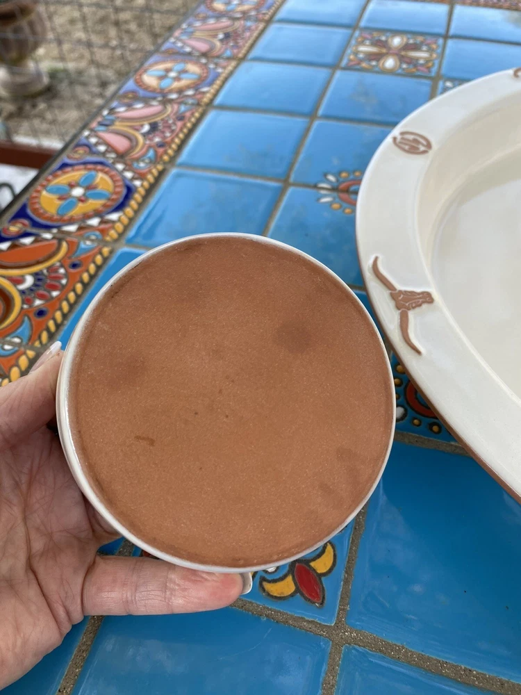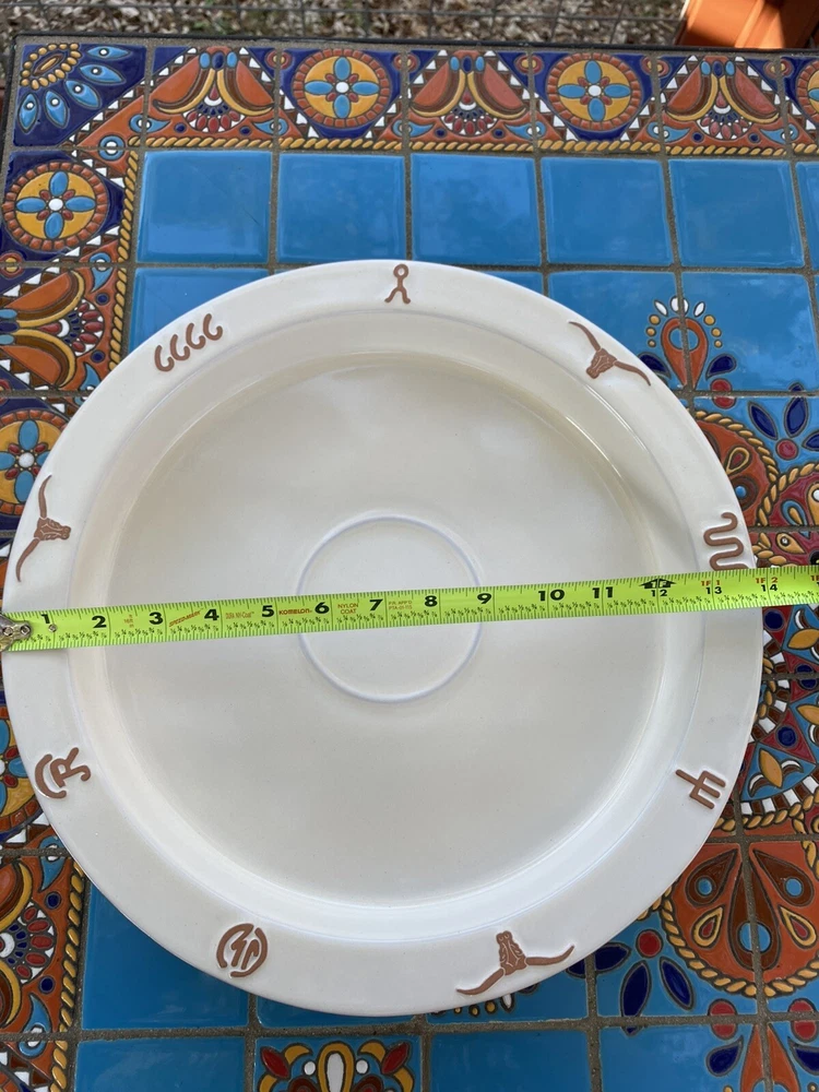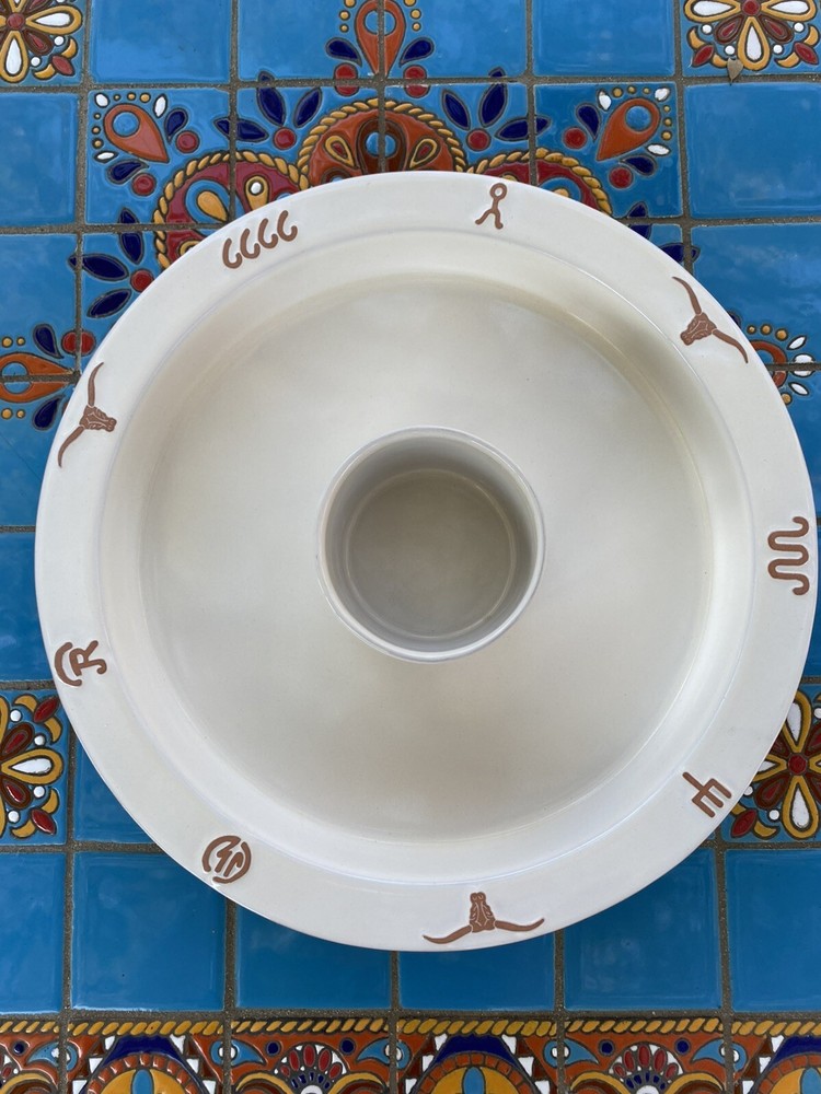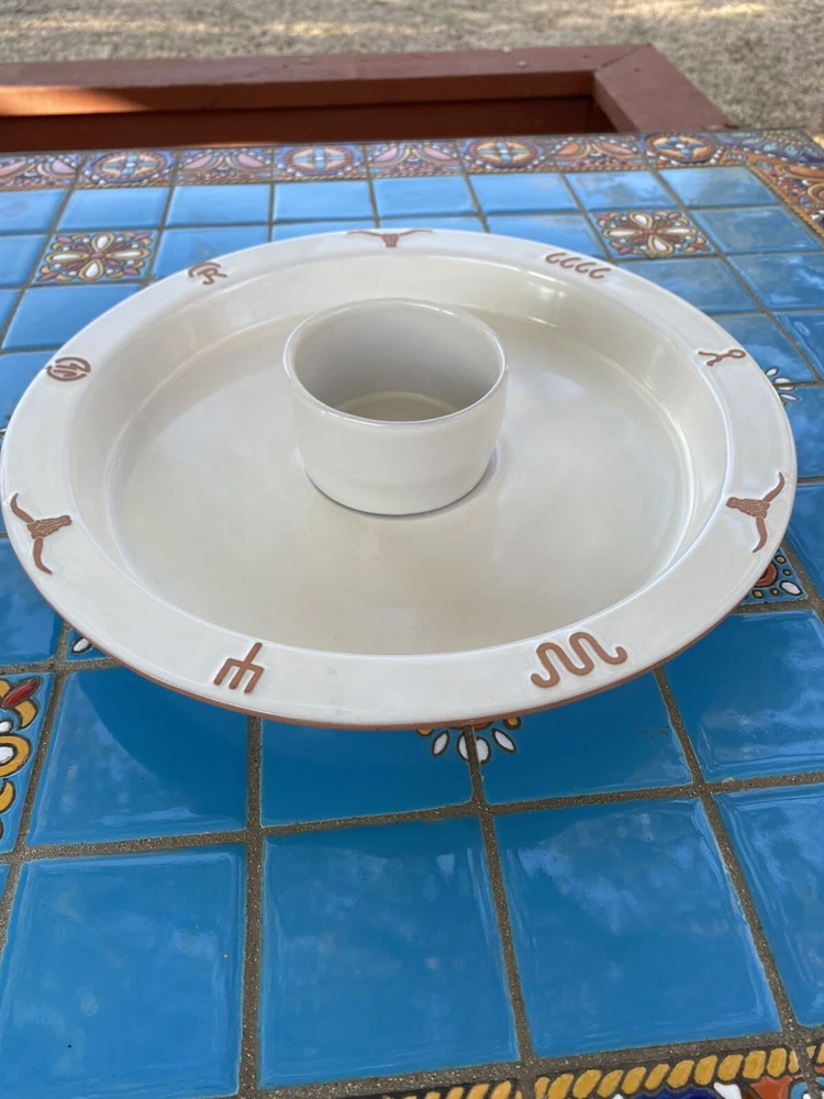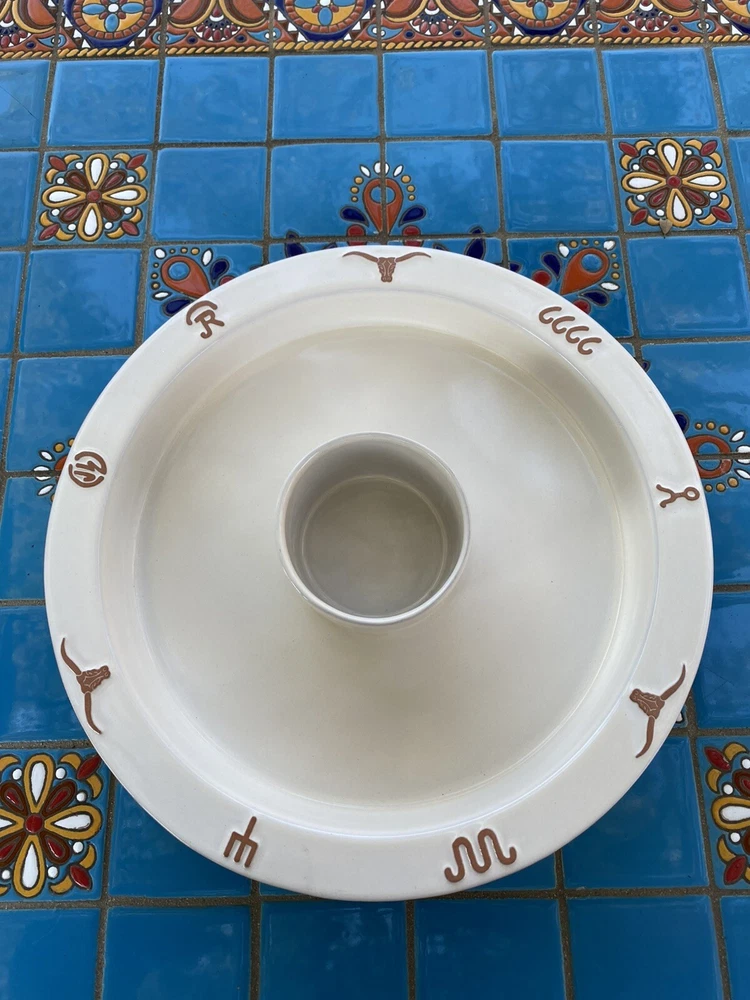 The Frankoma Chip & Dip set features a large round platter in a glossy white finish, measuring 14 inches in diameter and 2 inches in depth. Made of clay in the United States, it showcases Western Brands like King Ranch, the Pitchfork, 6666, and Longhorn. This Western-themed serving piece is perfect for all occasions, making it a stylish addition to any dining or entertainment setting. It is in excellent condition. No chips, cracks, or flaws that I can see. Large piece measures 14” in diameter and is marked Frankoma. The dip bowl is also in excellent condition, but is unmarked. This item will be bubble wrapped and carefully packaged for shipment to you.