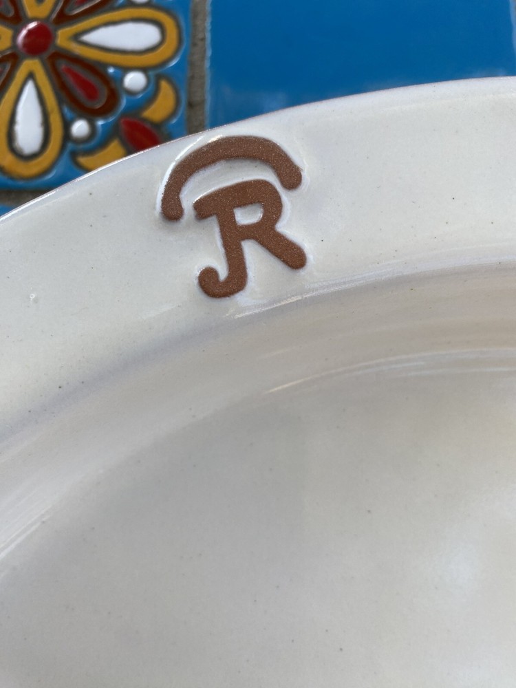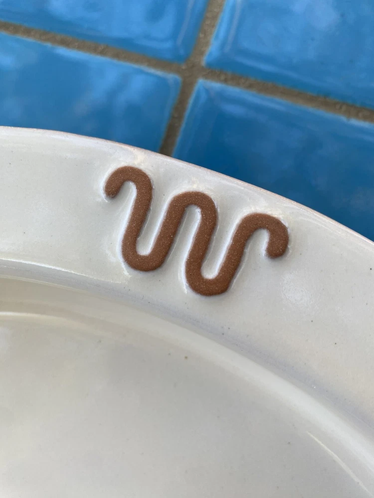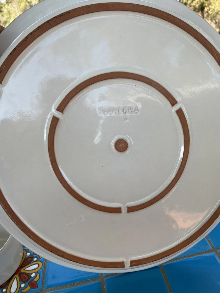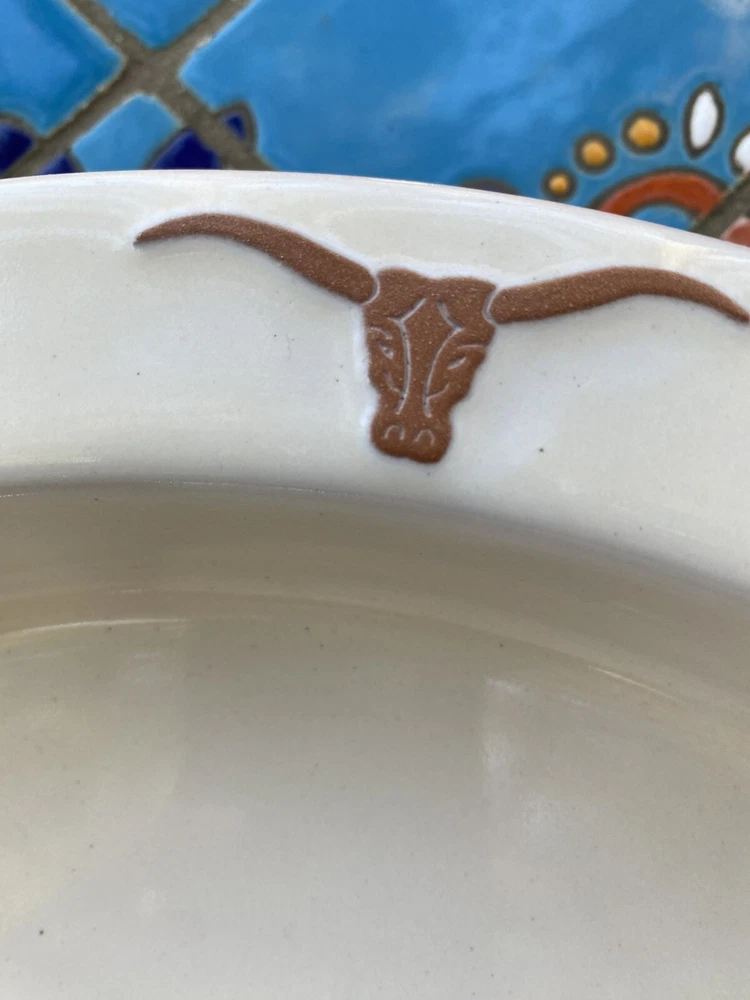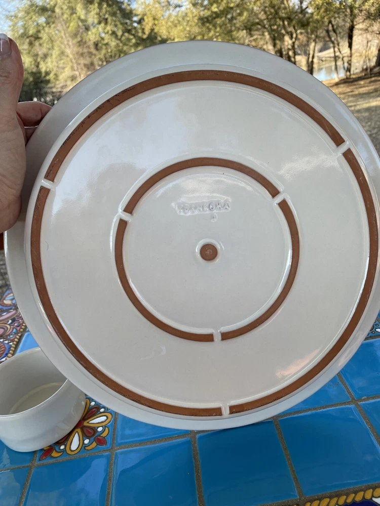 The Frankoma Chip & Dip set features a large round platter in a glossy white finish, measuring 14 inches in diameter and 2 inches in depth. Made of clay in the United States, it showcases Western Brands like King Ranch, the Pitchfork, 6666, and Longhorn. This Western-themed serving piece is perfect for all occasions, making it a stylish addition to any dining or entertainment setting. It is in excellent condition. No chips, cracks, or flaws that I can see. Large piece measures 14” in diameter and is marked Frankoma. The dip bowl is also in excellent condition, but is unmarked. This item will be bubble wrapped and carefully packaged for shipment to you.