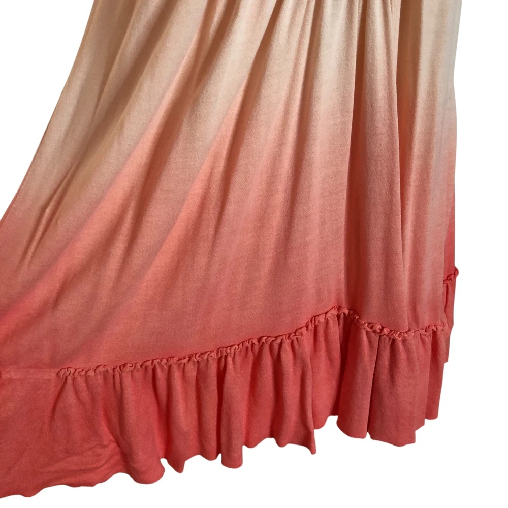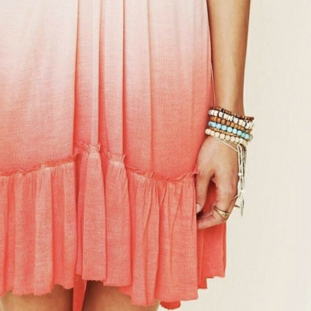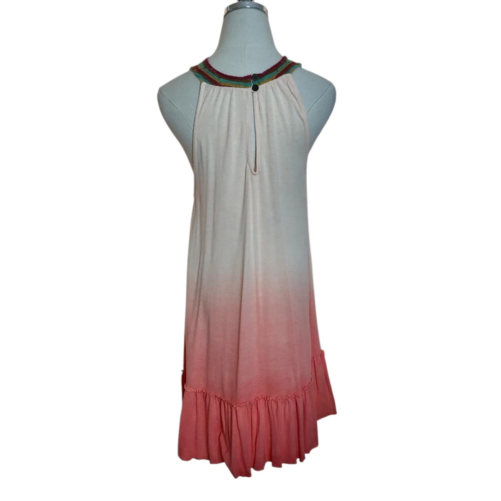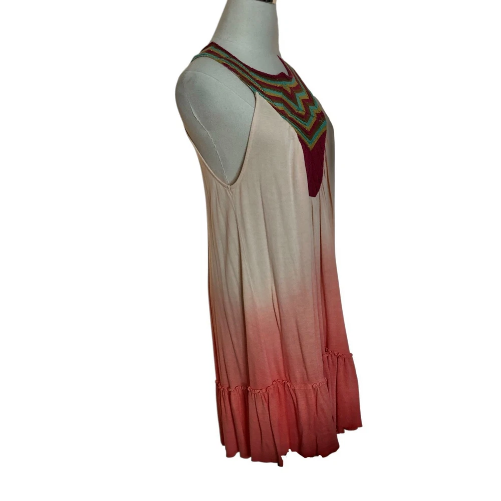 Free People Belle Fleur boho dip dye ombre pullover a-line tunic mini dress Size Large Coral orange green gold Sleeveless Crochet bib yoke Ruffled hem Back neck buttons Measurements (flat lay +/- 1") Bust: 20" Length: 32" 100% viscose Hand wash Good pre-owned condition. All clothing items have been steam cleaned/laundered per eBay policy