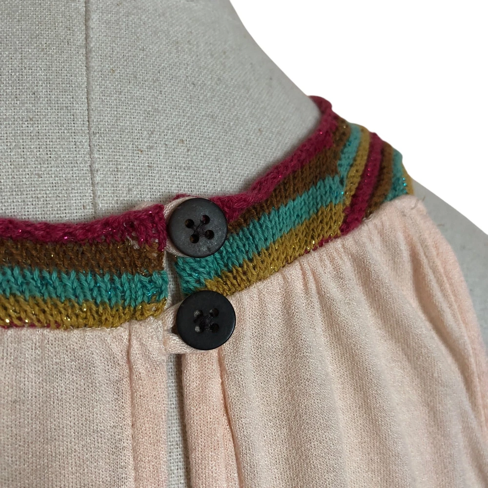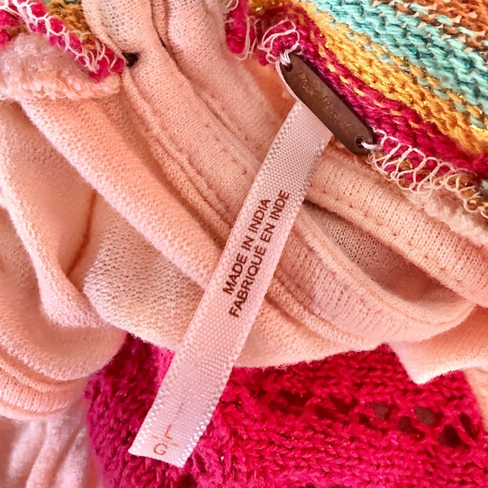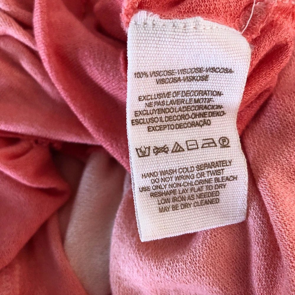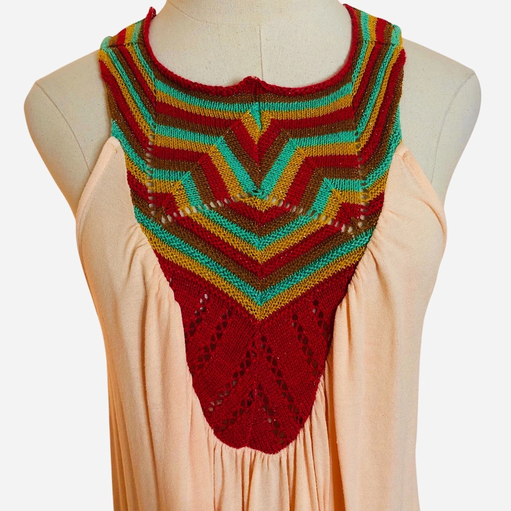Free People Belle Fleur boho dip dye ombre pullover a-line tunic mini dress Size Large Coral orange green gold Sleeveless Crochet bib yoke Ruffled hem Back neck buttons Measurements (flat lay +/- 1") Bust: 20" Length: 32" 100% viscose Hand wash Good pre-owned condition. All clothing items have been steam cleaned/laundered per eBay policy
