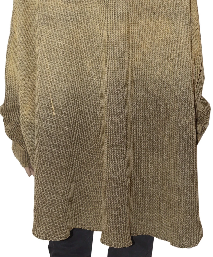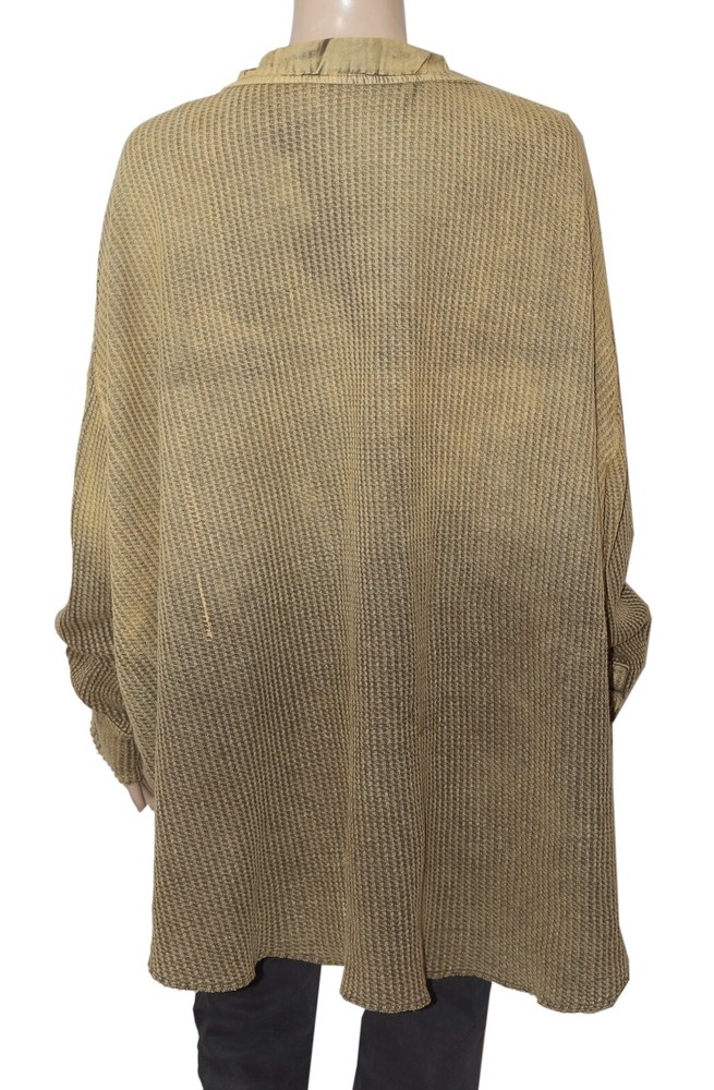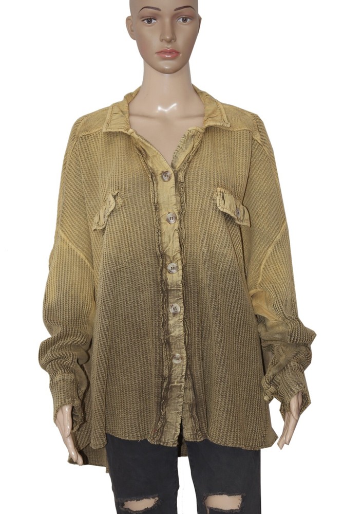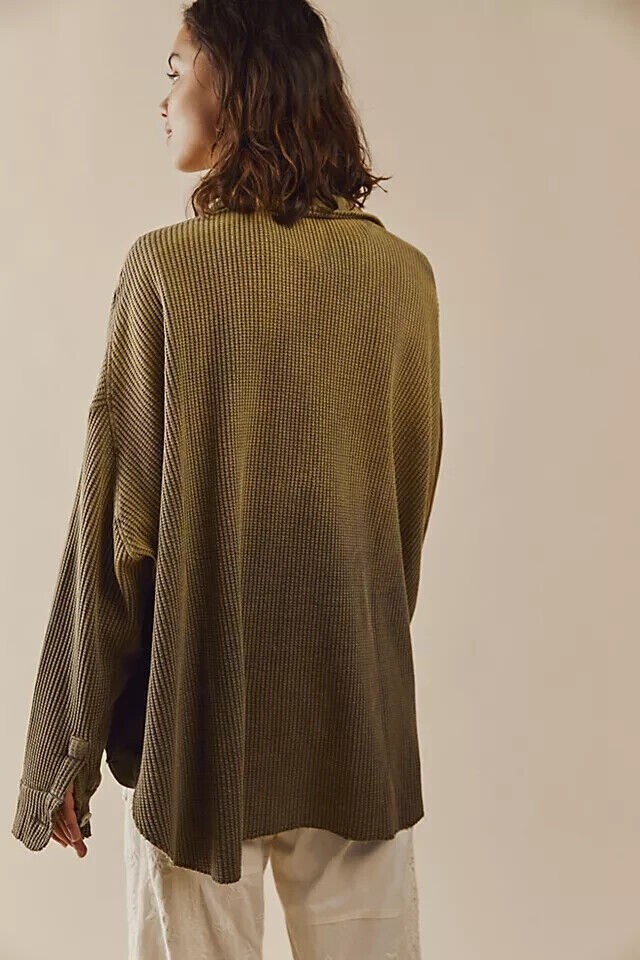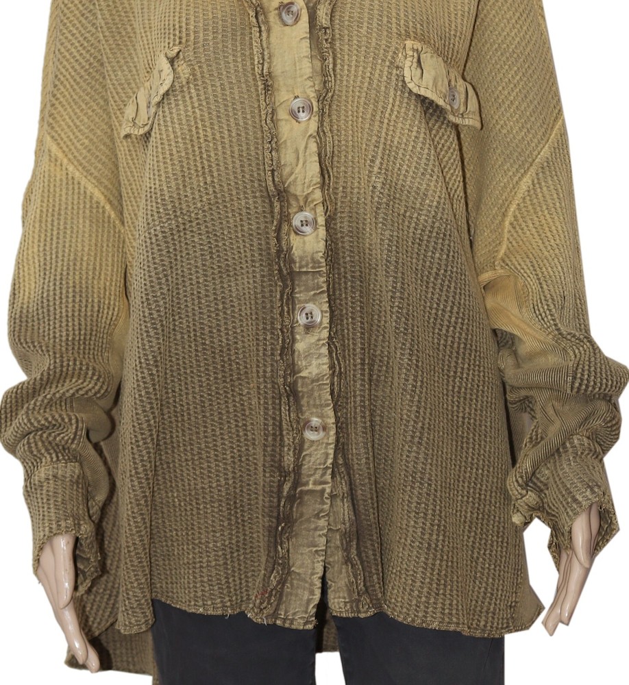Free People FP One Scout Dip Dyed Jacket Button Oversized Thermal Tunic Top L Condition: This item has an missing tag,wash care & Label . PS:There is Color Discoloratin on left side Hem which is visible & it can't show up in the Picture. Measurement details Size - Large (It can fit Extra Large also) Drop down bust -36" across (Laying flat) (Dolman Sleeve) Length - 28"shorter part 33"Longer part Color - Multi Color Fabric - Cotton Item details Collared Neck. Long sleeves. Lightweight waffle-knit jacket. Extra slouchy and oversized. Longer in the back. Button-up collared design. Front flap pockets. Dip dye Pattern on Jacket. Raw-edge hems.