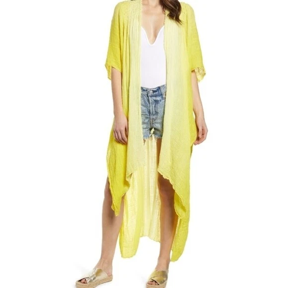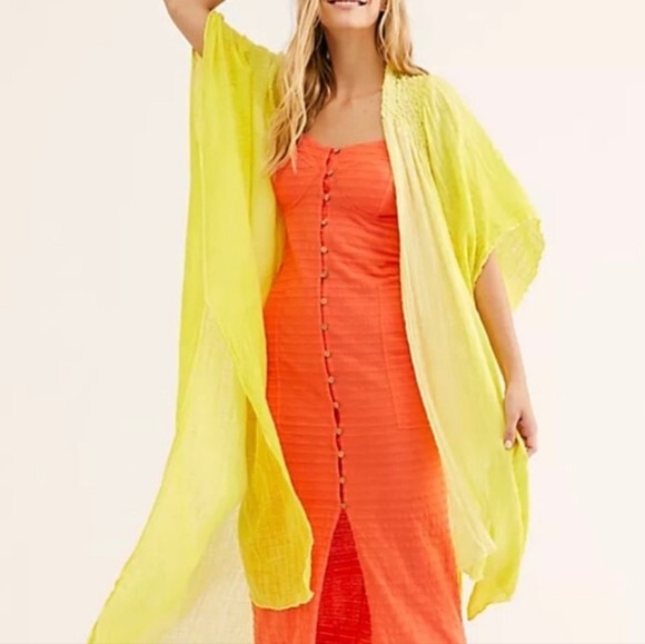 Free People One Angelica Yellow Dip Dye Kimono Coverup Brand New with Tags Size M/L Gauze Fabric Cotton Viscose Blend Side Slit Vent Detail Open, No Closure Made in India