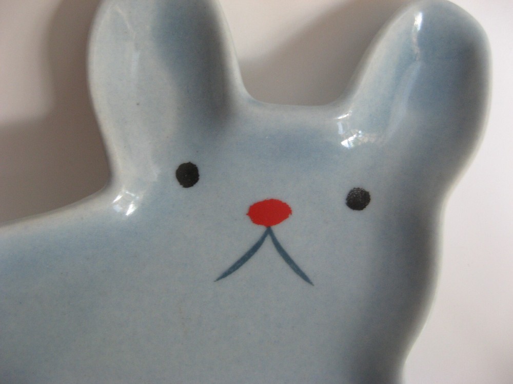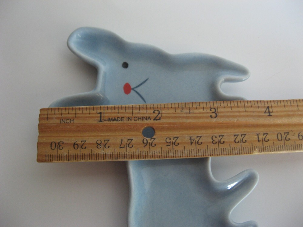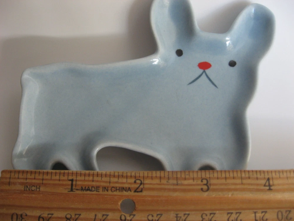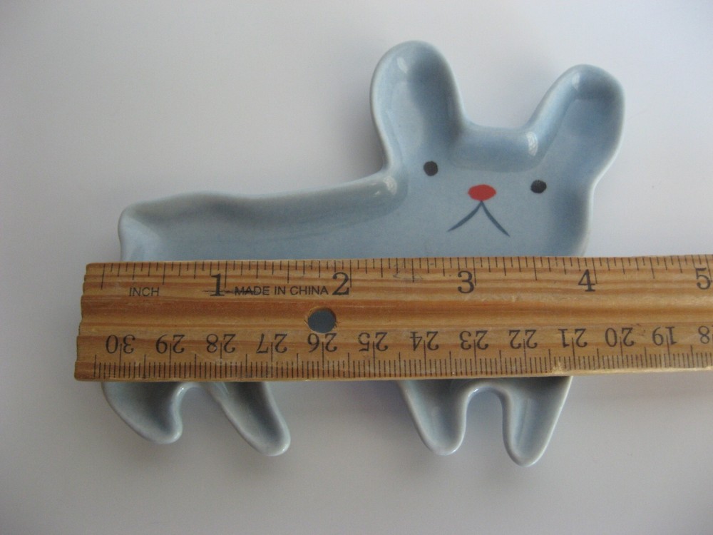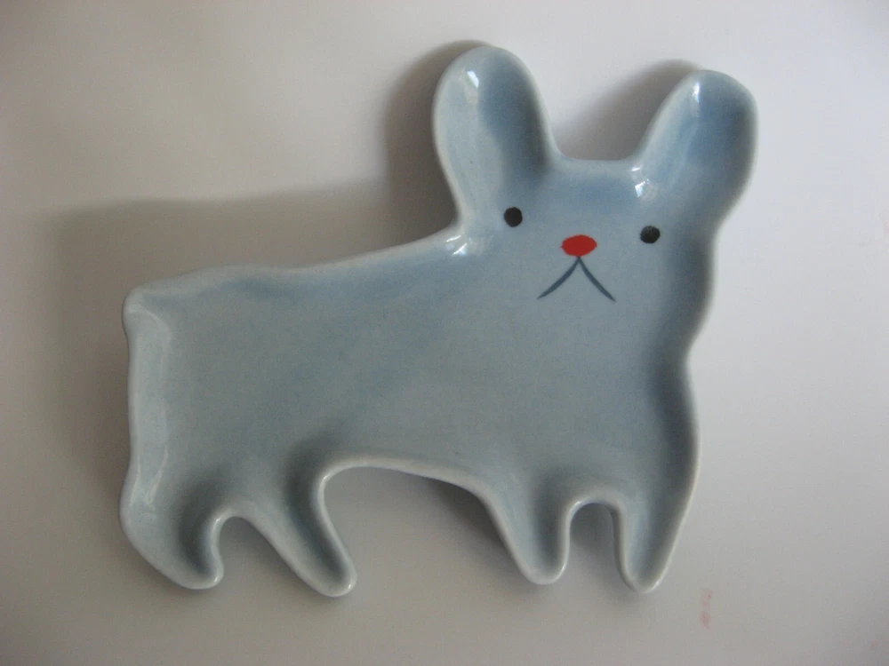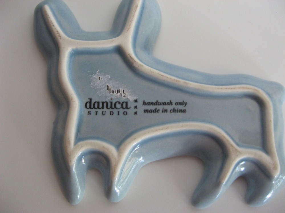 Trinket Ceramic Dish/Tray/Spoon Rest. Frenchie Bulldog. Cute light blue dish shaped like a French Bull Dog. Made by Danica Studio. Hand wash. 4.5 inches long x 4 inches wide Price sticker remnants of back of dish. I will leave that up to new owner to wash off.