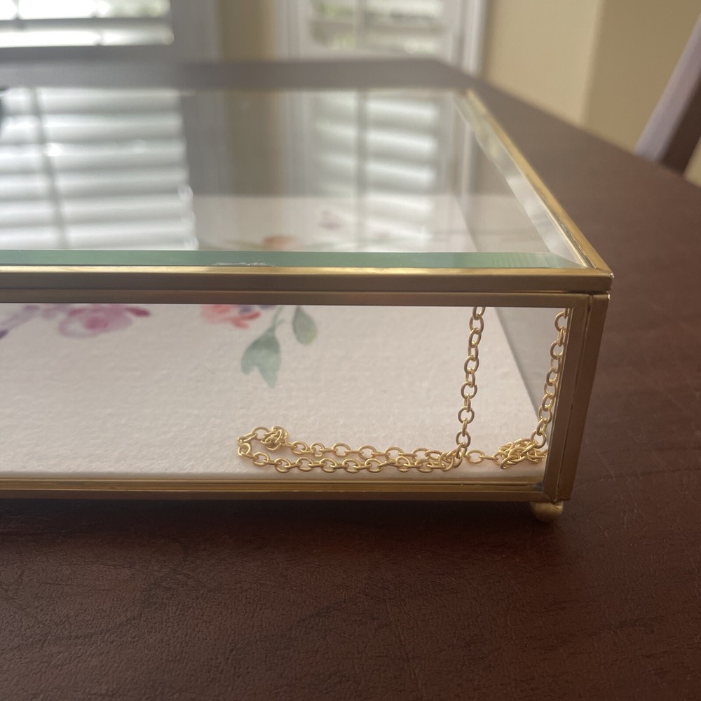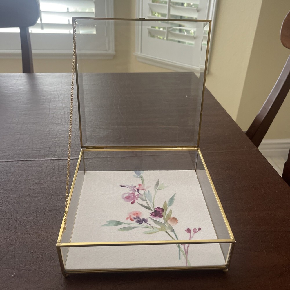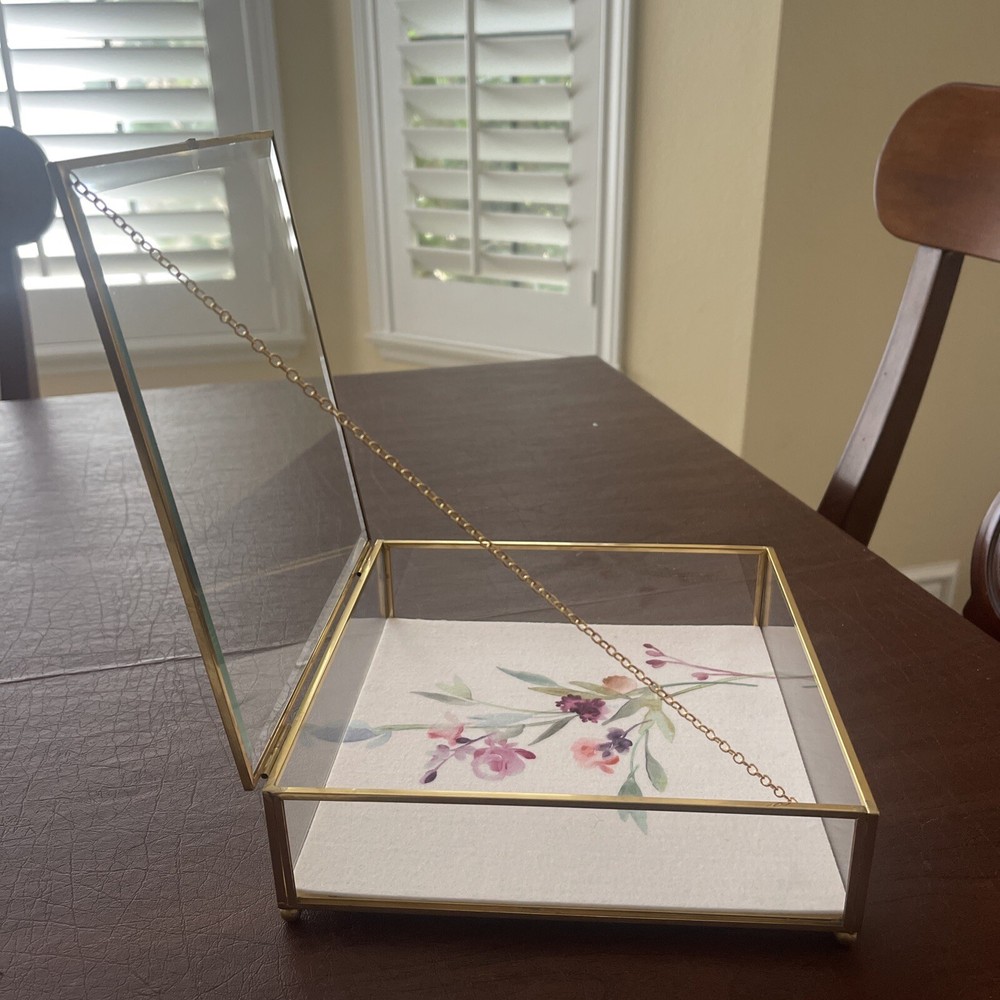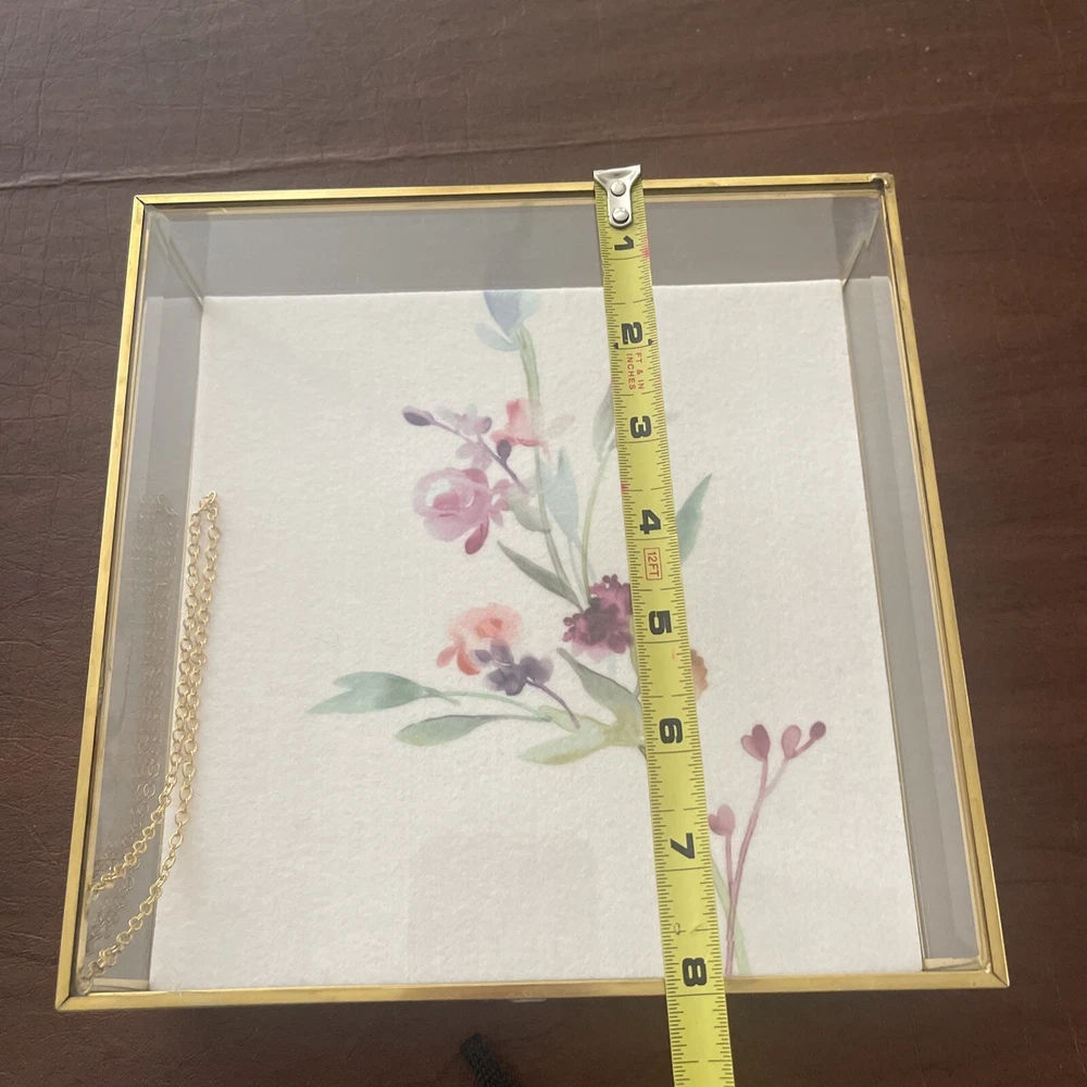 Fringe Studio Glass Deco Trinket/Jewelry Box W/ Floral Base Design; Hinged Chain; 8”sq. Really pretty glass jewelry box with floral design on felt material on the bottom. Open hinge with gold chain attached to side. 8” square and weighs 2 lbs. 4 oz. (Unpackaged). Will ship with care.