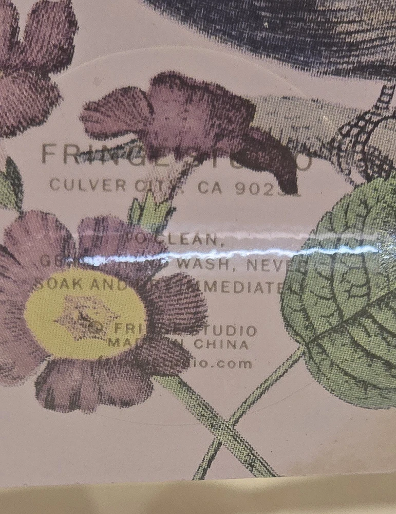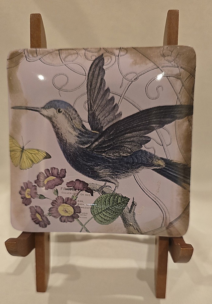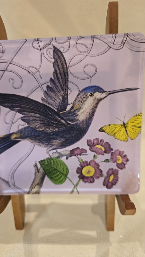 This Fringe Studio Hummingbird glass tray from California features a square shape with multicolor glass and a glossy finish. Measuring 4 1/2 inches in length and height, this handmade tray showcases a blend of realism and decorative patterns inspired by ornithological illustrations and possibly Art Nouveau influences. Crafted in a studio style in the United States, this tray is adorned with a hummingbird theme, adding a touch of nature-inspired beauty to any space.