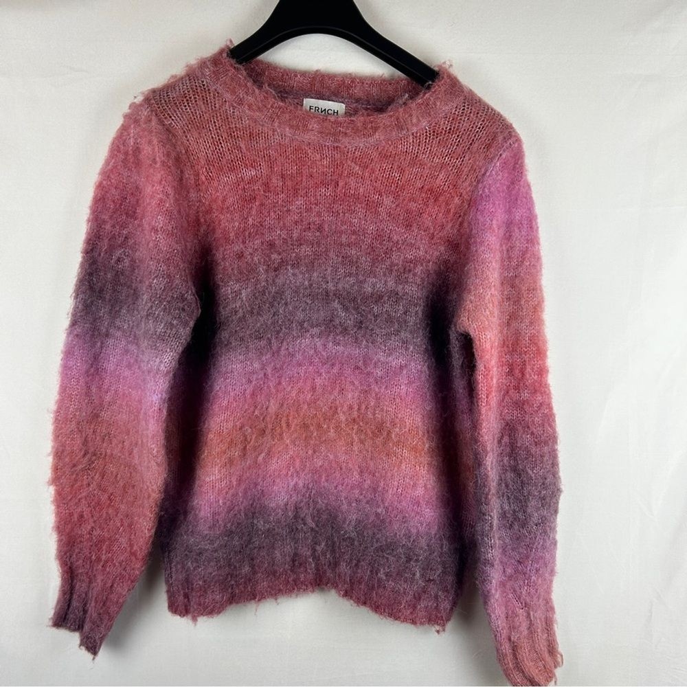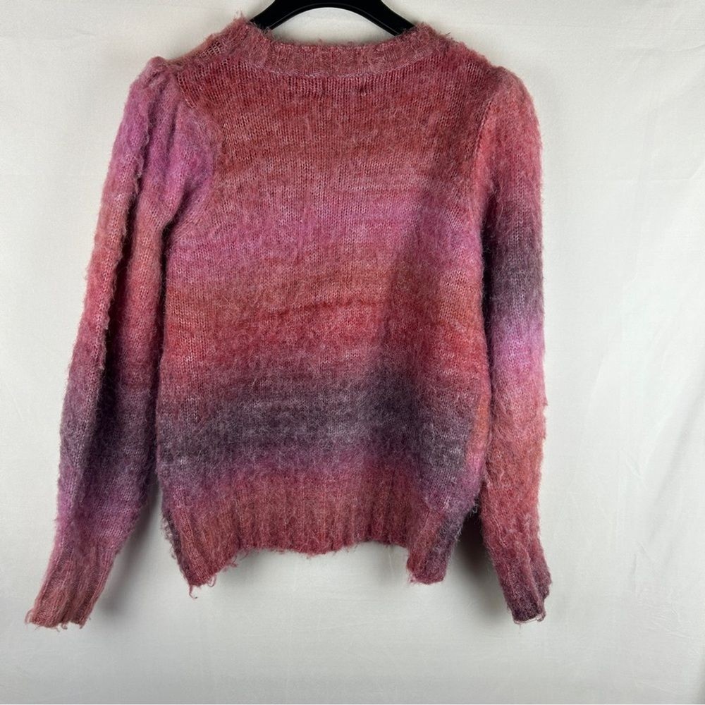 Frnch Noelia Puff Sleeve Sweater Fuzzy size Large Fuzzy sweater with puff sleeves featuring dreamy dip dye design. Size Large * Crewneck * Long sleeves * Ribbed cuffs and hem * Pullover style * Polyester/acrylic Shoulder: 17” pit to pit: 22” length: 25” Bundle with other items to save on shipping and discounts! Reasonable offers welcome! S