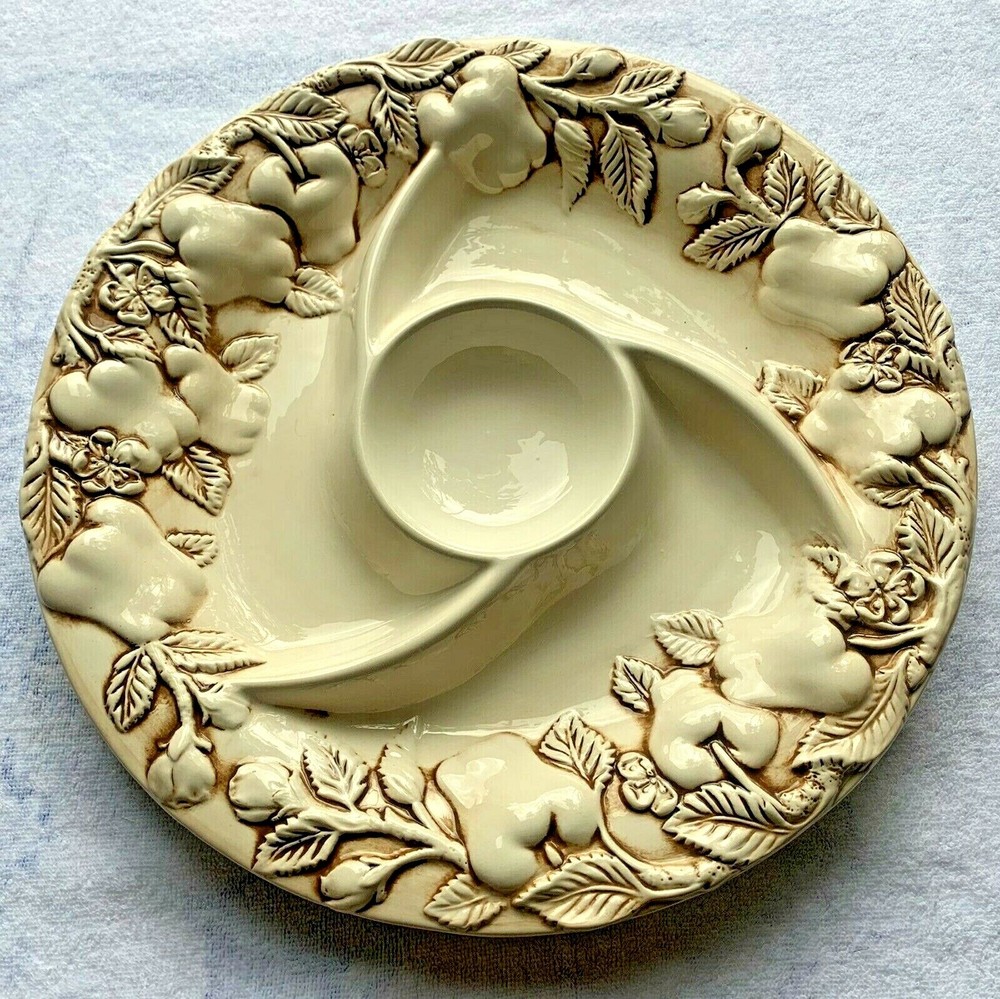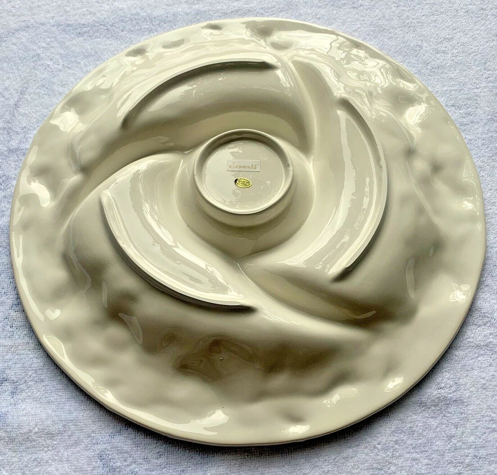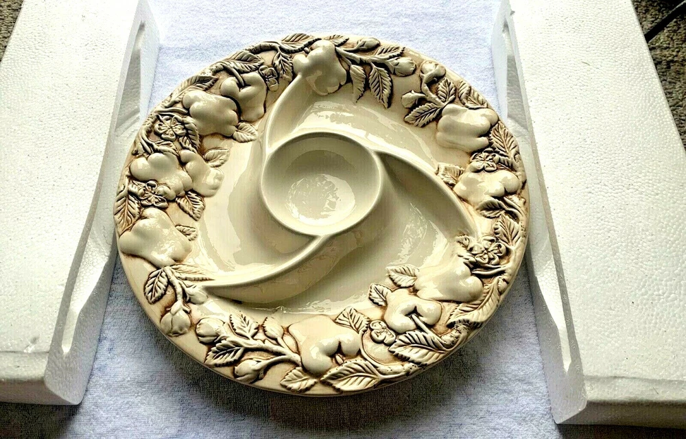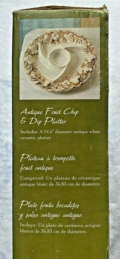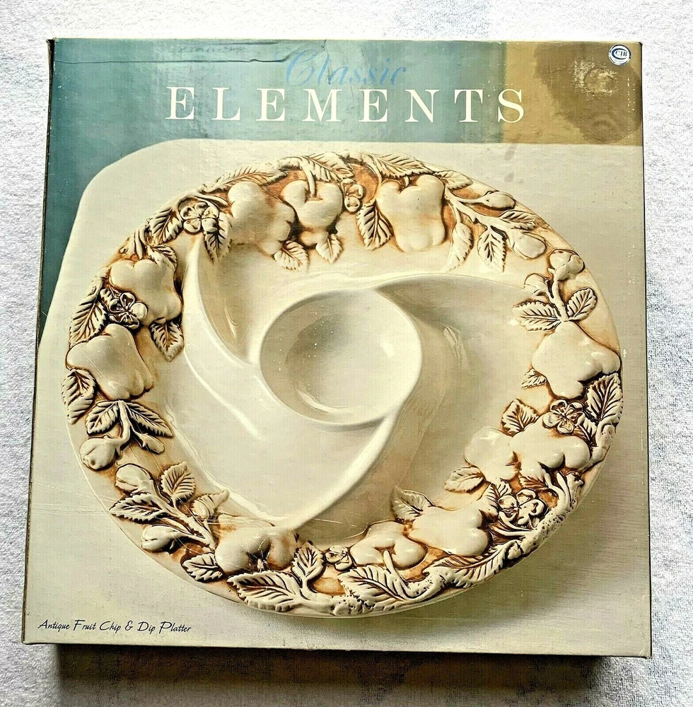 Beautiful Elements Antique Fruit Chip & Dip Platter. The platter is 14.5” in Diameter. Makes a great platter for entertaining, a wedding, fun party, or housewarming gift! ! Condition is Excellent, this is New in Box & Unused, unopened box, only opened to validate the beautiful platter as new. Kept in an A/C Controlled, Non-Smoking & Pet Free Environment. POLICY: This item is sold “AS IS”. IF Wear is noted in the description above. I describe all of my items to the best of my ability. No Returns. Thank You