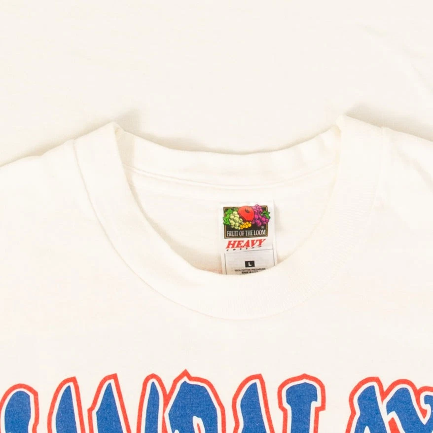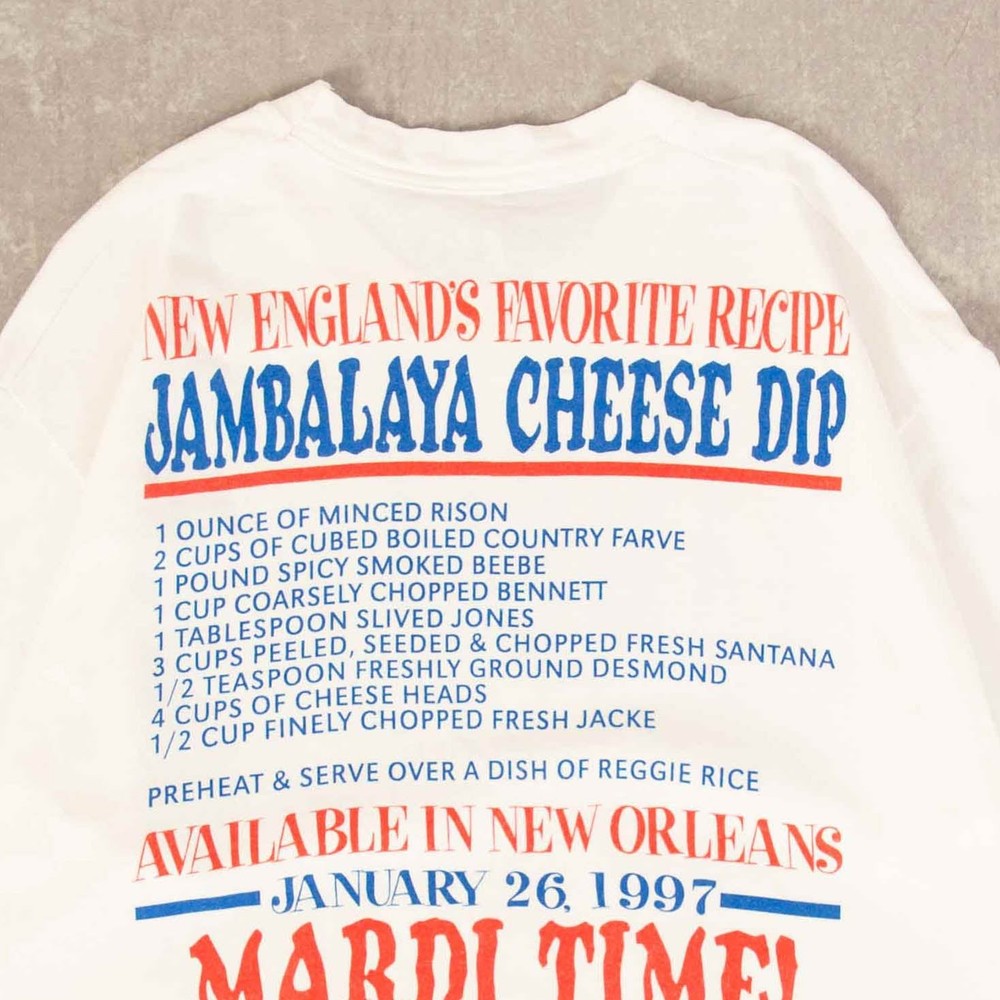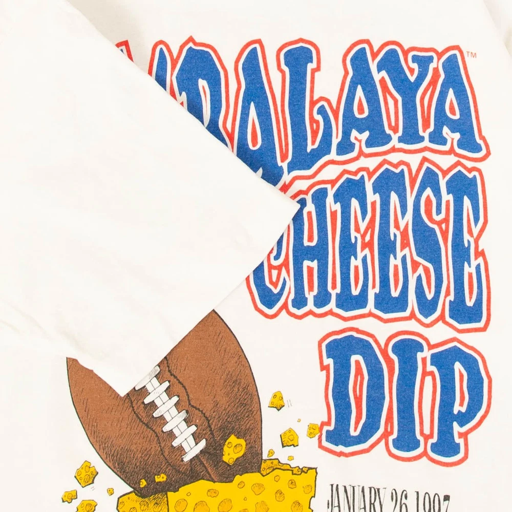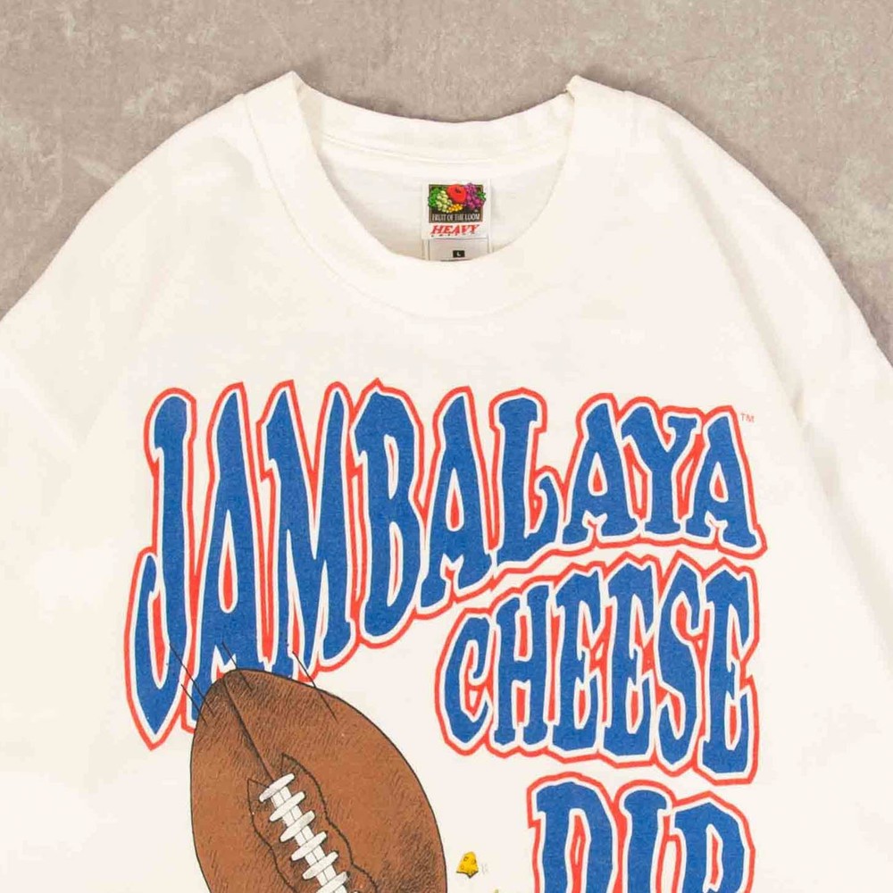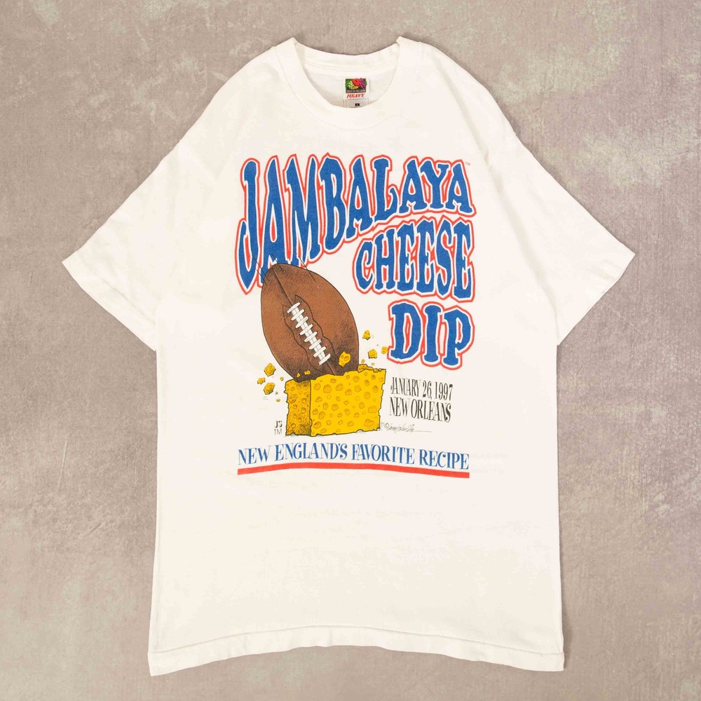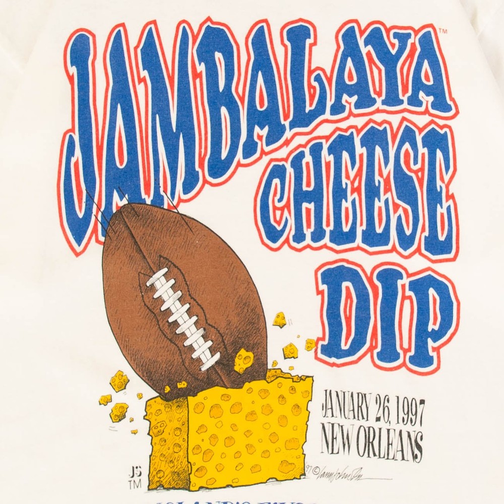 Men's Vintage 1997 Jambalaya Cheese Dip Single Stitch T-Shirt + Tag: Fruit of the Loom + Made In USA + Material: Cotton Blend + Colour: White + Size Label States: Large + Recommended Size: Large + Measurements (Inches): Pit To Pit = 21, Body Length = 31 Please note that all vintage items have been previously worn, and may show some signs of previous wear. However, any significant damage will be photographed and/or stated in the items listing. Please note that damage to the inside may not always be photographed or listed.