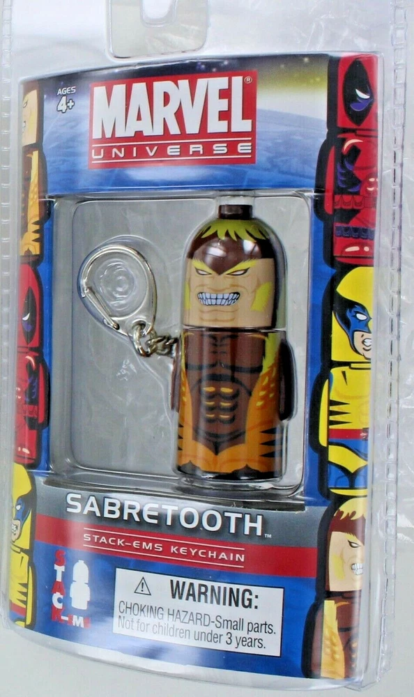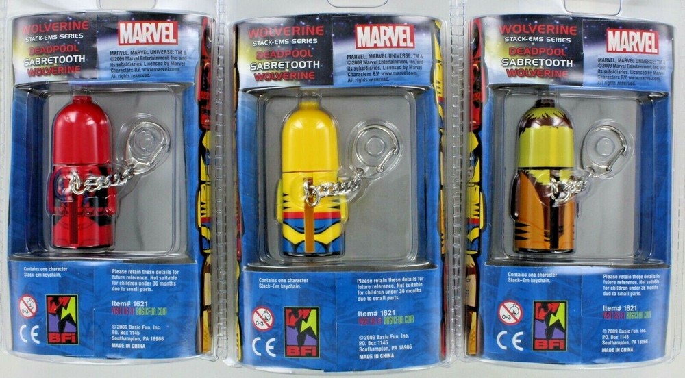 Marvel licensed Set of All 3 Marvel Universe Wolverine Series Stack 'Em Keyrings Deadpool - Sabretooth - Wolverine Officially licensed and brand these Marvel Universe Wolverine Series Stack 'Em Keychains are fun and collectible. The unique design allows you to stack them and make new combinations. *2009 retired collector's item* Collect all 3 Marvel Universe Series 1 Stack 'em Keychains: Incredible Hulk, Iron Man, Spider-Man and all 3 Wolverine Series: Wolverine , Deadpool , Sabretooth Each Marvel Universe Stack 'Em Keychain measures about 2.5" tall and is attached to a metal keychain that includes a metal clasp. Each keychain is brand new and sealed in the manufacturer's original package and is a genuine Marvel licensed collectible manufactured by Basic Fun circa 2009. Great for backpacks, trips and Super Hero collectors! Click here to see more MARVEL licensed collectibles! ~ . ~ Cool gift idea for stocking stuffers, Easter baskets, party favors or just because! ~ . ~ Buy with confidence (please review my feedback). I am happy to provide a discount on shipping for multiple items paid for and shipped at the same time, so be sure to stop by my eBay store: Kat's Home and Hearth for more cool stuff! Please don't hesitate to contact me if you have any questions. Delivery confirmation tracking is included in the US. International Buyers – Please Note: Import duties, taxes, and charges are not included in the item price or shipping cost. These charges are the buyer's responsibility. Please check with your country's customs office to determine what these additional costs will be prior to bidding or buying. CLICK HERE TO SEE MORE Marvel Collectibles! Thanks for looking and have fun collecting!