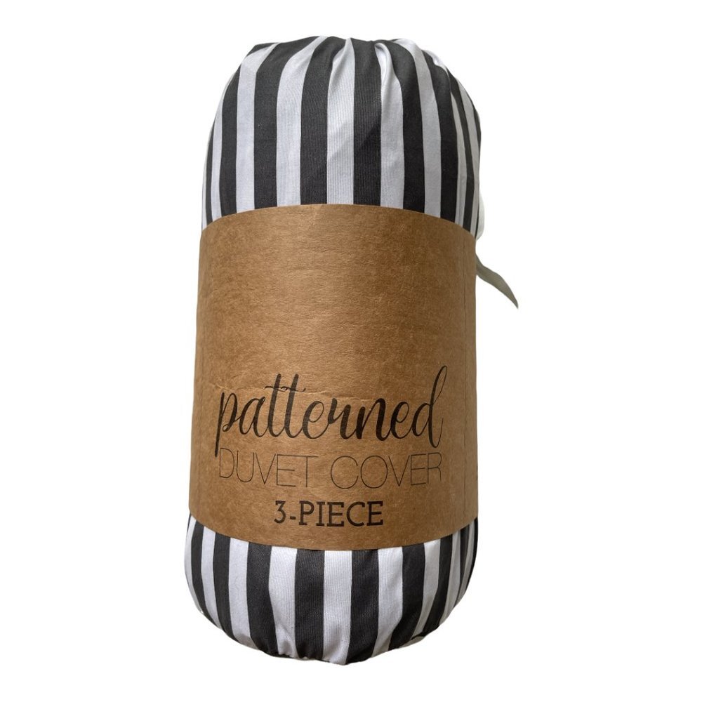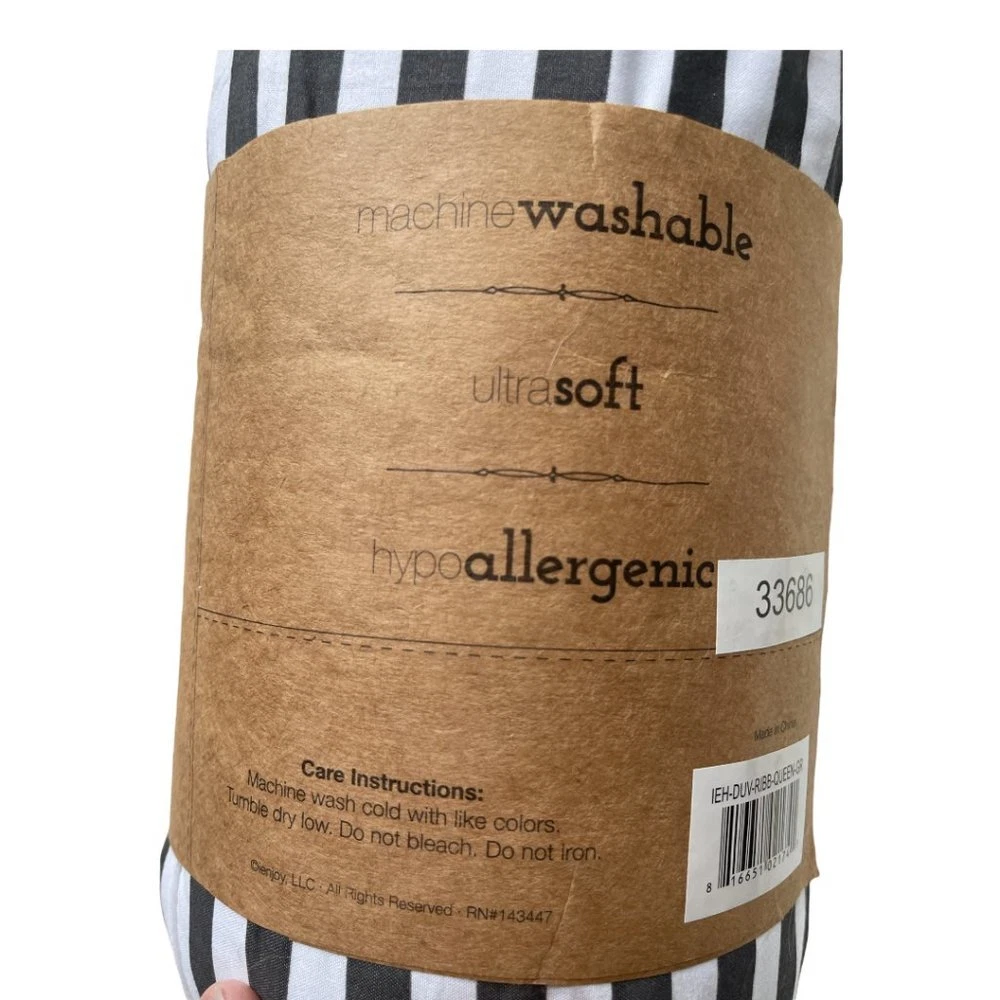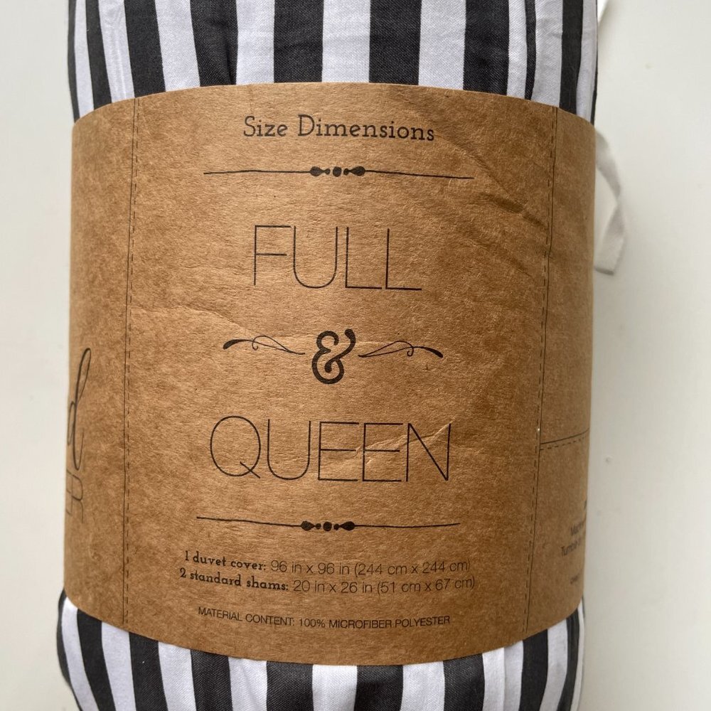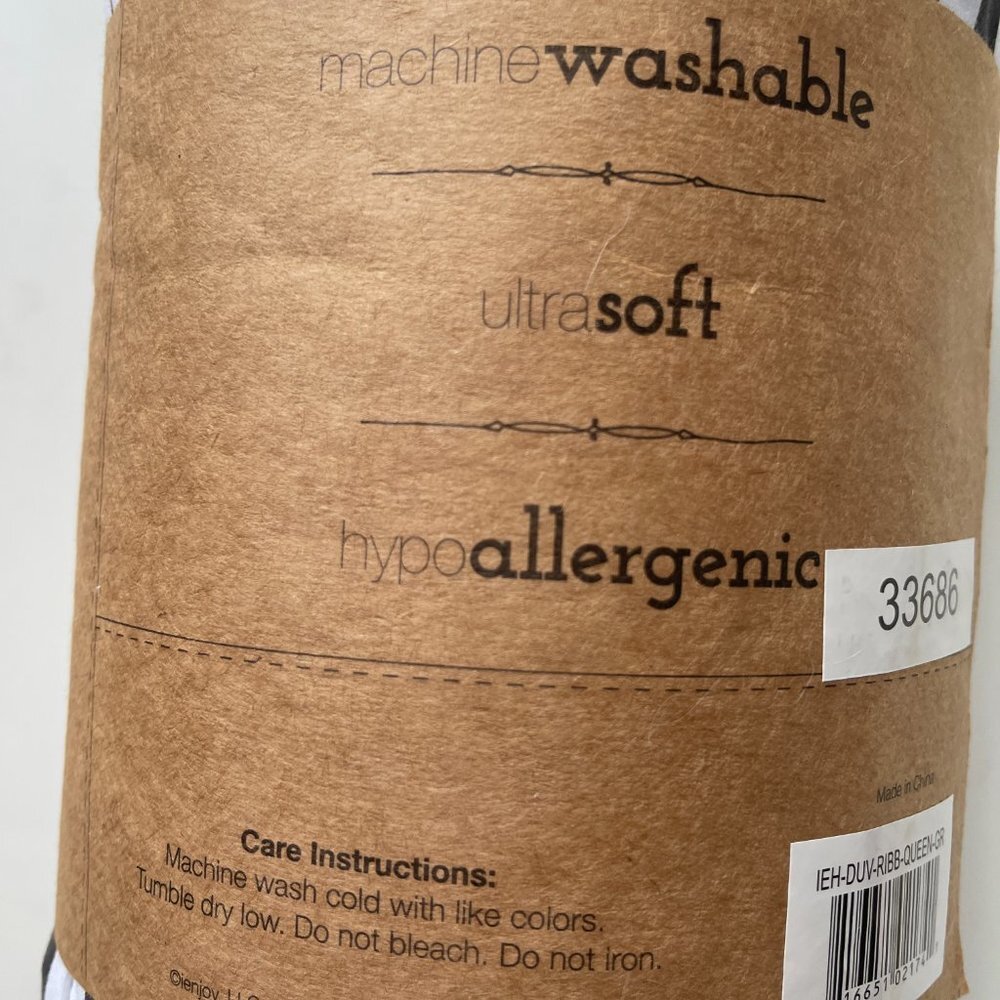 Full/Queen iEnjoy Gray and White Striped Duvet Cover 3 piece set, NWT Size Full/Queen NEW WITH TAGS/PACKAGING What I Love About It: On trend Gray and White Striped Duvet set for full/queen. It has never been out of the package. Super soft microfiber. Pet and Smoke free environment. Measurements are approximate. Pant length measurement is always taken on the inseam.