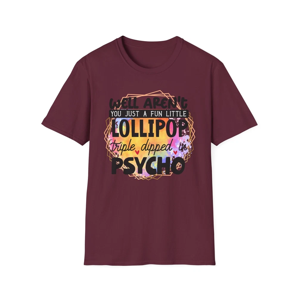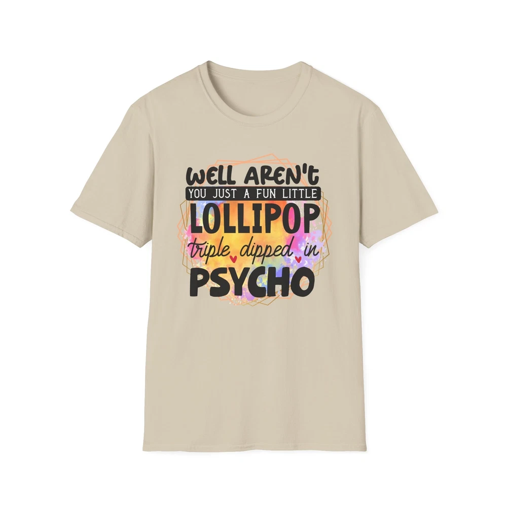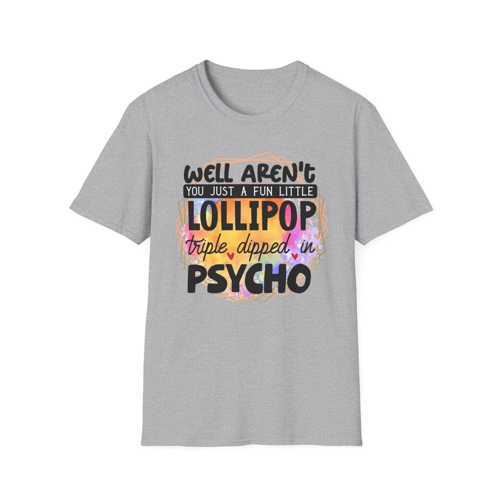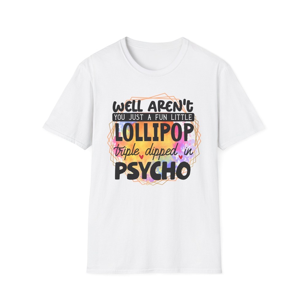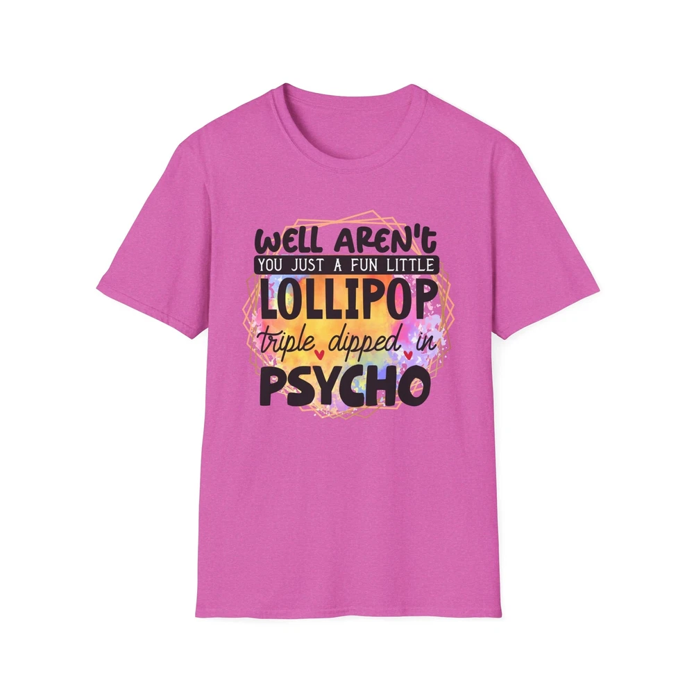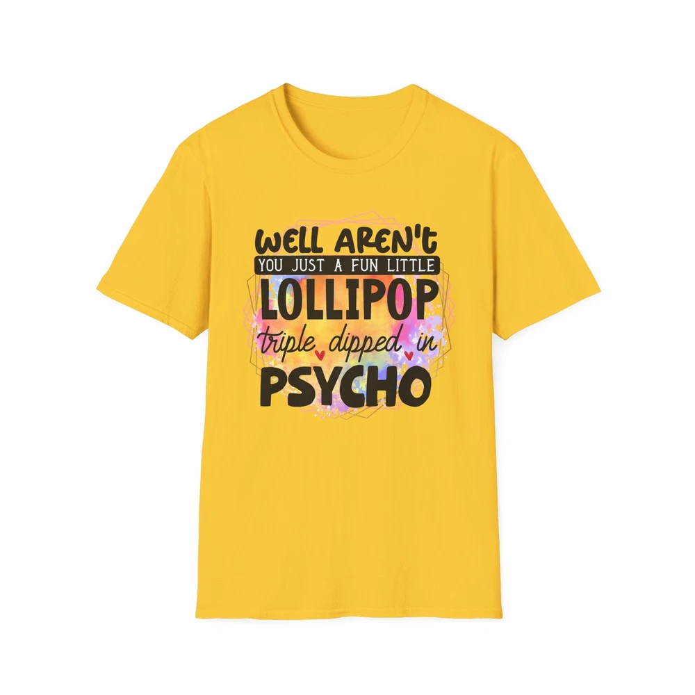 This 'well aren't you a fun little lollipop dipped in psycho' T-shirt is the perfect addition to any sarcasm lover's wardrobe. It exudes a cozy and laid-back vibe, making it ideal for casual outings, lounging at home, or grabbing coffee with friends. This T-shirt is relevant to coffee enthusiasts and those who prioritize comfort and style in their everyday wear. It's perfect for celebrating National Coffee Day or as a thoughtful gift for a coffee lover in your life. Product features - Made from durable and smooth 100% ring-spun cotton fabric - Classic fit with a crew neckline for versatile styling - Ethically grown and harvested US cotton for sustainable production - Variety of fabric blends available for different color options - Features a tear-away label for total wearing comfort Care instructions - Do not dryclean - Do not bleach - Tumble dry: low heat - Iron, steam or dry: low heat - Machine wash: cold (max 30C or 90F), with similar colors