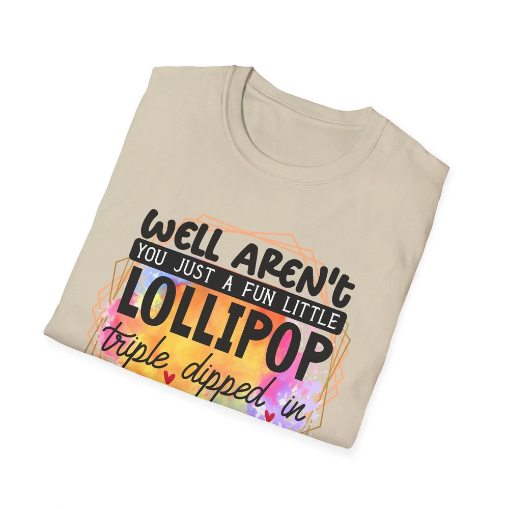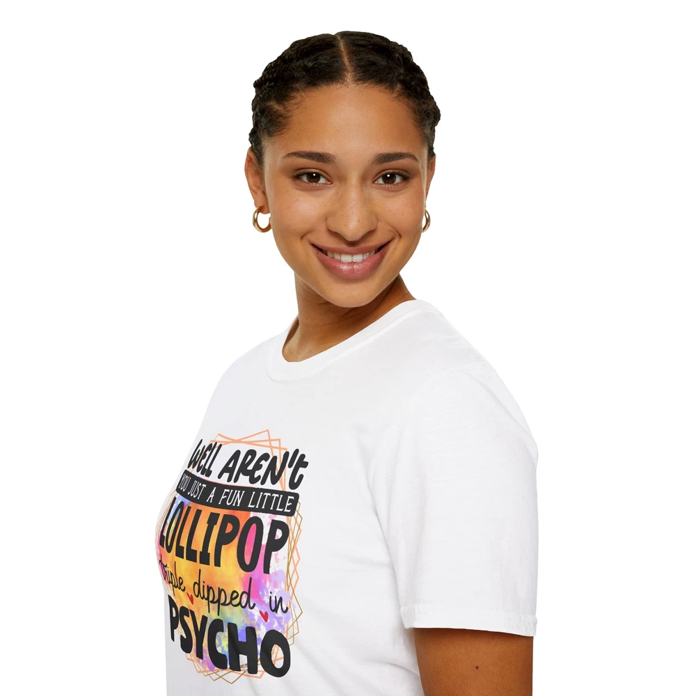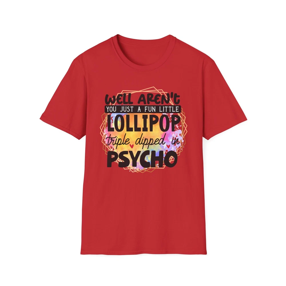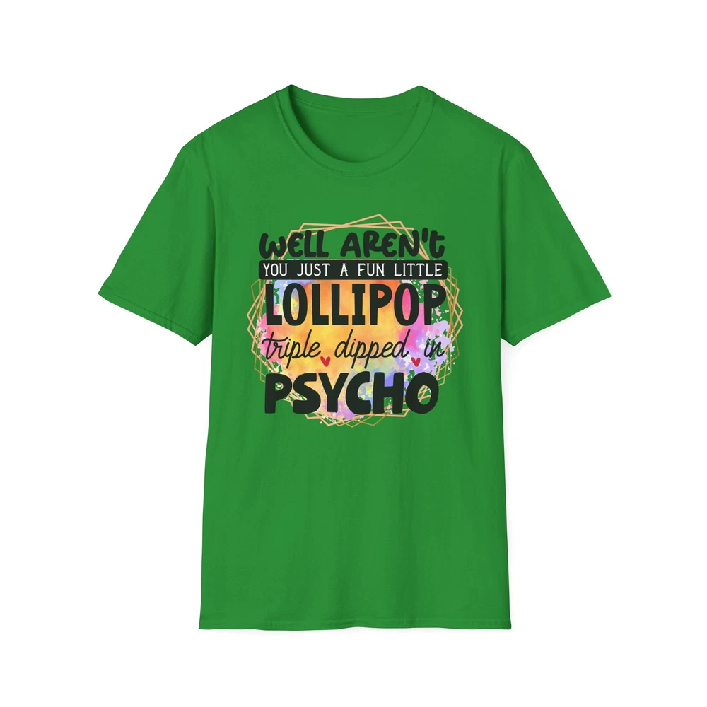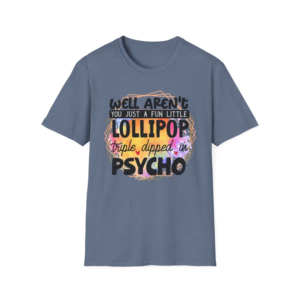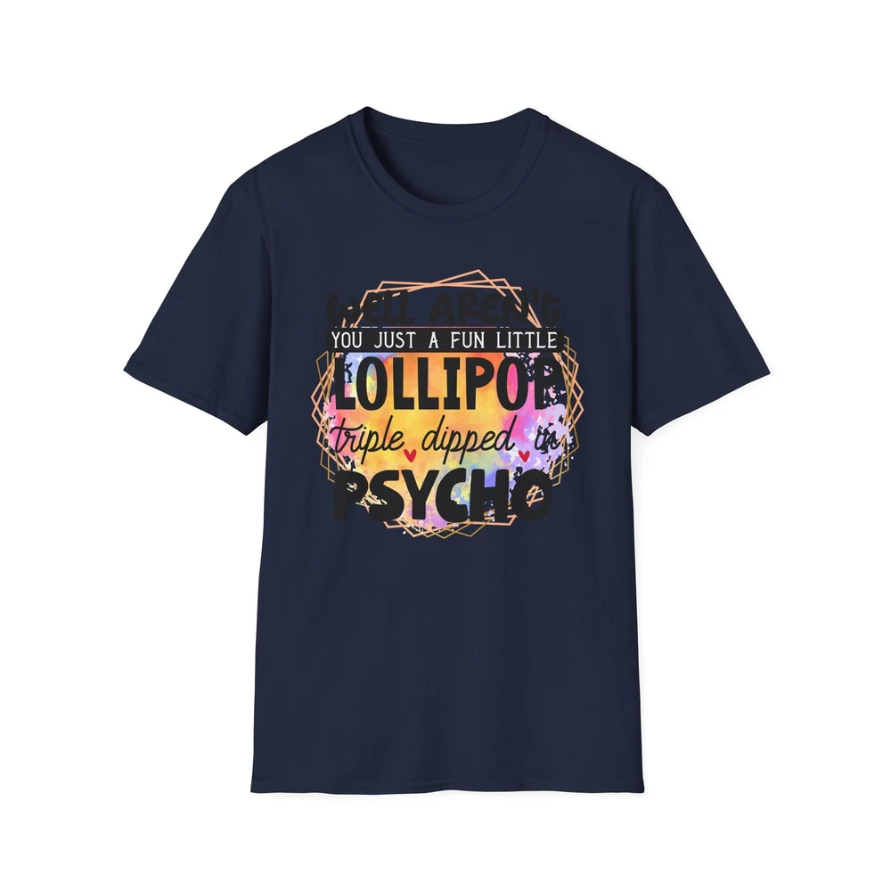 This 'well aren't you a fun little lollipop dipped in psycho' T-shirt is the perfect addition to any sarcasm lover's wardrobe. It exudes a cozy and laid-back vibe, making it ideal for casual outings, lounging at home, or grabbing coffee with friends. This T-shirt is relevant to coffee enthusiasts and those who prioritize comfort and style in their everyday wear. It's perfect for celebrating National Coffee Day or as a thoughtful gift for a coffee lover in your life. Product features - Made from durable and smooth 100% ring-spun cotton fabric - Classic fit with a crew neckline for versatile styling - Ethically grown and harvested US cotton for sustainable production - Variety of fabric blends available for different color options - Features a tear-away label for total wearing comfort Care instructions - Do not dryclean - Do not bleach - Tumble dry: low heat - Iron, steam or dry: low heat - Machine wash: cold (max 30C or 90F), with similar colors