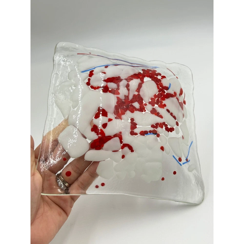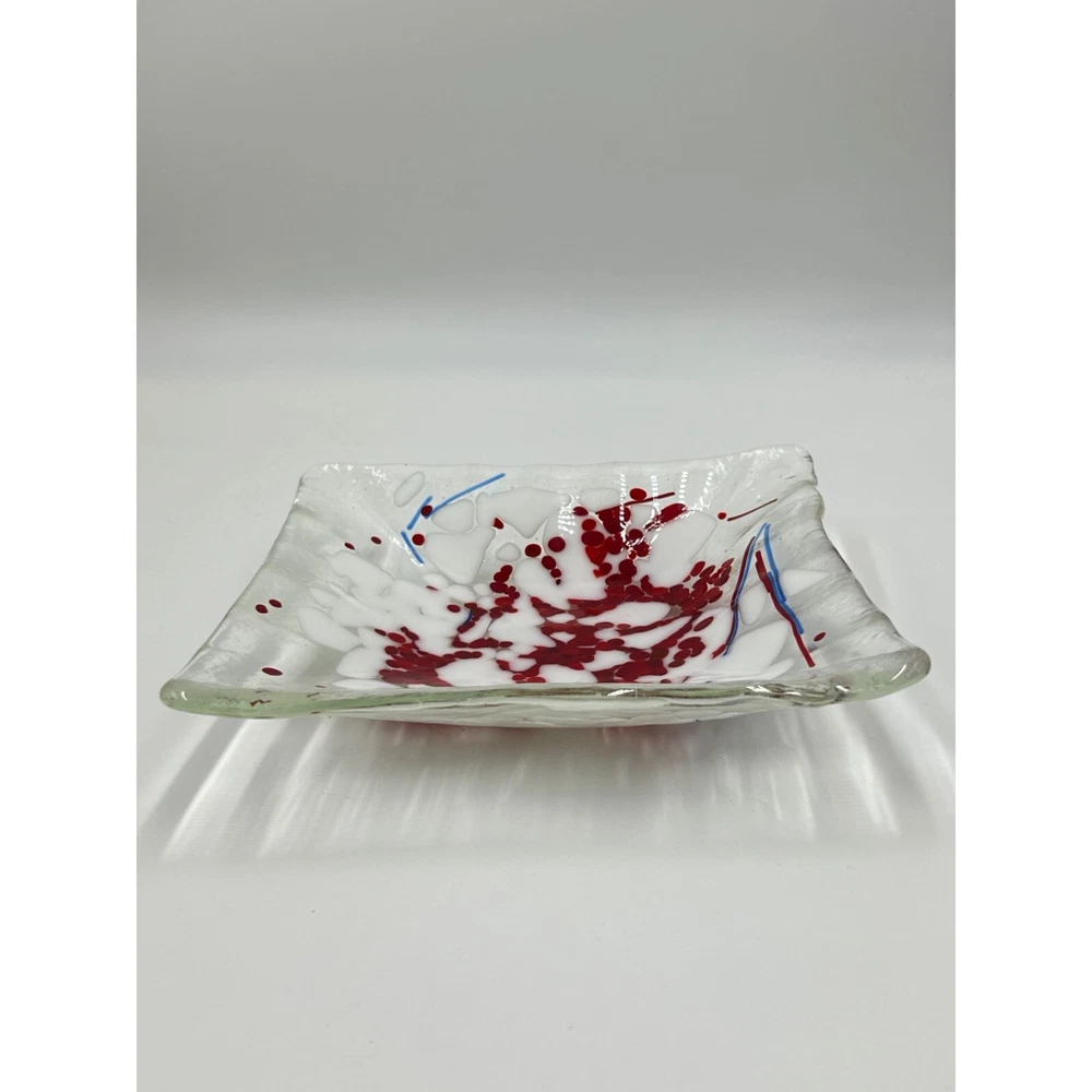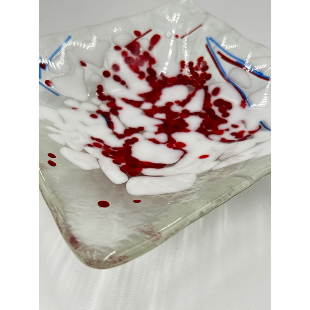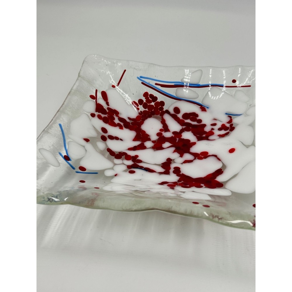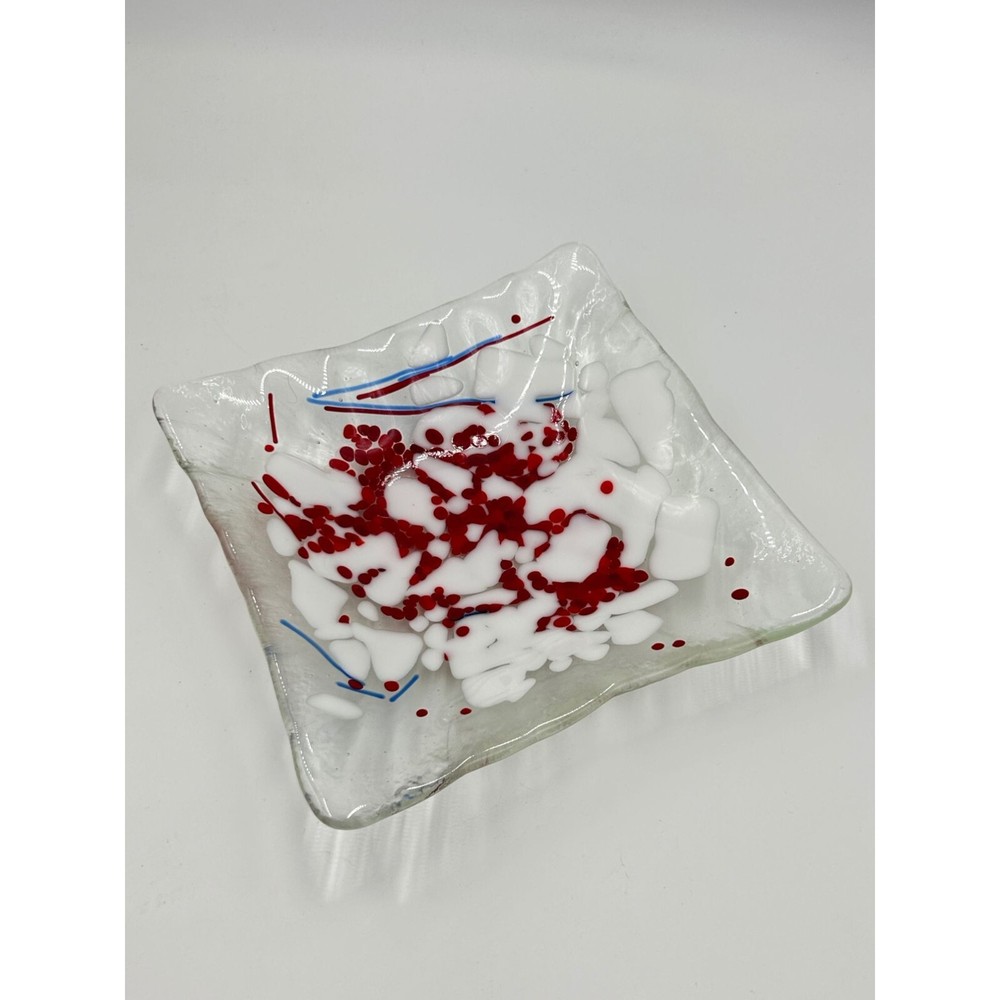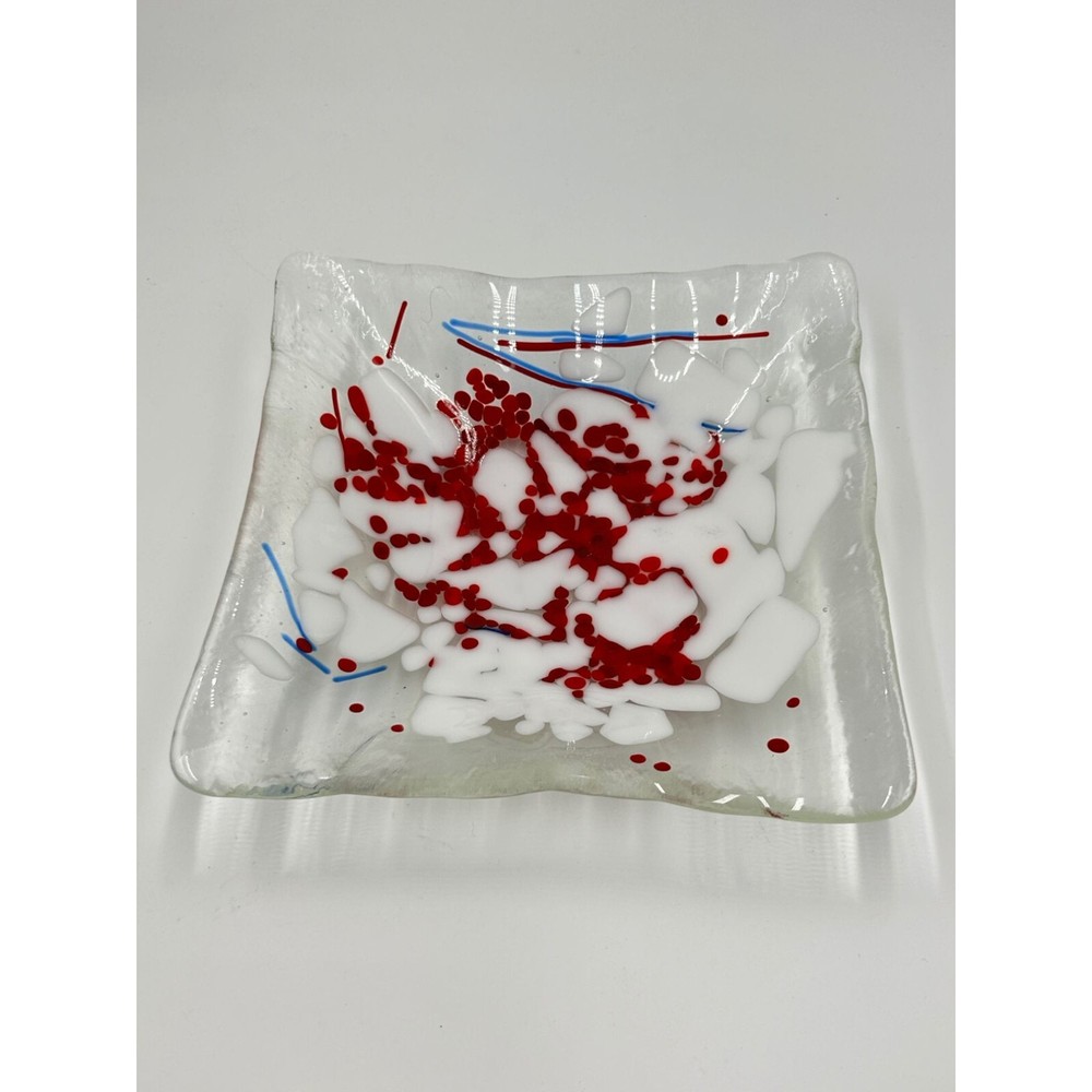 Fused Glass Art Glass Studio Plate Trinket Dish Red Splatter White Clear Square This listing is for a red splattered square trinket dish designer marked: - condition: very good measurement: 7.5" square Please be aware that pictures are an important part of my description, please look at all photos and zoom in if needed. All my items are previously owned, I inspect everything carefully and try my best not to list items with major flaws or damage. Vintage and antique items often have wear, it is normal if they do. Features: • Trinket Dish Size: 7.5" square Condition: Pre-Owned Good