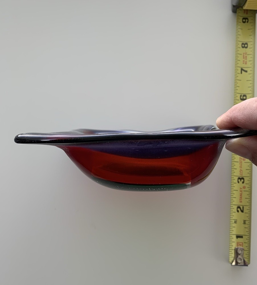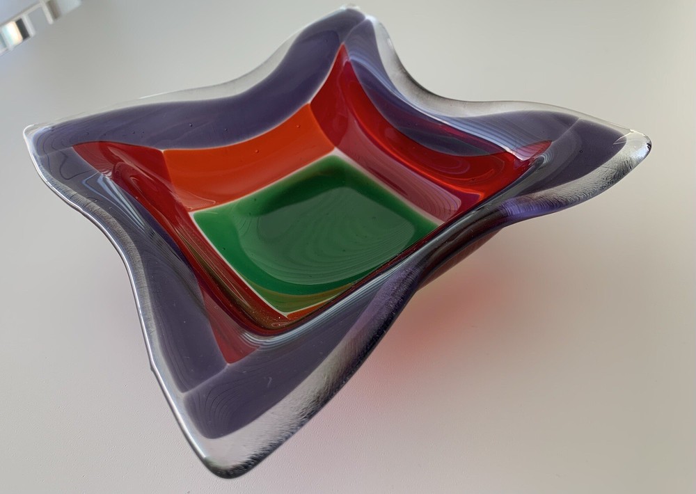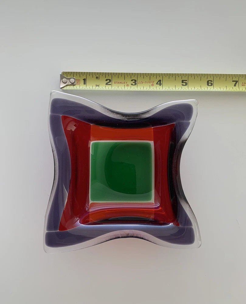 This stunning fused glass bowl is a must-have for any mid-century modern decor enthusiast. The square shape and vibrant multicolor geometric pattern make it a unique and eye-catching piece that is perfect for all occasions. The bowl stands at 1.75 inches tall and is handmade with polished finish. It is a decorative bowl that can be used as a candy or nut dish. It could also be used for a candle. The bowl is an original, unmarked art glass production made to replicate the mid-20th century era. The production technique used for this bowl is fused glass. Add this Century fused studio art glass bowl to your collection today!