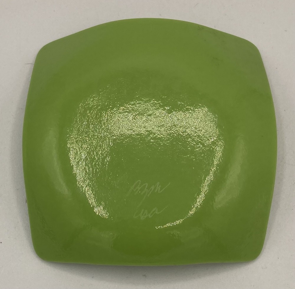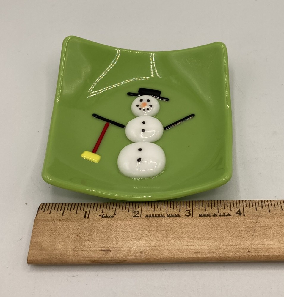 Fused Art Glass Green Snowman Square Trinket Dish Signed Lisa? See pictures