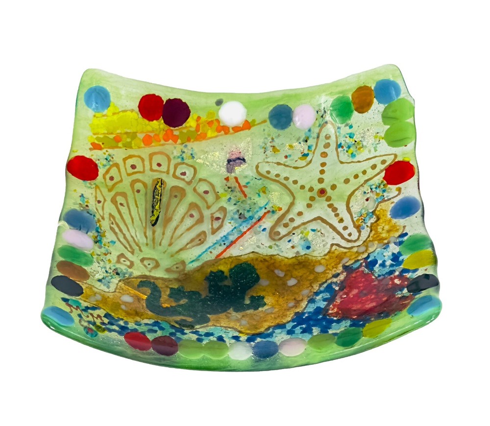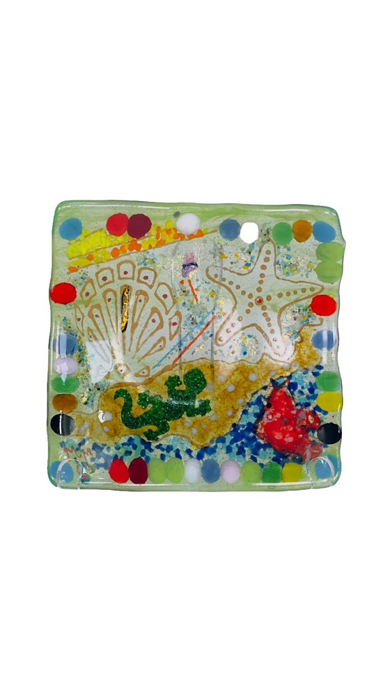 This colorful handmade 8 x 8 inch rectangular tide pool design glass bowl, with a height of 2-1/2 inches, brings together a myriad of vibrant shiny layered colors into one sparkling glossy bowl. Design features starfish, scallop shell, angel fish, and gecko on sand. Used as a bowl or display centerpiece, in addition, it brings compliments for its brilliance. This is a glass bowl that just glows with its multi color ocean design. The layering of the glass, moreover, result in greater brightness from multiple colors Approximate Dimensions: 8” L X 8” W X 2-1/2” H In excellent preowned condition with no chips, cracks, breaks, or repairs. No box.