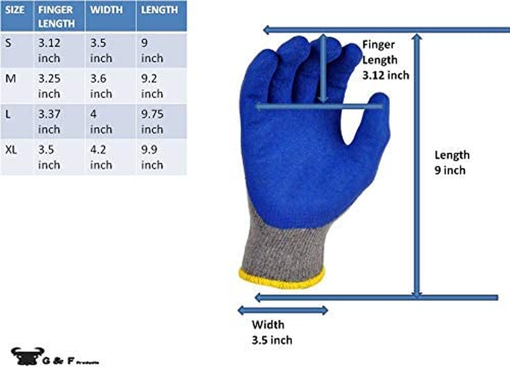 Store New Arrivals Add to Favorite View Feedback Contact G & F Products - 3100L-Dz-Parent 12 Pairs Large Rubber Latex Double Coated Description Item model number 3100L-DZ Item Package Quantity 1 Style General Purpose Included Components 12 pairs of work gloves Part Number 3100L-DZ-Parent Color Ocean Blue Pattern Gloves Product Dimensions 30 x 15 x 15 inches Material Rubber Country of Origin China Batteries Required? No Number Of Pieces 1 Thickness 0.3 Inches Item Weight 1 pounds Is Discontinued By Manufacturer No Batteries Included? No Special Features Lightweight, Abrasion Resistant, Palm Coated, Anti Vibration, Eco-Friendly Size Large (Pack of 12) Special Feature Lightweight, Abrasion Resistant, Palm Coated, Anti Vibration, Eco-Friendly Brand G & F PRODUCTS Manufacturer G & F Blended poly and cotton Imported This bulk pack of reusable knit work gloves are perfect for people who always need a pack of durable work gloves in hand. These latex dipped gloves are handy for construction, warehouse work, gardening, mechanic work, moving, landscaping, taking out the garbage, and other manual labor type activities that require you to keep your hands protected and covered Double dipped latex coating provide extra heavy duty Cotton blend technology, rubber coated with Blue latex With this bulk pack of work gloves, you will never need to look around or try to buy gloves last minute. Throw a pair in the glove box in case you need to change your tire. Leave a couple pairs in your shed, basement, kitchen, bathroom or wherever else you might need to get hands on sold by Dozen 12 Pairs Product Description Double Coated Palm - exclusive natural rubber blend texture coating technology - We G & F Protect You From the Manufacturer Blue Latex coated gloves are the most popular and widely recognized work gloves on the market. There is no competitor's gloves that compare to the durability of these gloves. This glove has a blue, flexible latex palm and finger coating over a durable knit. ABOUT US We offer the best prices around on high quality products. Our E-store includes media such as books, movies, music and games while offering electronics, toys, sporting apparel, clothing, tools, general home, garden items and more. SHIPPING We are always working hard to ensure your package arrives as soon as possible. Please understand that some factors like weather, high postal traffic, and the performance of shipping companies are outside of our control. We offer free shipping to the lower 48 states and ship within 2 business days of payment, usually sooner. We do not accept P.O. Boxes. Please provide a physical address. RETURNS We offer a 30-Day Return Policy on items which you are not completely satisfied with. You have the option for a full-refund or an exchange of the item. No returns are available on items shipped outside of the USA. PAYMENT We accept PayPal. CONTACT US This page content is yet to come Please ad us to your favorite seller and visit again later Thank You CUSTOMER SATISFACTION We try our very best to make sure every customer is completely satisfied. If there's a problem, message us! We're happy to help.