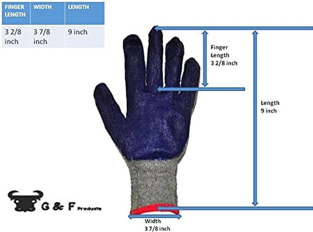 Store New Arrivals Add to Favorite View Feedback G & F Products 3108-10 String Knit Palm, Latex Dipped Work Gloves, Nitrile Coated Work Gloves for General Purpose, 10-Pairs per Pack,Blue, Large Description Item model number 3108-12 Item Package Quantity 1 Style Classic Pattern Name Work Gloves Included Components 10 Pairs of gloves Part Number 3108-12 Color Blue Pattern Work Gloves Product Dimensions 5.5 x 2.8 x 9.6 inches Material Rubber Country of Origin China Batteries Required? No Number Of Pieces 1 Item Weight 1.54 pounds Is Discontinued By Manufacturer No Batteries Included? No Special Features Work Safe Size 10 Count (Pack of 1) Special Feature Work Safe Brand G & F PRODUCTS Manufacturer G & F 100% Cotton Made in the USA and Imported ✅ PREMIUM QUALITY MATERIAL: Made from 100% cotton with a flexible blue latex coating, these gloves deliver an exceptional combination of comfort, durability, and reliable hand protection. The latex material ensures your hands are shielded from rough surfaces, abrasions, and dirt while providing a high level of flexibility for various tasks. ✅ COMFORTABLE & BREATHABLE DESIGN: The string knit construction promotes airflow, keeping your hands cool and dry even during long hours of use. The breathable fabric reduces sweating, making these gloves a comfortable choice for any task that requires extended wear. Ideal for warm and cooler environments alike, these gloves ensure all-day comfort. ✅ VERSATILE & MULTI-USE: Whether you’re gardening, performing warehouse duties, or tackling light construction projects, these gloves are the perfect solution. Their versatile design makes them suitable for a wide range of indoor and outdoor activities. From handling materials and tools to general maintenance, these gloves are a must-have for a variety of work situations. ✅ RELIABLE GRIP & PROTECTION: Featuring a latex-coated palm and fingers, these gloves provide a secure, non-slip grip for tasks that require precision. The latex coating also acts as a protective barrier against rough objects and minor punctures, giving you the confidence to handle a wide variety of materials safely without compromising on comfort. ✅ Eco-Friendly & Reusable: These gloves are designed for long-term use, making them an environmentally friendly choice. After use, simply wash and reuse them, which helps reduce waste and cuts down on the need for single-use gloves. Their durability and reusability offer excellent value for money, while still providing the same level of protection each time you wear them Product Description Blue Latex coated gloves are the most popular and widely recognized work gloves on the market. There is no competitor's gloves that compare to the durability of these gloves. This glove has a blue, flexible latex palm and finger coating over a durable knit From the Manufacturer Blue Latex coated gloves are the most popular and widely recognized work gloves on the market. There is no competitor's gloves that compare to the durability of these gloves. This glove has a blue, flexible latex palm and finger coating over a durable knit ABOUT US We offer the best prices around on high quality products. Our E-store includes media such as books, movies, music and games while offering electronics, toys, sporting apparel, clothing, tools, general home, garden items and more. SHIPPING We are always working hard to ensure your package arrives as soon as possible. Please understand that some factors like weather, high postal traffic, and the performance of shipping companies are outside of our control. We offer free shipping to the lower 48 states and ship within 2 business days of payment, usually sooner. We do not accept P.O. Boxes. Please provide a physical address. RETURNS We offer a 30-Day Return Policy on items which you are not completely satisfied with. You have the option for a full-refund or an exchange of the item. No returns are available on items shipped outside of the USA. PAYMENT We accept PayPal. CONTACT US This page content is yet to come Please ad us to your favorite seller and visit again later Thank You