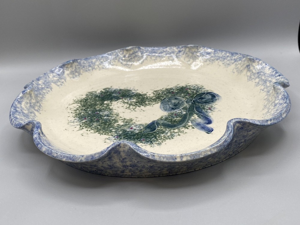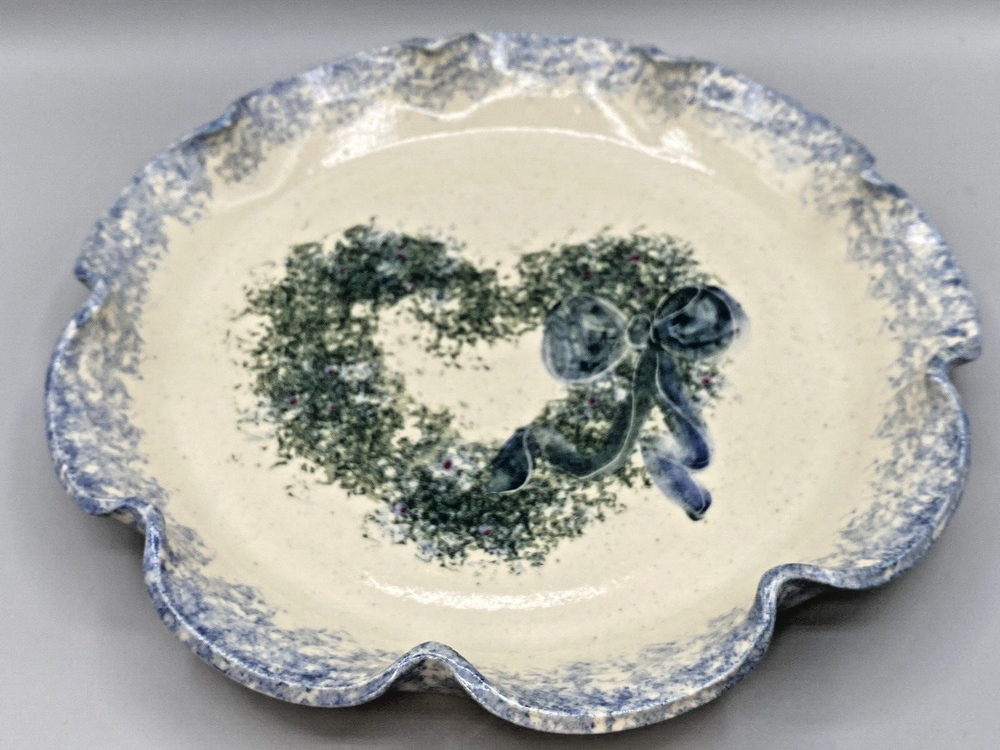 G Miller Studio Pottery Blue Spongeware Fluted Plate Heart Wreath w/Bow 11.5" W Please see photos for details