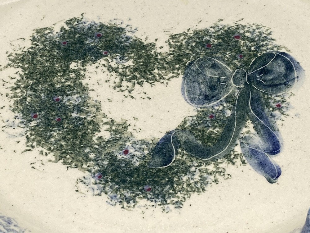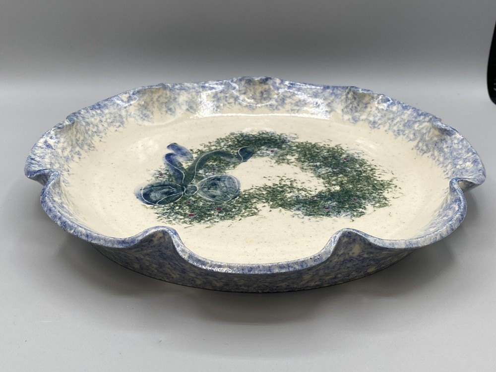 G Miller Studio Pottery Blue Spongeware Fluted Plate Heart Wreath w/Bow 11.5" W Please see photos for details...