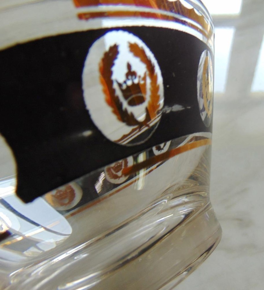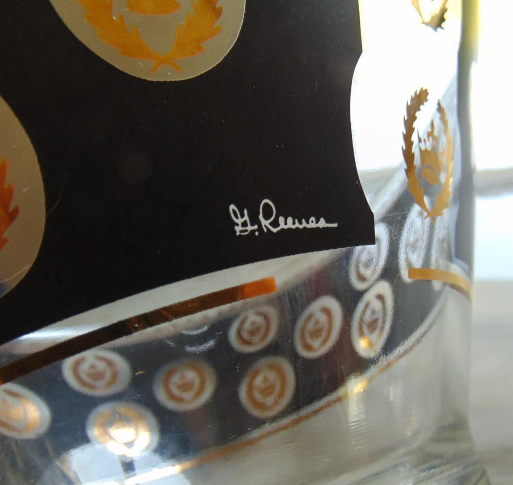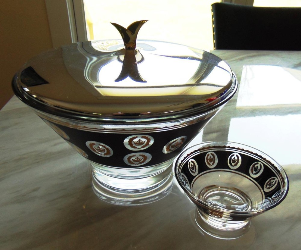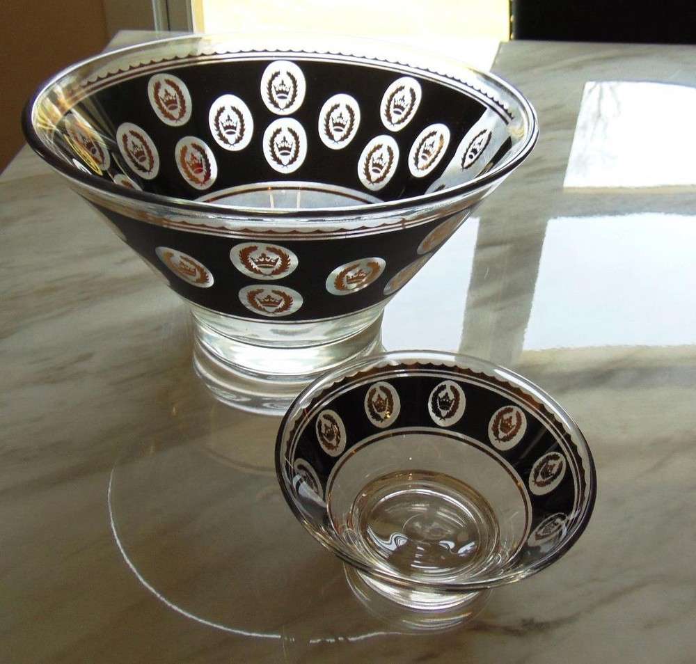 This chip and dip set is signed G. Reeves. The pattern features gold crowns inside laurel wreaths with black band and gold accent trim. There is no clip-on rack for the dip bowl. The large bowl is 10 1/2 inches in diameter. The dip bowl is 5 inches in diameter. This set was being used with a Kromex lid that may or may not be original to the set, but it looks nice and fits the MCM era design style so it is included. Get images that make Supersized seem small. THE simple solution for eBay sellers.
