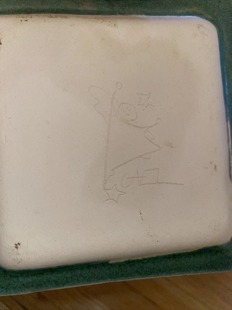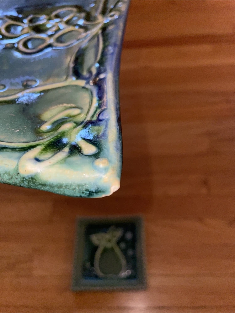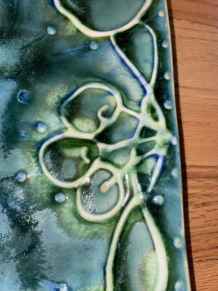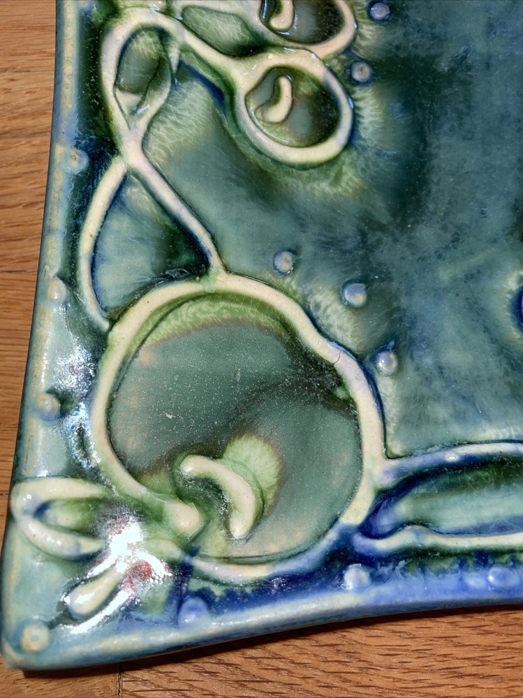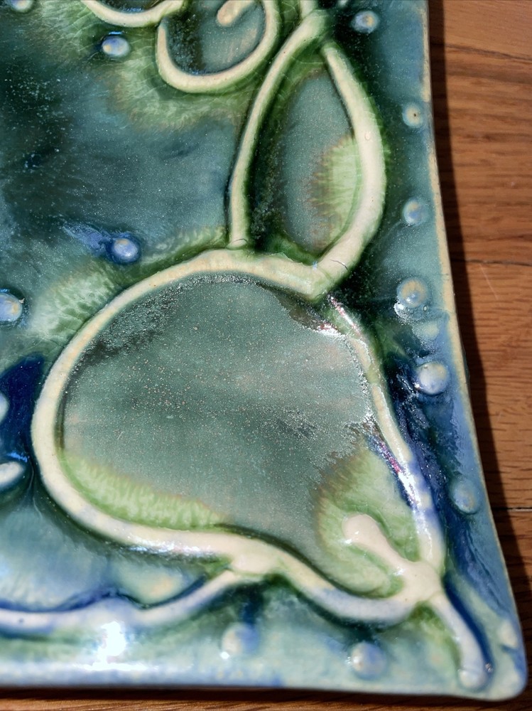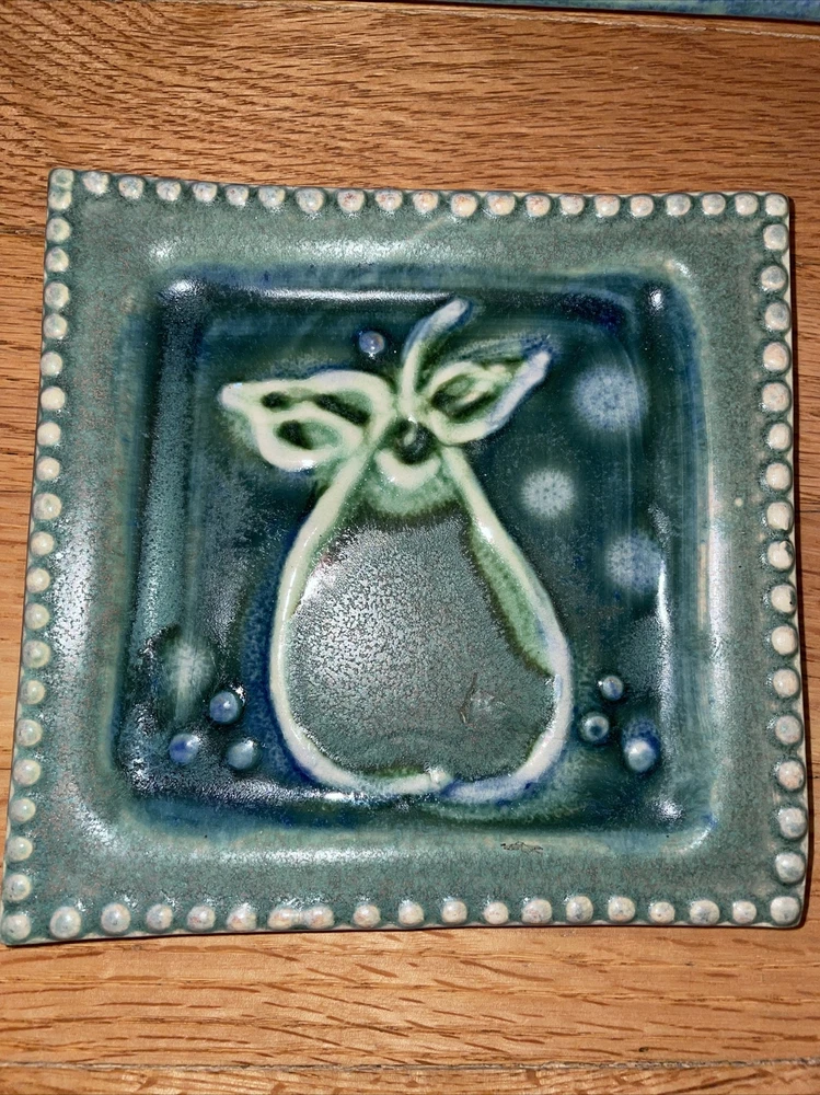 This is a gorgeous set of studio art pottery by Gael Hiller. The large tray measures 11" x 11" and the small dish is 6" x 6". The large tray has a fruit motif of different fruits around the edge; pears, grapes, cherries, apples. The small side dish has a pear on it. The color of these pieces is just beautiful. It is shades of green with cobalt blue. Great condition with no chips or cracks. One corner has a very small rough spot. See pix, Signed on the back of both pieces GAEL. Shipping $13.95 I strive for happy customers so please email me any questions or prior to leaving neutral or negative feedback; I always work with my customers for their satisfaction. See my eBay store 'Sweetjerez' for more unique items as I combine shipping when possible. Most of my pre-owned items have been cleaned and wiped with antibacterial wipes as appropriate. BID WITH CONFIDENCE! I entertain all fair offers. Thank you for looking.