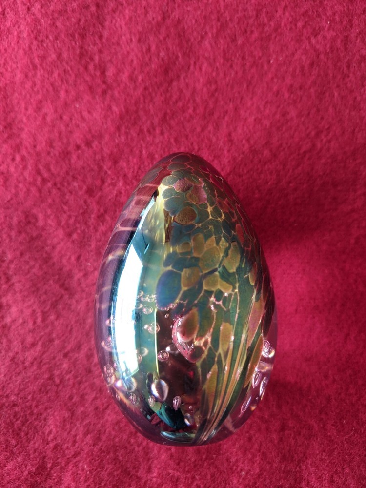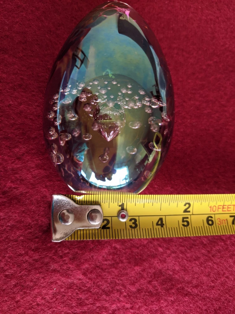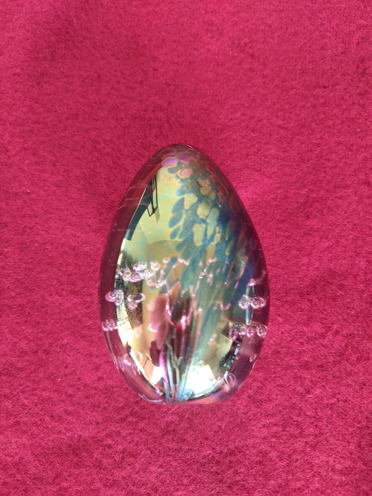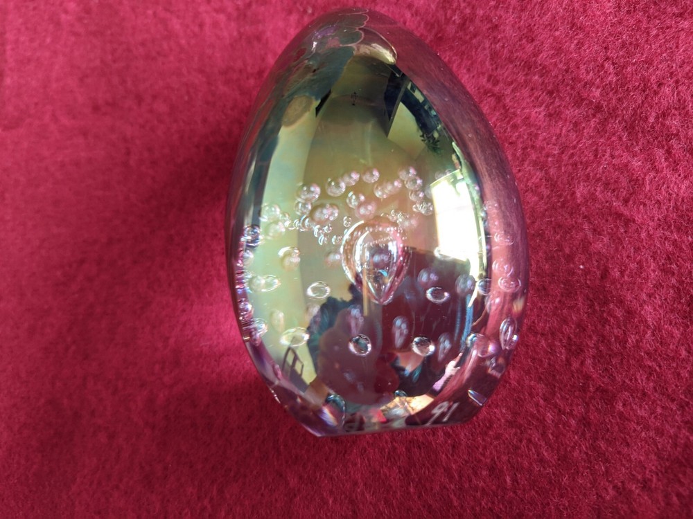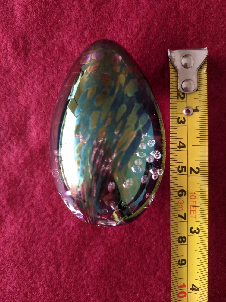Collectible Glass Eye Studio GEL 1991 Glass Egg Paperweight Art Decor * Stunningly beautiful iridescent glass egg with Glass Eye Studio signature. Great as the perfect birthday, wedding or anniversary gift or as collectible. * This individually crafted rare piece is marked with "GES 91" near the bottom of the egg. Note the signature is not at the bottom but near the bottom. * See photos for measurements and cosmetic condition. Please note photos have some background reflections. Note: If buyer requests cancellation after purchase or if local buyer fails to pick up within 30 days, buyer will be charged $3 cancellation fee prior to refund. Upon par tial refund (after deducting cancellation fee), this purchase will be marked as "shipped" or "picked up" without tracking n umber to complete the cancellation process. By making this purchase, buyer agrees to the above cancellation process.