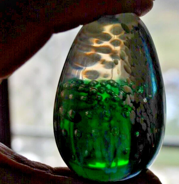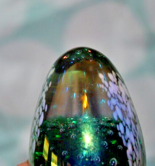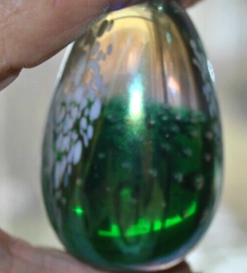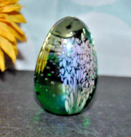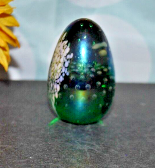For your consideration is a fascinating GLASS EYE STUDIO, iridescent paperweight that was made in 1992. If you look into the front and back sides you can see an array of controlled bubbles with a large teardrop bubble at the bottom. The sides are covered with small pink sprays of dots on a "stem". All of this is against an aurene background. In some lights you see a rainbow of green, blue and gold colors. The paperweight measures approximately 2.4 inches high and is a little over 1.6 inches at its widest point. The piece is egg shaped and is signed on the bottom: GES 92. It is in very good condition and is free of scratches, chips or cracks. It is a very striking, beautiful piece and would make a lovely gift for a collector. A satisfied customer is more precious to me than a sale. Please ask any questions you might have before bidding and I will be happy to answer to you as quickly as humanly possible. If you are dissatisfied for any reason, please contact me before leaving feedback. Payment Options Payment is appreciated within 3 days of end of auction. Notes About Shipping: I'm happy to combine items for shipping to help you save money. No Saturday, Sunday deliveries. Return: NO RETURNS ACCEPTED FOR THIS ITEM Thanks for looking, happy bidding & good luck!