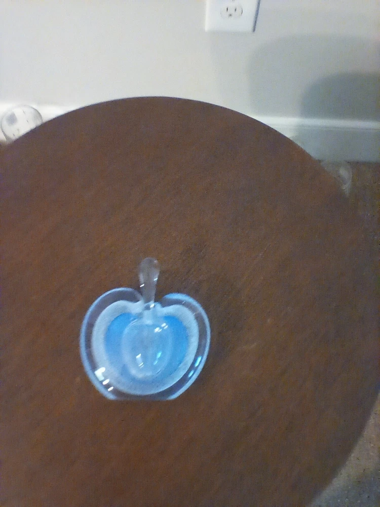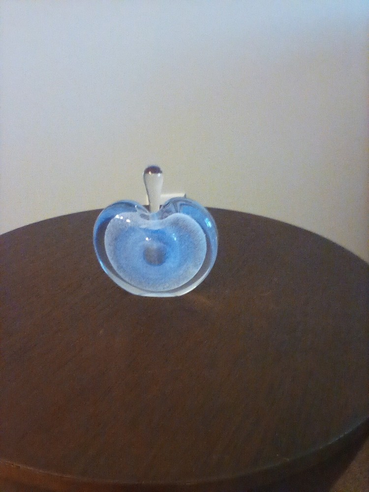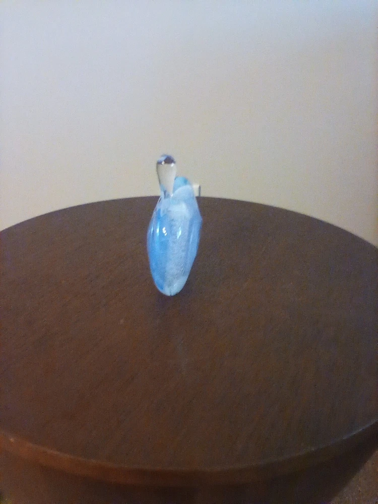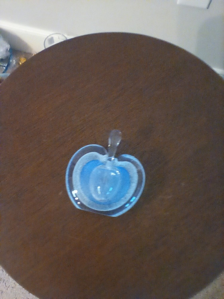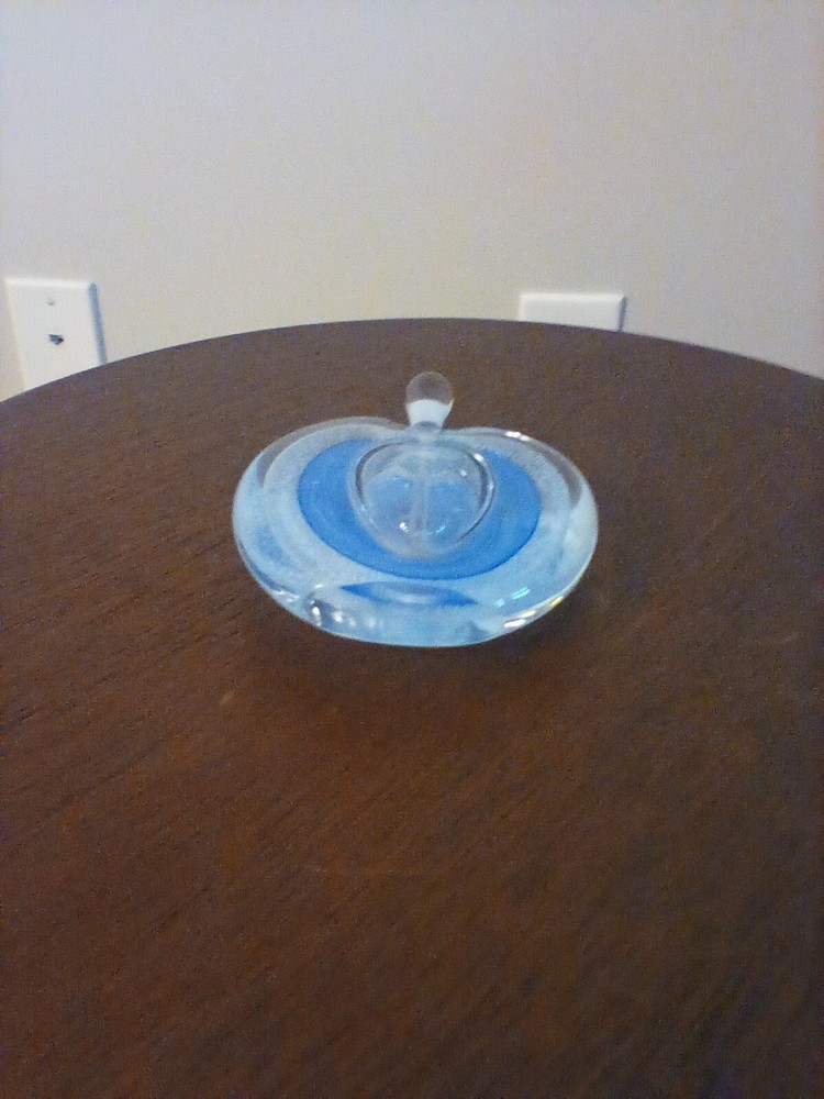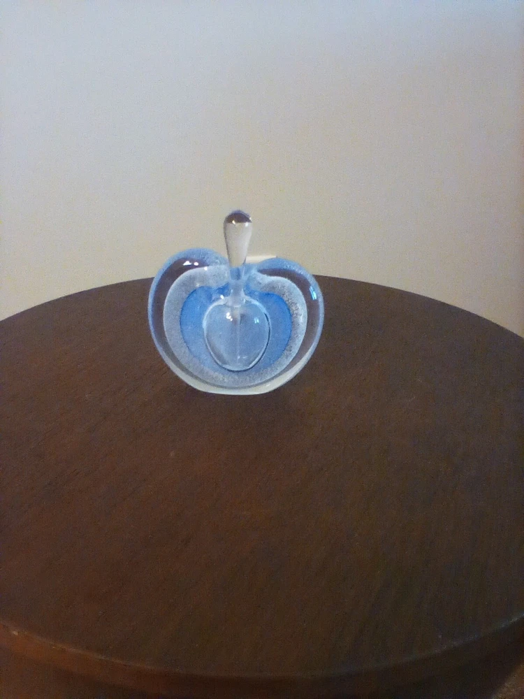 This stunning Glass Act Studio perfume bottle is a true work of art. The blue swirl design adds a touch of elegance to any vanity or collection. The heart-shaped design and stopper make it a unique and functional piece. Made by a skilled artisan, this bottle is a must-have for any perfume lover or collector. The origin of this item is unknown, adding to its mystery and allure.