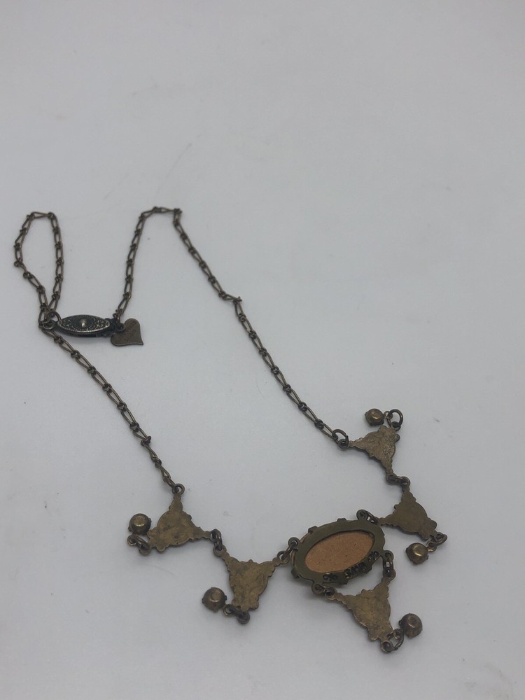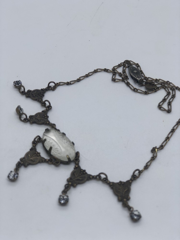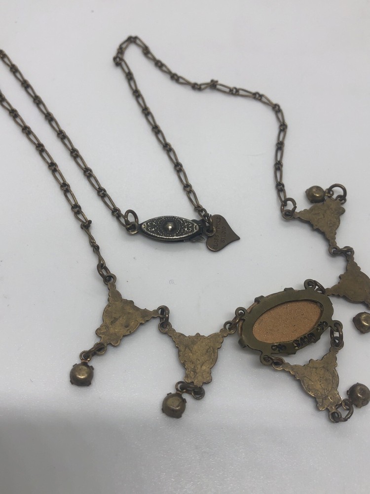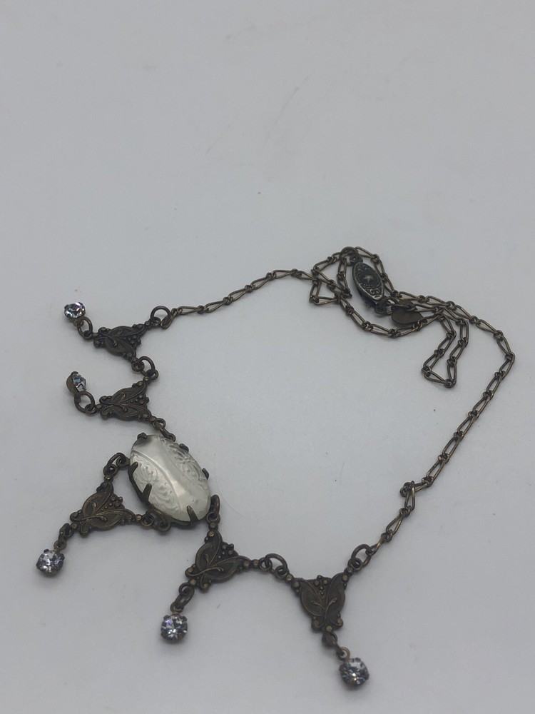 GLASS WORKS STUDIO UNIQUE MOTHER OF PEARL (OR ABALONE SHELL) 17" NECKLACE GLASS WORKS STUDIOS PRODUCED SOME OF THE MOST UNIQUE JEWELRY PIECES ! THIS 17" BRONZE NECKLACE HAS 4 DROP DOWN SECTIONS THAT ARE V SHAPED, AND HAVE BRILLIANT RHINESTONES OR CUBIC ZIRCONIAS DANGLING AT THE ENDOF EACH. THE CENTER FEATURES AN ELONGATED OVAL SHAPE MOTHER OF PEARL STONE. THIS STONE IS EXTRA SPECIAL AS IT HAS CUTWORK (ENGRAVING) IN A BANDED STYLE AT TOP AND BOTTOM OF THE OVAL AND THE CENTER SECTION BEING "FLAT". IT IS IN EXCELLENT CONDITION WITH THE HEART SHAPE GLASS WORKS STUDIO TAG ATTACHED NEAR THE UNIQUE OLD STYLE SLIDE OUT CLOSURE. Thank you for stopping by. I pack and ship each item with care and will be more than happy to combine your purchases when you buy or win more than 1 item. Please write ahead to let me know you are still bidding so that I may send you an invoice when you are ready. I am ordinarily a same day shipper whenever possible.