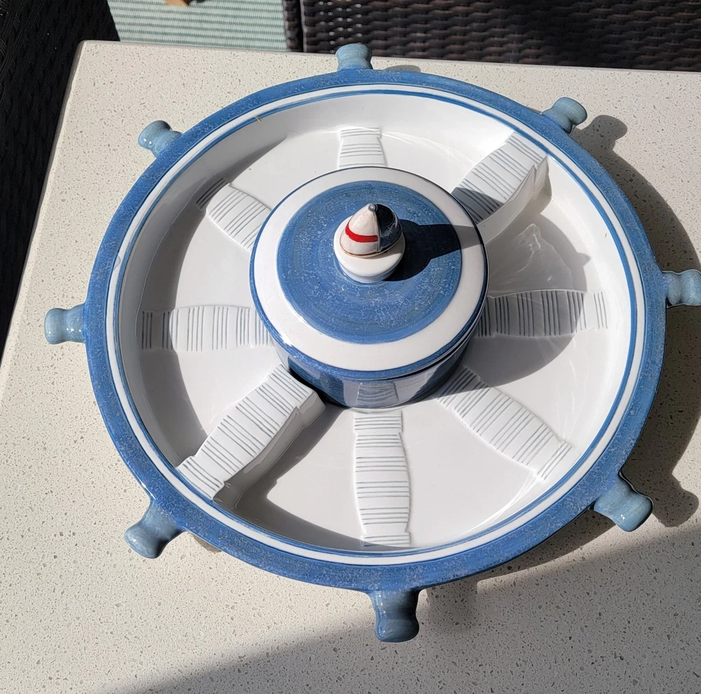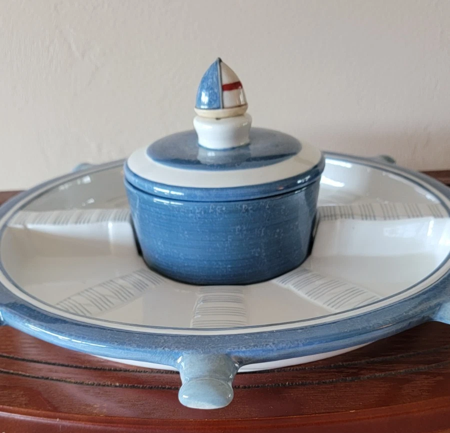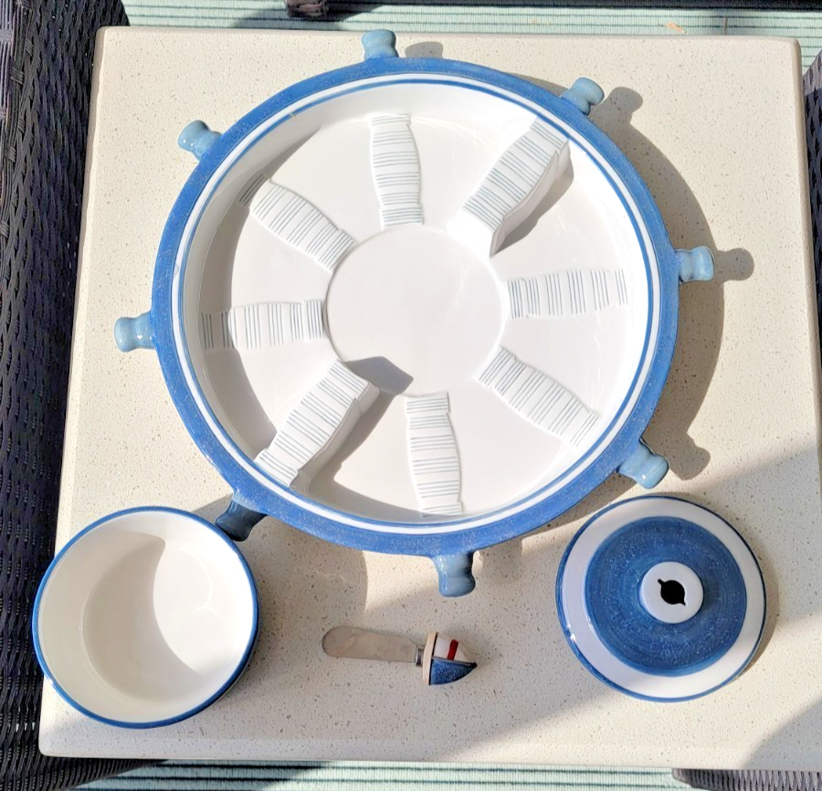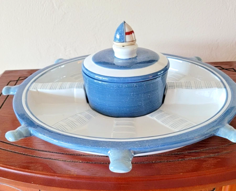 This beautiful serving tray set from GRASSLANDS ROAD is perfect for any occasion. With a nautical theme, the set includes a large round tray, four sectioned platters, dipping bowls, and knives. The tray and bowls are made of high-quality ceramic material with a glossy finish, making them easy to clean and dishwasher safe. The multicolor set is perfect for entertaining guests or for use during family dinners. The tray measures 14.5 inches in diameter, while the bowls are 4.75 inches wide. Weighing in at 4 pounds, this set is sturdy and durable. Whether you're hosting a formal dinner party or enjoying a casual meal with your loved ones, this serving tray set is sure to impress.